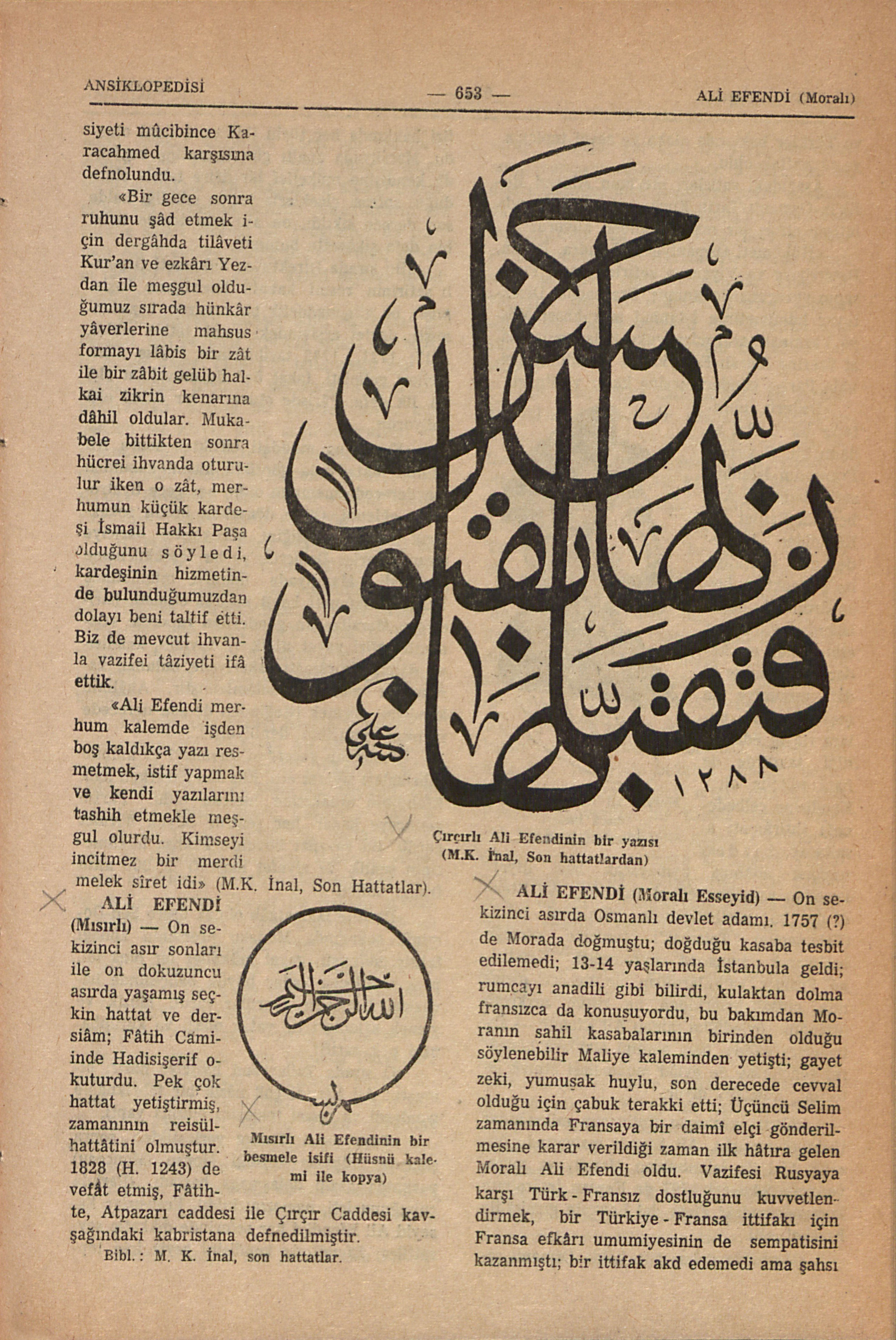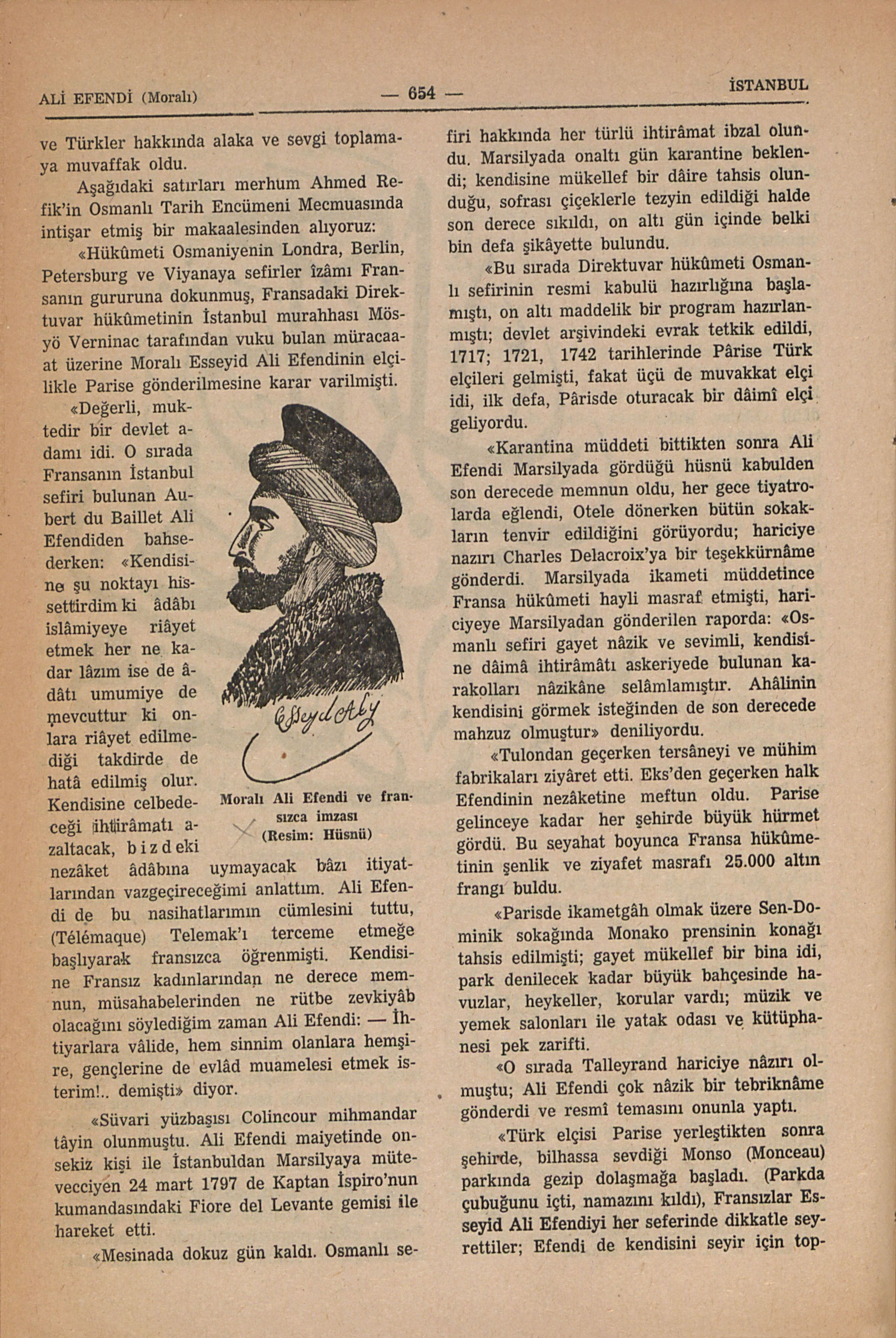 On sekizinci asırda Osmanlı devlet adamı. 1757 (?) de Morada doğmuştu; doğduğu kasaba tesbit edilemedi, 13-14 yaşlarında İstanbula geldi; rumcayı anadili gibi bilirdi, kulaktan dolma fransızca da konuşuyordu, bu bakımdan Moranın sahil kasabalarının birinden olduğu söylenebilir Maliye kaleminden yetişti; gayet zeki, yumuşak huylu, son derecede cevval olduğu için çabuk terakki etti; Üçüncü Selim zamanında Fransaya bir daimî elçi gönderilmesine karar verildiği zaman ilk hâtıra gelen Moralı Ali Efendi oldu. Vazifesi Rusyaya karşı Türk - Fransız dostluğunu kuvvetlendirmek, bir Türkiye - Fransa ittifakı için Fransa efkârı umumiyesinin de sempatisini kazanmıştı; bir ittifak akd edemedi ama şahsı ve Türkler hakkında alaka ve sevgi toplamaya muvaffak oldu. Aşağıdaki satırları merhum Ahmed Refik’in Osmanlı Tarih Encümeni Mecmuasında intişar etmiş bir makaalesinden alıyoruz: «Hükûmeti Osmaniyenin Londra, Berlin, Petersburg ve Viyanaya sefirler îzâmı Fransanın gururuna dokunmuş, Fransadaki Direktuvar hükûmetinin İstanbul murahhası Mösyö Verninac tarafından vuku bulan müracaat üzerine Moralı Esseyid Ali Efendinin elçilikle Parise gönderilmesine karar verilmişti. «Değerli, muktedir bir devlet adamı idi. O sırada Fransanın İstanbul sefiri bulunan Aubert du Baillet Ali Efendiden bahsederken: «Ke...