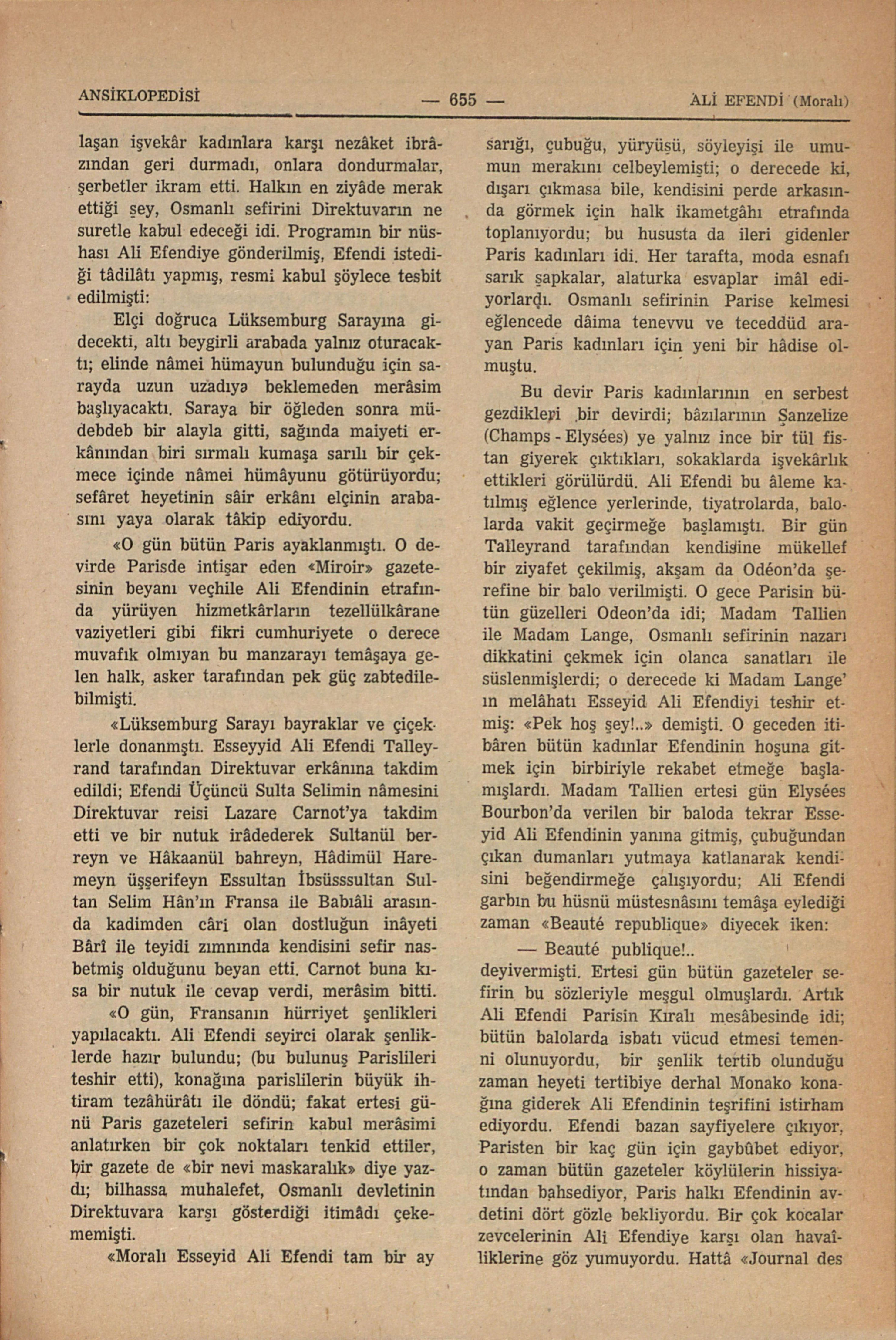On sekizinci asırda Osmanlı devlet adamı. 1757 (?) de Morada doğmuştu; doğduğu kasaba tesbit edilemedi, 13-14 yaşlarında İstanbula geldi; rumcayı anadili gibi bilirdi, kulaktan dolma fransızca da konuşuyordu, bu bakımdan Moranın sahil kasabalarının birinden olduğu söylenebilir Maliye kaleminden yetişti; gayet zeki, yumuşak huylu, son derecede cevval olduğu için çabuk terakki etti; Üçüncü Selim zamanında Fransaya bir daimî elçi gönderilmesine karar verildiği zaman ilk hâtıra gelen Moralı Ali Efendi oldu. Vazifesi Rusyaya karşı Türk - Fransız dostluğunu kuvvetlendirmek, bir Türkiye - Fransa ittifakı için Fransa efkârı umumiyesinin de sempatisini kazanmıştı; bir ittifak akd edemedi ama şahsı ve Türkler hakkında alaka ve sevgi toplamaya muvaffak oldu. Aşağıdaki satırları merhum Ahmed Refik’in Osmanlı Tarih Encümeni Mecmuasında intişar etmiş bir makaalesinden alıyoruz: «Hükûmeti Osmaniyenin Londra, Berlin, Petersburg ve Viyanaya sefirler îzâmı Fransanın gururuna dokunmuş, Fransadaki Direktuvar hükûmetinin İstanbul murahhası Mösyö Verninac tarafından vuku bulan müracaat üzerine Moralı Esseyid Ali Efendinin elçilikle Parise gönderilmesine karar verilmişti. «Değerli, muktedir bir devlet adamı idi. O sırada Fransanın İstanbul sefiri bulunan Aubert du Baillet Ali Efendiden bahsederken: «Kendisine şu noktayı hissettirdim ki âdâbı islâmiyeye riâyet etmek her ne kadar lâzım ise de âdâtı umumiye de mevcuttur ki onlara riâyet edilmediği takdirde de hatâ edilmiş olur. Kendisine celbedeceği ihtirâmatı azaltacak, bizdeki nezâket âdâbına uymayacak bâzı ittiyatlarından vazgeçireceğimi anlattım. Ali Efendi de bu nasihatlarımın cümlesini tuttu, (Télémaque) Telemak’ı terceme etmeğe başlıyarak fransızca öğrenmişti. Kendisine Fransız kadınlarından ne derece mennun, müsahabelerinden ne rütbe zevkiyâb olacağını söylediğim zaman Ali Efendi: — İhtiyarlara vâlide, hem sinnim olanlara hemşire, gençlerine de evlâd muamelesi etmek isterim!.. demişti” diyor. «Süvari yüzbaşısı Colincour mihmandar tâyin olunmuştu. Ali Efendi maiyetinde onsekiz kişi ile İstanbuldan Marsilyaya mütevecciyen 24 mart 1797 de Kaptan İspiro’nun kumandasındaki Fiore del Levante gemisi ile hareket etti. «Mesinada dokuz gün kaldı. Osmanlı sefiri hakkında her türlü ihtirâmat ibzal olundu. Marsilyada onaltı gün karantine beklendi; kendisine mükellef bir dâire tahsis olunduğu, sofrası çiçeklerle tezyin edildiği halde son derece sıkıldı, on altı gün içinde belki bin defa şikâyette bulundu. «Bu sırada Direktuvar hükûmeti Osmanlı sefirinin resmi kabulü hazırlığına başlamıştı, on altı maddelik bir program hazırlığına başlamıştı, on altı maddelik bir program hazırlanmıştı; devlet arşivindeki evrak tetkik edildi, 1717; 1721, 1742 tarihlerinde Pârise Türk elçileri gelmişti, fakat üçü de muvakkat elçi idi, ilk defa, Pârisde oturacak bir dâmî elçi geliyordu. «Karantina müddeti bittikten sonra Ali Efendi Marsilyada gördüğü hüsnü kabulden son derece memnun oldu, her gece tiyatrolarda eğlendi, Otele dönerken bütün sokakların tenvir edildiğini görüyordu; hariciye nazırı Charles Delacroix’ya bir teşekkürnâme gönderdi. Marsilyada ikameti müddetince Fransa hükûmeti hayli masraf etmişti, hariciyeye Marsilyadan gönderilen raporda: «Osmanlı sefiri gayet nâzik ve sevimli, kendisine dâimâ ihtirâmâtı askeriyede bulunan karakolları nâzikâne selâmlamıştır. Ahâlinin kendisini görmek istediğinden son derecede mahzuz olmuştur” deniliyordu. «Tulondan geçerken tersâneyi ve mühim fabrikaları ziyâret etti. Eks’den geçerken halk Efendinin nezâketine meftun oldu. Parise gelinceye kadar her şehirde büyük hürmet gördü. Bu seyahat boyunca Fransa hükûmetinin şenlik ve ziyafet masrafı 25.000 altın frangı buldu. «Parisde ikametgâh olmak üzere Sen-Dominik sokağında Monako prensinin konağı tahsis edilmişti; gayet mükellef bir bina idi, park denilecek kadar büyük bahçesinde havuzlar, heykeller, korular vardı; müzik ve yemek salonları ile yatak odası ve kütüphanesi pek zarifti. «O sırada Talleyrand hariciye nâzırı olmuştu; Ali Efendi çok nâzik bir tebriknâme gönderdi ve resmî temasını onunla yaptı. «Türk elçisi Parise yerleştikten sonra şehirde, bilhassa sevdiği Monso (Monceau) parkında gezip dolaşmağa başladı. (Parkda çubuğunu içti, namazını kıldı), Fransızlar Esseyid Ali Efendiyi her seferinde dikkatle seyrettiler; Efendi de kendisini seyir için toplaşan işvekâr kadınlara karşı nezâket ibrâzından geri durmadı, onlara dondurmalar, şerbetler ikram etti. Halkın en ziyâde merak ettiği şey, Osmanlı sefirini Direktuvarın ne suretle kabul edeceği idi. Programın bir nüshası Ali Efendiye gönderilmiş, Efendi istediği tâdilatı yapmış, resmi kabul şöylece tesbit edilmişti: Elçi doğruca Lüksemburg Sarayına gidecekti, altı beygirli arabada yalnız oturacaktı; elinde nâmei hümayun bulunduğu için sarayda uzun uzadıya beklemeden merâsim başlıyacaktı. Saraya bir öğleden sonra müdebdeb bir alayla gitti, sağında maiyeti erkânından biri sırmalı kumaşa sarılı bir çekmece içinde nâmei hümâyunu götürüyordu; sefâret heyetinin sâir erkânı elçinin arabasını yaya olarak tâkip ediyordu. «O gün bütün Paris ayaklanmıştı. O devirde Parisde intişar eden «Miroir» gazetesinin beyanı veçhile Ali Efendinin etrafında yürüyen hizmetkârların tezellülkârane vaziyetleri gibi fikri cumhuriyete o derece muvafık olmıyan bu manzarayı temâşaya gelen halk, asker tarafından pek güç zabtedilebilmişti. «Lüksemburg Sarayı bayraklar ve çiçeklerle donanmıştı. Esseyyid Ali Efendi Talleyrand tarafından Direktuvar erkânına takdim edildi; Efendi Üçüncü Sulta Selimin nâmesini D