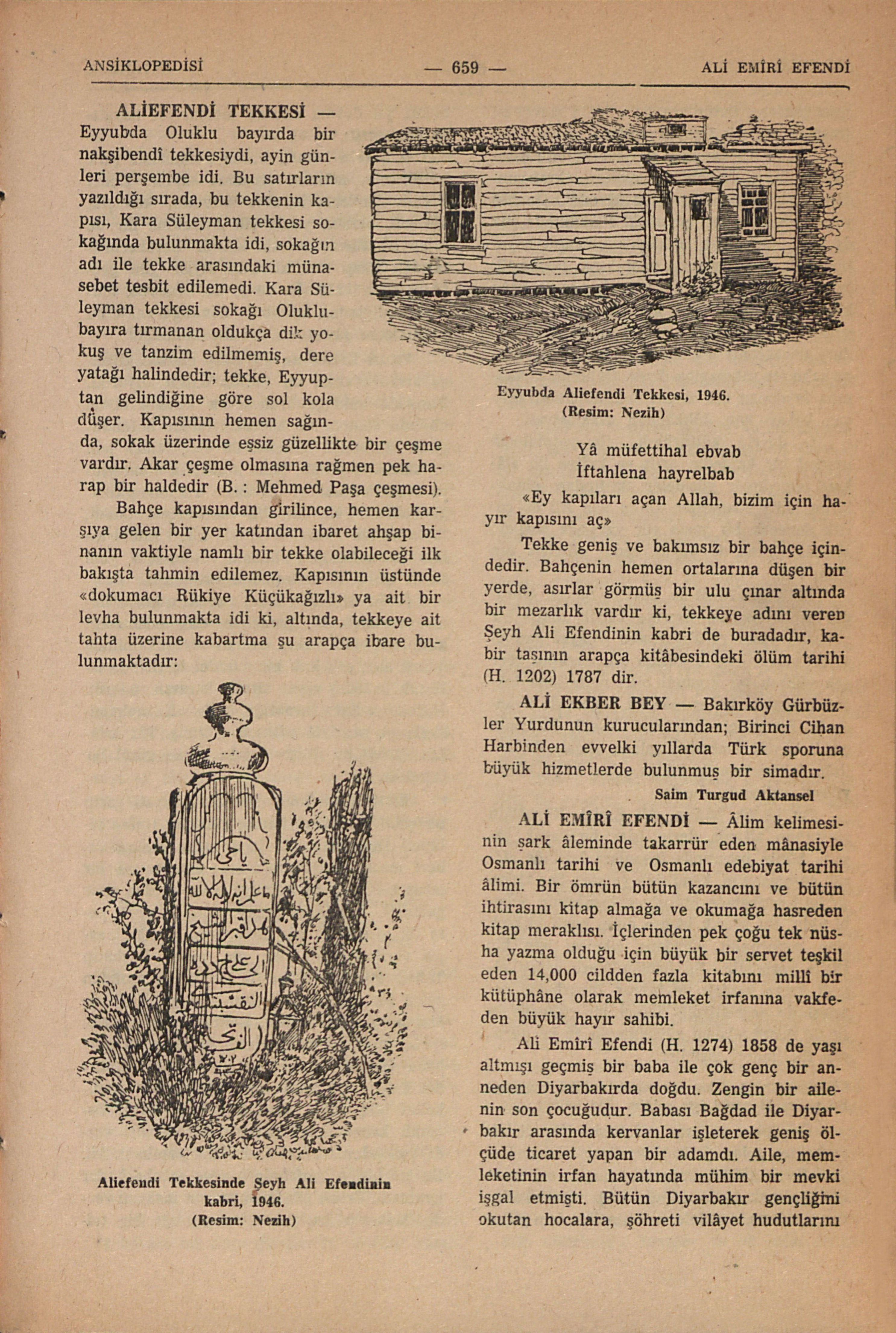 Eyyubda Oluklu hayırda bir nakşibendî tekkesiydi, ayin günleri perşembe idi. Bu satırların yazıldığı sırada, bu tekkenin kapısı, Kara Süleyman tekkesi sokağında bulunmakta idi, sokağın adı ile tekke arasındaki münasebet tesbit edilemedi. Kara Süleyman tekkesi sokağı Oluklubayıra tırmanan oldukça dik yokuş ve tanzim edilmemiş, dere yatağı halindedir; tekke, Eyyuptan gelindiğine göre sol kola düşer. Kapısının hemen sağında, sokak üzerinde eşsiz güzellikte bir çeşme vardır. Akar çeşme olmasına rağmen pek harap bir haldedir (B. : Mehmed Paşa çeşmesi). Bahçe kapısından girilince, hemen karşıya gelen bir yer katından ibaret ahşap binanın vaktiyle namlı bir tekke olabileceği ilk bakışta tahmin edilemez. Kapısının üstünde «dokumacı Rükiye Küçükağızlı” ya ait bir levha bulunmakta idi ki, altında, tekkeye ait tahta üzerine kabartma şu arapça ibare bulunmaktadır: Yâ müfettihal ebvab İftahlena hayrelbab «Ey kapıları açan Allah, bizim için hayır kapısını aç” Tekke geniş ve bakımsız bir bahçe içindedir. Bahçenin hemen ortalarına düşen bir yerde, asırlar görmüş bir ulu çınar altında bir mezarlık vardır ki, tekkeye adını veren Şeyh Ali Efendinin kabri de buradadır, kabir taşının arapça kitâbesindeki ölüm tarihi (H. 1202) 1787 dir. Eyyubda Aliefendi Tekkesi, 1946. (Resim: Nezih) Aliefendi Tekkesinde Şeyh Ali Efendinin kabri, 1946. (Resim: Nezih)