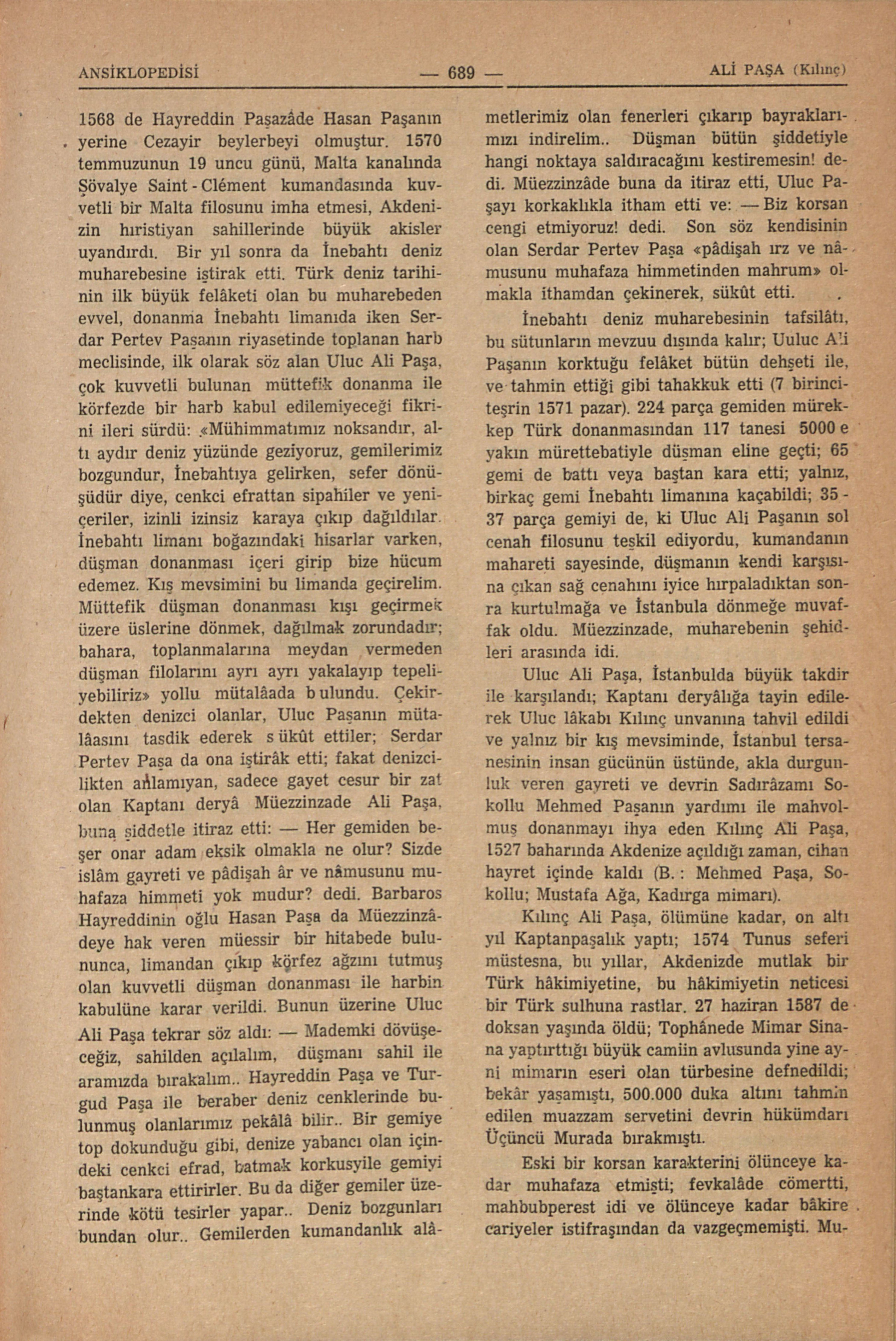1568 de Hayreddin Paşazâde Hasan Paşanın yerine Cezayir beylerbeyi olmuştur. 1570 temmuzunun 19 uncu günü, Malta kanalında Şövalye Saint - Clément kumandasında kuvvetli bir Malta filosunu imha etmesi, Akdenizin hıristiyan sahillerinde büyük akisler uyandırdı. Bir yıl sonra da İnebahtı deniz muharebesine iştirak etti. Türk deniz tarihinin ilk büyük felâketi olan bu muharebeden evvel, donanma İnebahtı limanında iken Serdar Pertev Paşanın riyasetinde toplanan harb meclisinde, ilk olarak söz alan Uluc Ali Paşa, çok kuvvetli bulunan müttefik donanma ile körfezde bir harb kabul edilemeyeceği fikrini ileri sürdü: “Mühimmatımız noksandır, altı aydır deniz yüzünde geziyoruz, gemilerimiz bozgundur, İnebahtıya gelirken, sefer dönüşüdür diye, cenkci efrattan sipahiler ve yeniçeriler, izinli izinsiz karaya çıkıp dağıldılar. İnebahtı limanı boğazındaki hisarlar varken, düşman donanması içeri girip bize hücum edemez. Kış mevsimini bu limanda geçirelim. Müttefik düşman donanması kışı geçirmek üzere üslerine dönmek, dağılmak zorundadır; bahara, toplanmalarına meydan vermeden düşman filolarını ayrı ayrı yakalayıp tepeliyebiliriz” yollu mütalâada b ulundu. Çekirdekten denizci olanlar, Uluc Paşanın mütalâasını tasdik ederek s ükût ettiler; Serdar Pertev Paşa da ona iştirâk etti; fakat denizcilikten anlamıyan, sadece gayet cesur bir zat olan Kaptanı deryâ Müezzinzade Ali Paşa, buna şiddetle itiraz etti: — Her gemiden beşer onar adam eksik olmakla ne olur? Sizde islâm gayreti ve pâdişah âr ve nâmusunu muhafaza himmeti yok mudur? dedi. Barbaros Hayreddinin oğlu Hasan Paşa da Müezzinzâdeye hak veren müessir bir hitabede bulununca, limandan çıkıp körfez ağzını tutmuş olan kuvvetli düşman donanması ile harbin kabulüne karar verildi. Bunun üzerine Uluc Ali Paşa tekrar söz aldı: — Mademki dövüşeceğiz, sahilden açılalım, düşmanı sahil ile aramızda bırakalım.. Hayreddin Paşa ve Turgud Paşa ile beraber deniz cenklerinde bulunmuş olanlarımız pekâlâ bilir.. Bir gemiye top dokunduğu gibi, denize yabancı olan içindeki cenkci efrad, batmak korkusyile gemiyi baştankara ettirirler. Bu da diğer gemiler üzerinde kötü tesirler yapar.. Deniz bozgunları bundan olur. Gemilerden kumandanlık alâmetlerimiz olan fenerleri çıkarıp bayraklarımızı indirelim.. Düşman bütün şiddetiyle hangi noktaya saldıracağını kestiremesin! dedi. Müezzinzâde buna da itiraz etti, Uluc Paşayı korkaklıkla itham etti ve: — Biz korsan cengi etmiyoruz! dedi. Son söz kendisinin olan Serdar Pertev Paşa “pâdişah ırz ve nâmusunu muhafaza himmetinden mahrum” olmakla ithamdan çekinerek, sükût etti.