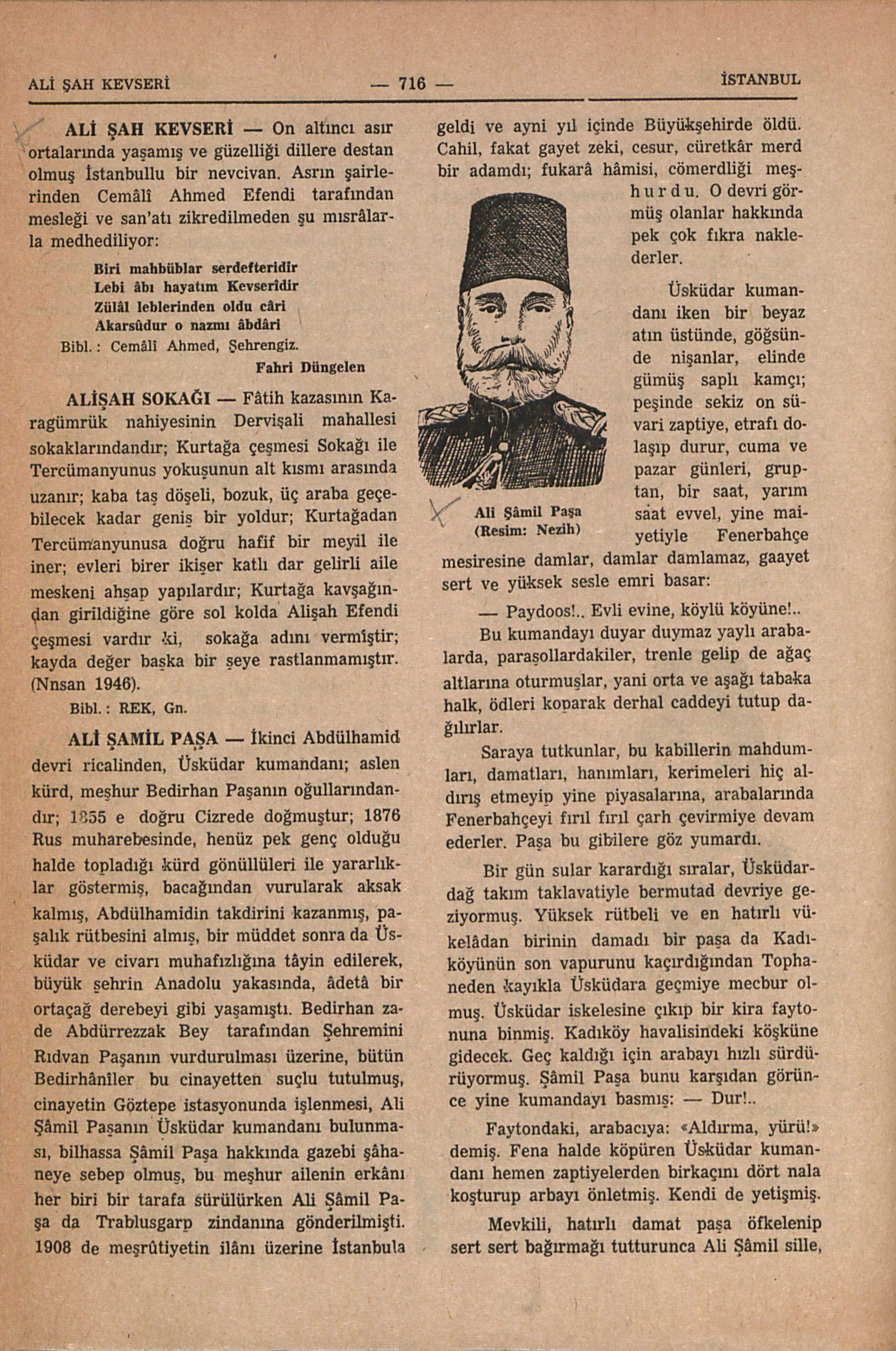 İkinci Abdülhamid devri ricalinden, Üsküdar kumandanı; aslen kürd, meşhur Bedirhan Paşanın oğullarındandır; 1855 e doğru Cizrede doğmuştur; 1876 Rus muharebesinde, henüz pek genç olduğu halde topladığı kürd gönüllüleri ile yararlıklar göstermiş, bacağından vurularak aksak kalmış, Abdülhamidin takdirini kazanmış, paşalık rütbesini almış, bir müddet sonra da Üsküdar ve civarı muhafızlığına tâyin edilerek, büyük şehrin Anadolu yakasında, âdetâ bir ortaçağ derebeyi gibi yaşamıştı. Bedirhan zade Abdürrezzak Bey tarafından Şehremini Rıdvan Paşanın vurdurulması üzerine, bütün Bedirhânîler bu cinayetten suçlu tutulmuş, cinayetin Göztepe istasyonunda işlenmesi, Ali Şâmil Paşanın Üsküdar kumandanı bulunması, bilhassa Şâmil Paşa hakkında gazebi şâhaneye sebep olmuş, bu meşhur ailenin erkânı her biri bir tarafa sürülürken Ali Şâmil Paşa da Trablusgarp zindanına gönderilmişti. 1908 de meşrutiyetin ilânı üzerine İstanbula geldi ve ayni yıl içinde Büyükşehirde öldü. Cahil, fakat gayet zeki, cesur, cüretkâr merd bir adamdı; fukarâ hâmisi, cömerdliği meşhurdu. O devri görmüş olanlar hakkında pek çok fıkra naklederler. Üsküdar kumandanı iken bir beyaz atın üstünde, göğsünde nişanlar, elinde gümüş saplı kamçı; peşinde sekiz on süvari zaptiye, etrafı dolaşıp durur, cuma ve pazar günleri, gruptan, bir saat, yarım saat evvel, yine maiyetiyle Fenerbahçe mesiresine damlar, damlar damlamaz, gaayet sert ve yüksek sesle emri basar: — Paydoos!.. Evli evine, köylü köyüne!.. Bu kumandayı duyar duymaz yaylı arabalarda, paraşollardakiler, trenle gelip de ağaç altlarına oturmuşlar, yani orta ve aşağı tabaka halk, ödleri koparak derhal caddeyi tutup dağılırlar. Saraya tutkunlar, bu kabillerin mahdumları, damatları, hanımları, kerimeleri hiç aldırış etmeyip yine piyasalarına, arabalarında Fenerbahçeyi fırıl fırıl çarh çevirmiye devam ederler. Paşa bu gibilere göz yumardı. Bir gün sular karardığı sıralar, Üsküdardağ takım taklavatiyle bermutad devriye geziyormuş. Yüksek rütbeli ve en hatırlı vükelâdan birinin damadı bir paşa da Kadıköyünün son vapurunu kaçırdığından Tophaneden kayıklı Üsküdara geçmiye mecbur olmuş. Üsküdar iskelesine çıkıp bir kira faytonuna binmiş. Kadıköy havalisindeki köşküne gidecek. Geç kaldığı için arabayı hızlı sürüyormuş. Şâmil Paşa bunu karşıdan görünce yine kumandayı basmış: — Dur!.. Faytondaki, arabacıya: “Aldırma, yürü!” demiş. Fena halde köpüren Üsküdar kumandanı hemen zaptiyelerden birkaçını dört nala koşturup arbayı önletmiş. Kendi de yetişmiş. Mevkili, hatırlı damat paşa öfkelenip sert sert bağırmağı tutturunca Ali Şâmil sille, yumruk, kırbaç bir âlâ pastırmasını çıkarmaz mı? Sultan Hamidden başka kimseden pervası yok. Damat paşanın yakasına yapışmış, bırakmıypor da bırakmıyor. Hem dayağı atmış, hem de: “özür dile, eteğimi öp de öyle salıvereyim” diye terter tepiniyor. Yanında, kafile ile beraber, 10 yaşında Selâh adında bir oğlu da Midillide; çocuk: “Padişah başı için babamın eteğini öpeceksin!” demez mi? Artık bu söze akar sular durur. Dayağı yiyen paşa, üstelik bir de etek öpmüş ve yakasını kurtarmış. Bu vak’a uydurma değildir; o vakitler ortlığa şayi olmuş, ağızdan ağıza nakledilerek herkes duymuştu. Ali Şâmil paşanın evi Kadıköyünde, Hünkâr imamı cihetinde, tren yoluna karşı idi. Bahsettiğimiz oğlu Selâh aradan çok geçmeden evin bahçesindeki kuyuya düşerek boğulmuştu. Diğer oğlu Ubeyid Şâmil diş doktorudur, muayenehanesi Kadıköyünde pazar yolundadır (1946). Sermet Muhtar Alus Ali Şâmil Paşa (Resim: Nezih)