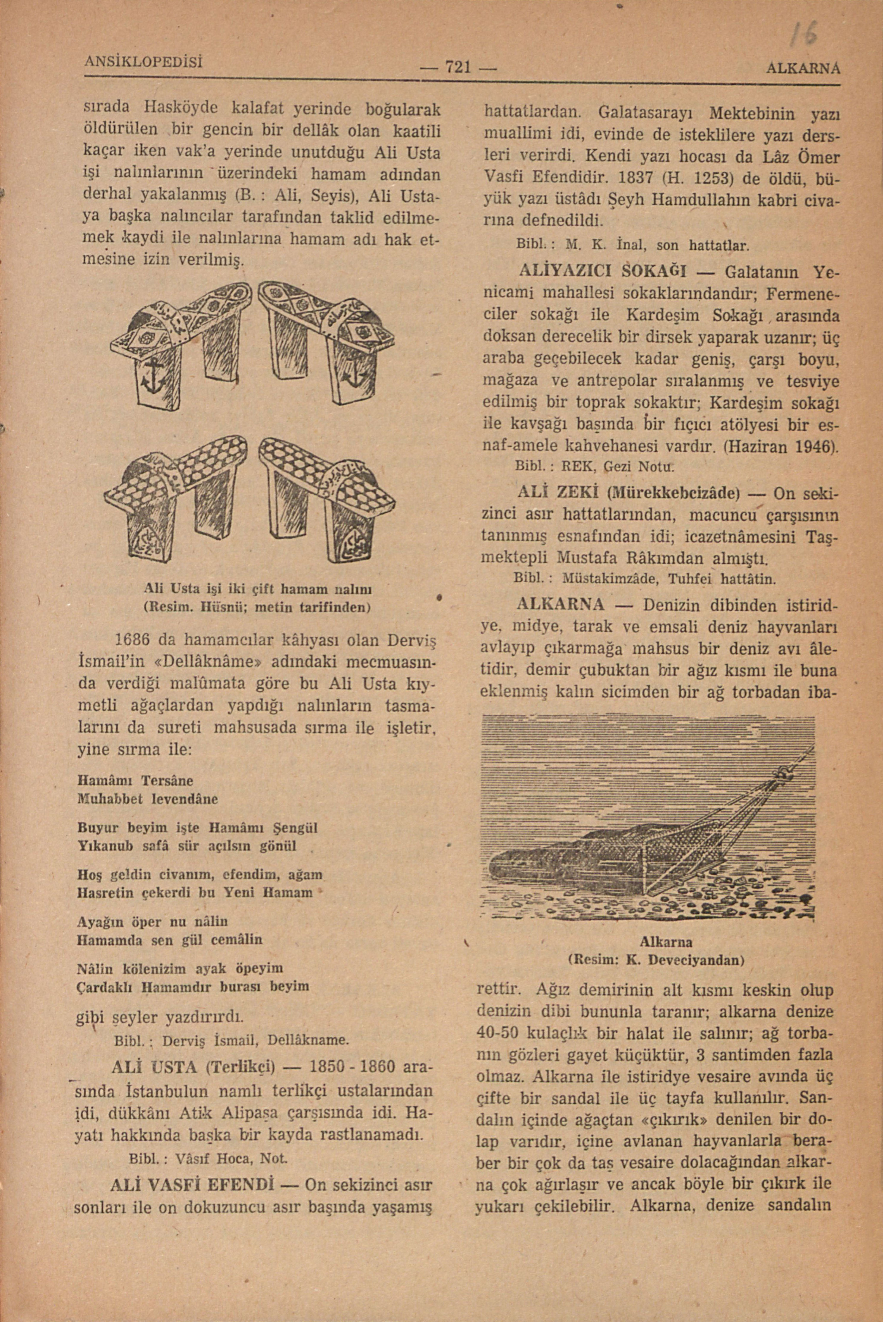 Onyedinci asır sonlarında hamam nalını yapmakla meşhur bir sanatkâr olub dükkânı Unkapanında idi; bilhassa namlı ve büyük çarşı hamamlarının kibardan, semtin mûteberanından, ulemâ ve şuerâdan olan müşterilerine mahsus şimşir ve abanos nalınlar yapar, üzerlerini türlü nakışlar, sadef ve gümüş kakmalarla tezyin edermiş; âdi ve âlâ, hamamcıların sipâriş üzerine yaptırdıkları bütün nalınların üzerine de aid olduğu hamamın adını hak edermiş. Bir ara yazı ayak altına geliyor diye dedi kodu olmuş, “bid’atdir” diye men etmeğe kalkmışlar, o sırada Hasköyde kalafat yerinde boğularak öldürülen bir gencin bir dellâk olan kaatili kaçar iken vak’a yerinde unutduğu Ali Usta işi nalınlarının üzerindeki hamam adından derhal yakalanmış (B. : Ali, Seyis), Ali Ustaya başka nalıncılar tarafından taklid edilmemek kaydi ile nalınlarına hamam adı hak etmesine izin verilmiş.