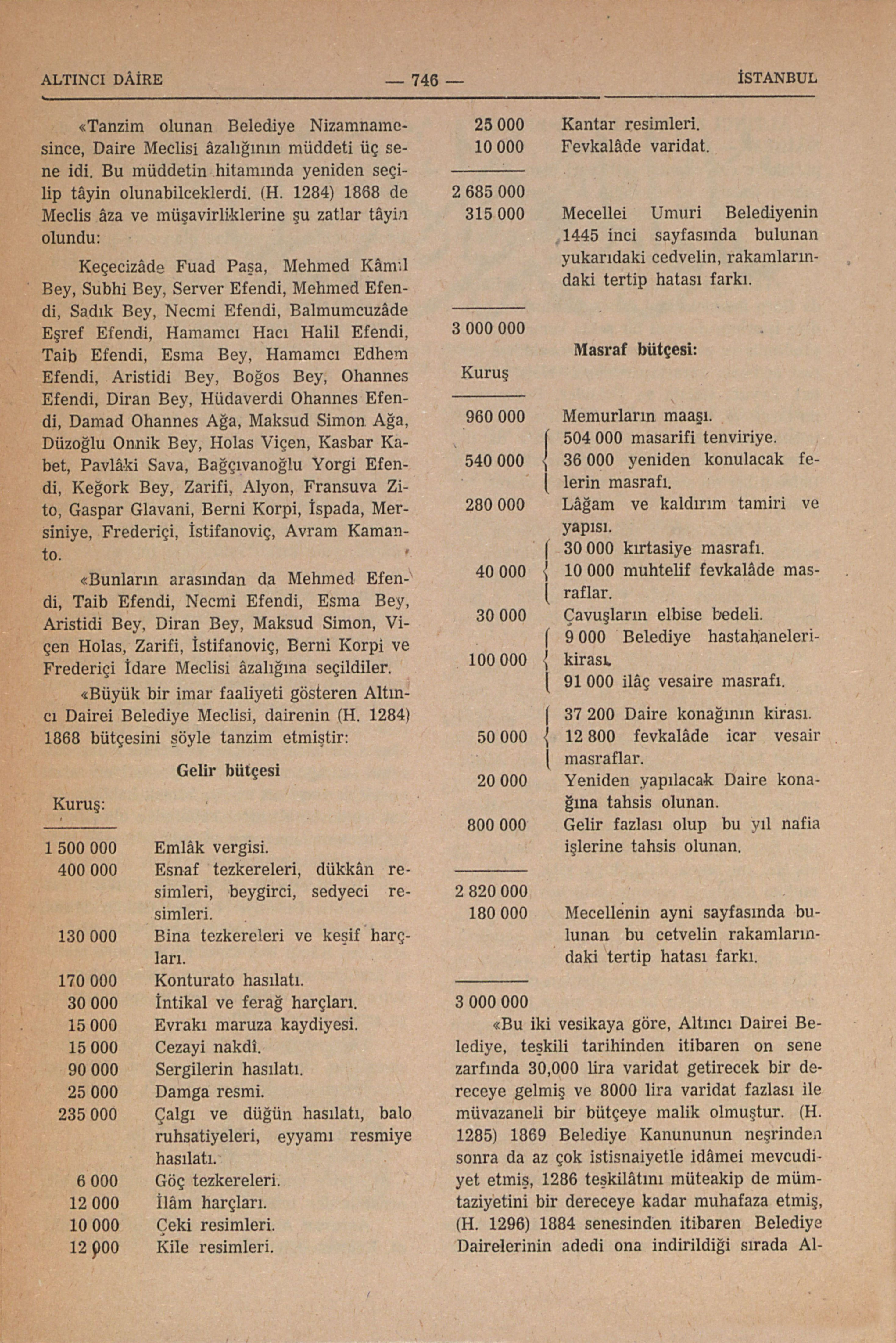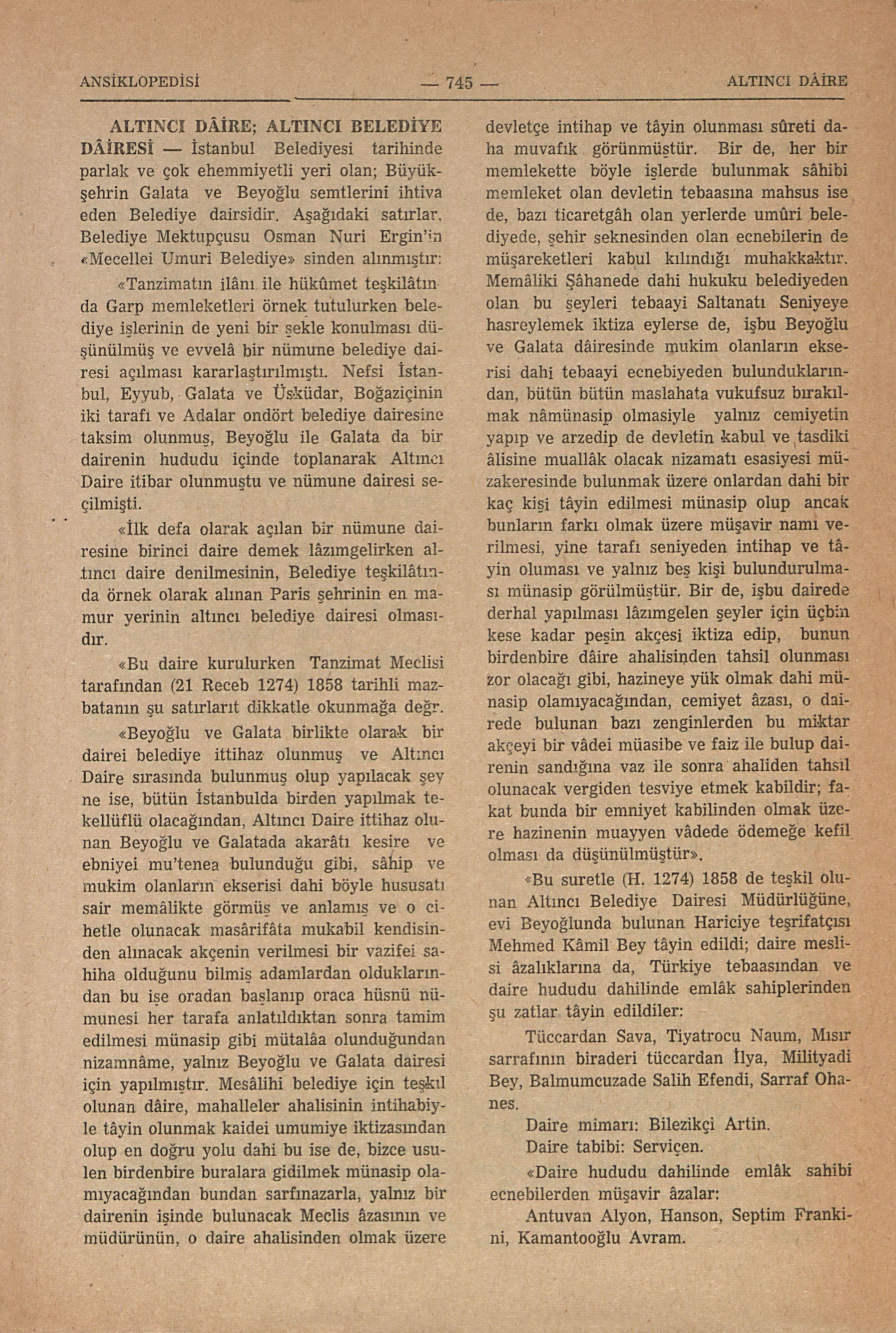 İstanbul Belediyesi tarihinde parlak ve çok ehemmiyetli yeri olan; Büyükşehrin Galata ve Beyoğlu semtlerini ihtiva eden Belediye dairsidir. Aşağıdaki satırlar, Belediye Mektupçusu Osman Nuri Ergin’in “Mecellei Umuri Belediye” sinden alınmıştır: “Tanzimatın ilânı ile hükûmet teşkilâtında Garp memleketleri örnek tutulurken belediye işlerinin de yeni bir şekle konulması düşünülmüş ve evvelâ bir nümune belediye dairesi açılması kararlaştırılmıştı. Nefsi İstanul, Eyyub, Galata ve Üsküdar, Boğaziçinin iki tarafı ve Adalar ondört belediye dairesine taksim olunmuş, Beyoğlu ile Galata da bir dairenin hududu içinde toplanarak Altıncı Daire itibar olunmuştu ve nümune dairesi seçilmişti. “İlk defa olarak açılan bir nümune dairesine birinci daire demek lâzımgelirken altıncı daire denilmesinin, Belediye teşkilâtında örnek olarak alınan Paris şehrinin en mamur yerinin altıncı belediye dairesi olmasıdır. “Bu daire kurulurken Tanzimat Meclisi tarafından (21 Receb 1274) 1858 tarihli mazbatanın şu satırları dikkatle okunmağa değr. “Beyoğlu ve Galata birlikte olarak bir dairei belediye ittihaz olunmuş ve Altıncı Daire sırasında bulunmuş olup yapılacak şey ne ise, bütün İstanbulda birden yapılmak tekellüflü olacağından, Altıncı Daire ittihaz olunan Beyoğlu ve Galatada akarâtı kesire ve ebniyei mu’tenea bulunduğu gibi, sâhip ve mukim olanların ekserisi dahi böyle hususatı sair memâlikte görmüş ve anlamış ve o cihetle olunacak masârifâta mukabil kendisinden alınacak akçenin verilmesi bir vazifei sahiha olduğunu bilmiş adamlardan olduklarından bu işe oradan başlanıp oraca hüsnü nümunesi her tarafa anlatıldıktan sonra tamim edilmesi münasip gibi mütalâa olunduğundan nizamnâme, yalnız Beyoğlu ve Galata dairesi için yapılmıştır. Mesâlihi belediye için teşkıl olunan dâire, mahalleler ahalisinin intihabiyle tâyin olunmak kaidei umumiye iktizasından olup en doğru yolu dahi bu ise de, bizce usulen birdenbire buralara gidilmek münasip olamıyacağından bundan sarfınazarla, yalnız bir dairenin işinde bulunacak Meclis âzasının ve müdürünün, o daire ahalisinden olmak üzere devletçe intihap ve tâyin olunması sûreti daha muvafık görünmüştür. Bir de, her bir memlekette böyle işlerde bulunmak sâhibi memleket olan devletin tebaasına mahsus ise de, bazı ticaretgâh olan yerlerde umûri belediyede, şehir seknesinden olan ecnebilerin de müşareketleri kabul kılındığı muhakkaktır. Memâliki Şâhanede dahi hukuku belediyeden olan bu şeyleri tebaayi Saltanatı Seniyeye hasreylemek iktiza eylerse de, işbu Beyoğlu ve Galata dairesinde mukim olanların ekserisi dahi tebaayi ecnebiyeden bulunduklarından, bütün bütün maslahata vukufsuz bırakılmak nâmünasip olmasiyle yalnız cemiyetin yapıp ve arzedip de devletin kabul ve tasdiki âlisine muallâk olacak nizamatı esasiyesi müzakeresinde bulunmak üzere onlardan dahi bir kaç kişi tâyin edilmesi münasip olup ancak bunların farkı olmak üzere müşavir namı verilmesi, yine tarafı seniyeden intihap ve tâyin oluması ve yalnız beş kişi bulundurulması münasip görülmüştür. Bir de, işbu dairede derhal yapılması lâzımgelen şeyler için üçbin kese kadar peşin akçesi iktiza edip, bunun birdenbire dâire ahalisinden tahsil olunması zor olacağı gibi, hazineye yük olmak dahi münasip olamıyacağından, cemiyet âzası, o dairede bulunan bazı zenginlerden bu miktar akçeyi bir vâdei müasibe ve faiz ile bulup dairenin sandığına vaz ile sonra ahaliden tahsil olunacak vergiden tesviye etmek kabildir; fakat bunda bir emniyet kabilinden olmak üzere hazinenin muayyen vâdede ödemeğe kefil olması da düşünülmüştür”. “Bu suretle (H. 1274) 1858 de teşkil olunan Altıncı Belediye Dairesi Müdürlüğüne, evi Beyoğlunda bulunan Hariciye teşrifatçısı Mehmed Kâmil Bey tâyin edildi; daire meslisi âzalıklarına da, Türkiye tebaasından ve daire hududu dahilinde emlâk sahiplerinden şu zatlar tâyin edildiler: Tüccardan Sava, Tiyatrocu Naum, Mısır sarrafının biraderi tüccardan İlya, Milityadi Bey, Balmumcuzade Salih Efendi, Sarraf Ohanes. Daire mimarı: Bilezikçi Artin. Daire tabibi: Serviçen. “Daire hududu dahilinde emlâk sahibi ecnebilerden müşavir âzalar: Antuvan Alyon, Hanson, Septim Frankini, Kamantooğlu Avram. “Tanzim olunan Belediye Nizamnamesince, Daire Meclisi âzalığının müddeti üç sene idi. Bu müddetin hitamında yeniden seçilip tâyin olunabilceklerdi. (H. 1284) 1868 de Meclis âza ve müşavirliklerine şu zatlar tâyin olundu: Keçecizâde Fuad Paşa, Mehmed Kâmil Bey, Subhi Bey, Server Efendi, Mehmed Efendi, Sadık Bey, Necmi Efendi, Balmumcuzâde Eşref Efendi, Hamamcı Hacı Halil Efendi, Taib Efendi, Esma Bey, Hamamcı Edhem Efendi, Aristidi Bey, Boğos Bey, Ohannes Efendi, Diran Bey, Hüdaverdi Ohannes Efendi, Damad Ohannes Ağa, Maksud Simon Ağa, Düzoğlu Onnik Bey, Holas Viçen, Kasbar Kabet, Pavlâki Sava, Bağçıvanoğlu Yorgi Efendi, Keğork Bey, Zarifi, Alyon, Fransuva Zito, Gaspar Glavani, Berni Korpi, İspada, Mersiniye, Frederiçi, İstifanoviç, Avram Kamanto. “Bunların arasından da Mehmed Efendi, Taib Efendi, Necmi Efendi, Esma Bey, Aristidi Bey, Diran Bey, Maksud Simon, Viçen Holas, Zarifi, İstifanoviç, Berni Korpi ve Frederiçi İdaresi Meclisi âzalığına seçildiler. “Büyük bir imar faaliyeti gösteren Altıncı Dairei Belediye Meclisi, dairenin (H. 1284) 1868 bütçesini şöyle tanzim etmiştir: Gelir bütçesi Kuruş: 1 500 000 Emlâk vergisi. 400 000 Esnaf tezkereleri, dükkân resimleri, beygirci, sedyeci resimleri. 130 000 Bina tezkereleri ve keşif harçları. 170 000 Konturato hasılatı. 30 000 İntikal ve ferağ harçları. 15 000 Evrakı maruza kaydiyesi. 15 000 Cezayi nakdî. 90 000 Sergilerin hasılatı. 25 000 Damga resmi. 235 000 Çalgı ve dü
