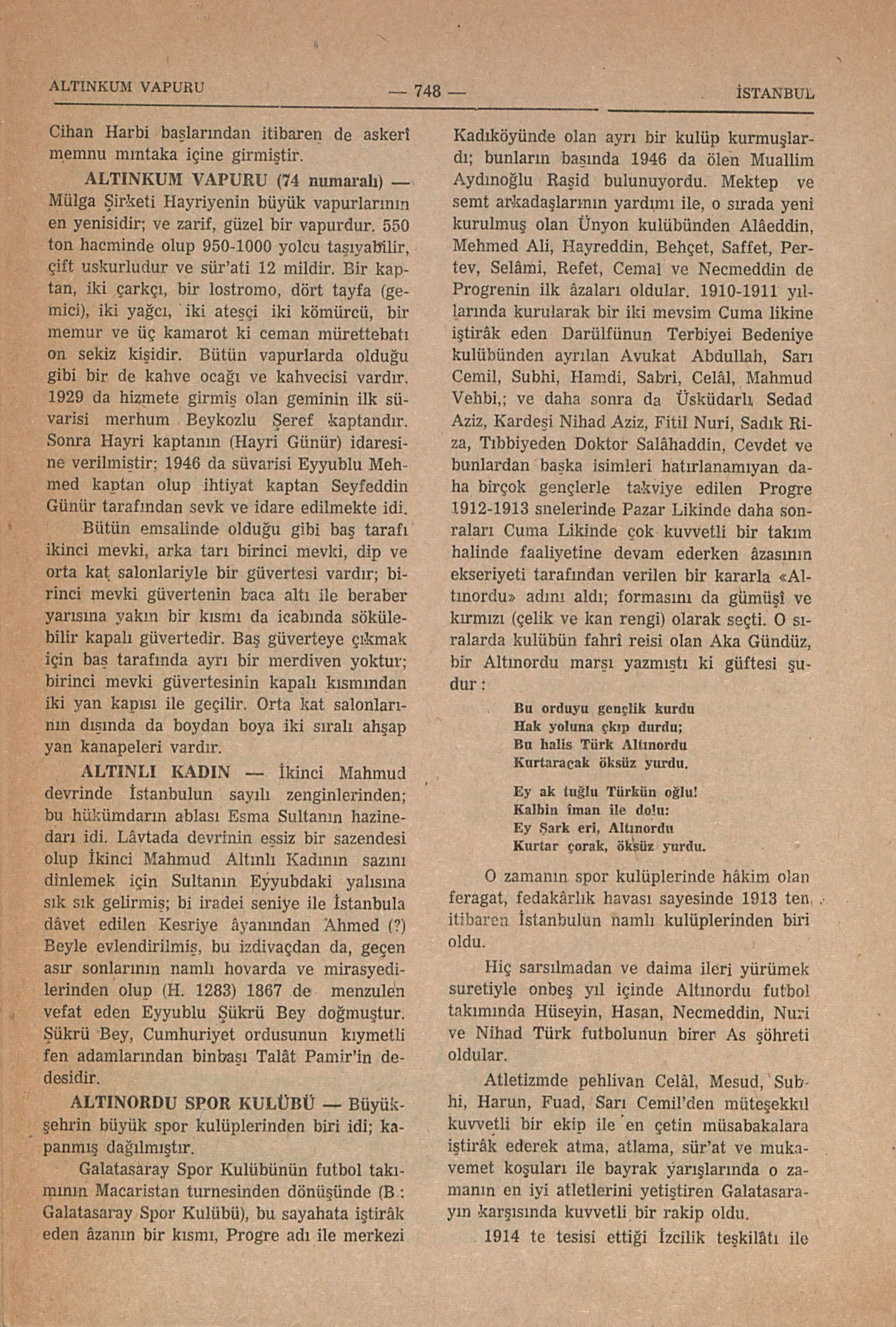 Mülga Şirketi Hayriyenin büyük vapurlarının en yenisidir; ve zarif, güzel bir vapurdur. 550 ton hacminde olup 950-1000 yolcu taşıyabilir, çift uskurludur ve sür’ati 12 mildir. Bir kaptan, iki çarkçı, bir lostromo, dört tayfa (gemici), iki yağcı, iki ateşçi iki kömürcü, bir memur ve üç kamarot ki ceman mürettebatı on sekiz kişidir. Bütün vapurlarda olduğu gibi bir de kahve ocağı ve kahvecisi vardır. 1929 da hizmete girmiş olan geminin ilk süvarisi merhum Beykozlu Şeref kaptandır. Sonra Hayri kaptanın (Hayri Günür) idaresine verilmiştir; 1946 da süvarisi Eyyublu Mehmed kaptan olup ihtiyat kaptan Seyfeddin Günür tarafından sevk ve idare edilmekte idi. Bütün emsalinde olduğu gibi baş tarafı ikinci mevki, arka tarafı birinci mevki, dip ve orta kat salonlariyle bir güvertesi vardır; birinci mevki güvertenin baca altı ile beraber yarısına yakın bir kısmı da icabında sökülebilir kapalı güvertedir. Baş güverteye çıkmak için baş tarafında ayrı bir merdiven yoktur; birinci mevki güvertesinin kapalı kısmından iki yan kapısı ile geçilir. Orta kat salonlarının dışında da boydan boya iki sıralı ahşap yan kanapeleri vardır. 74 numaralı Altınkum Vapuru (Resim: Behçet)