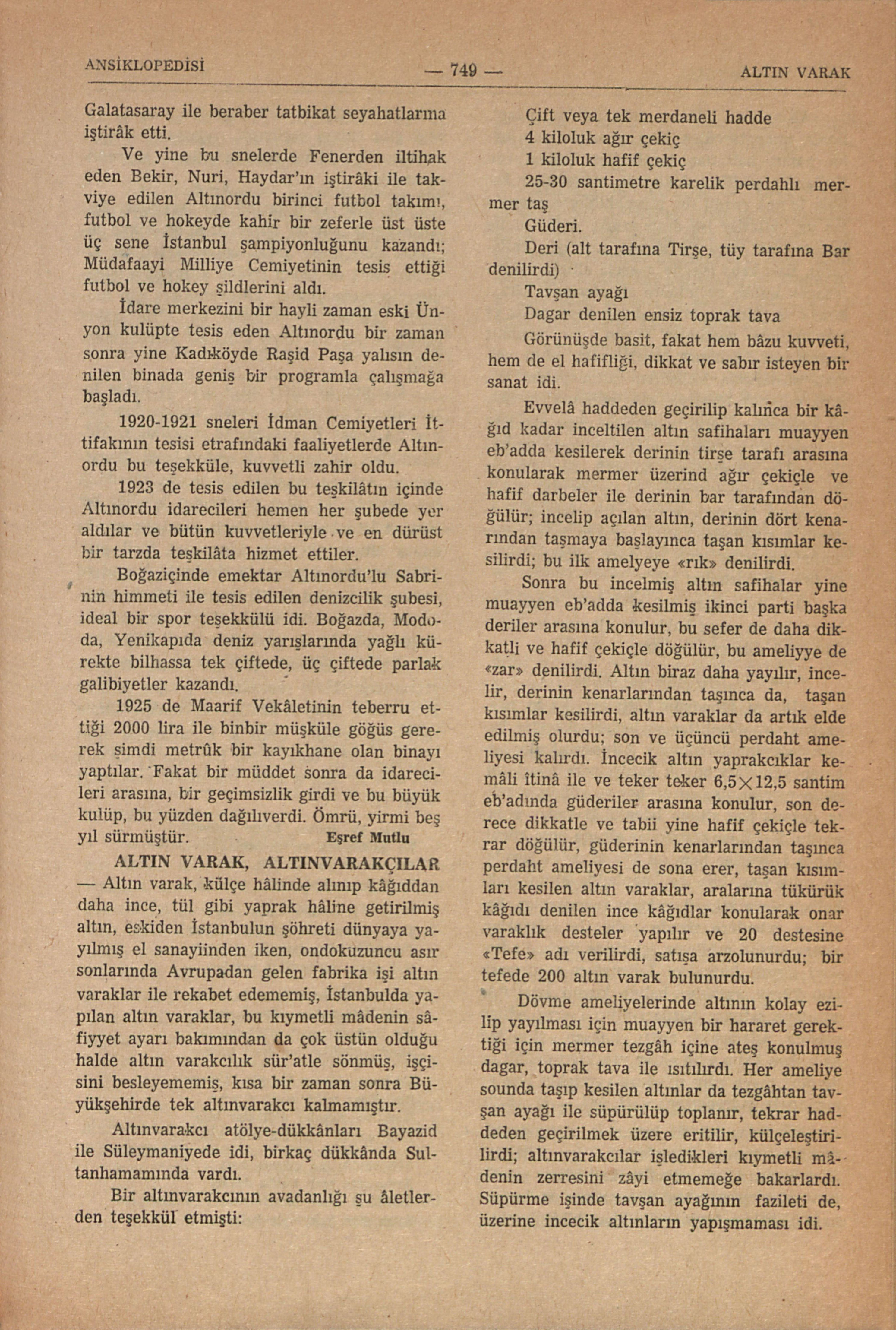 Ve yine bu snelerde Fenerden iltihak eden Bekir, Nuri, Haydar’ın iştirâki ile takviye edilen Altınordu birinci futbol takımı, futbol ve hokeyde kahir bir zeferle üst üste üç sene İstanbul şampiyonluğunu kazandı; Müdafaayi Milliye Cemiyetinin tesis ettiği futbol ve hokey şildlerini aldı.