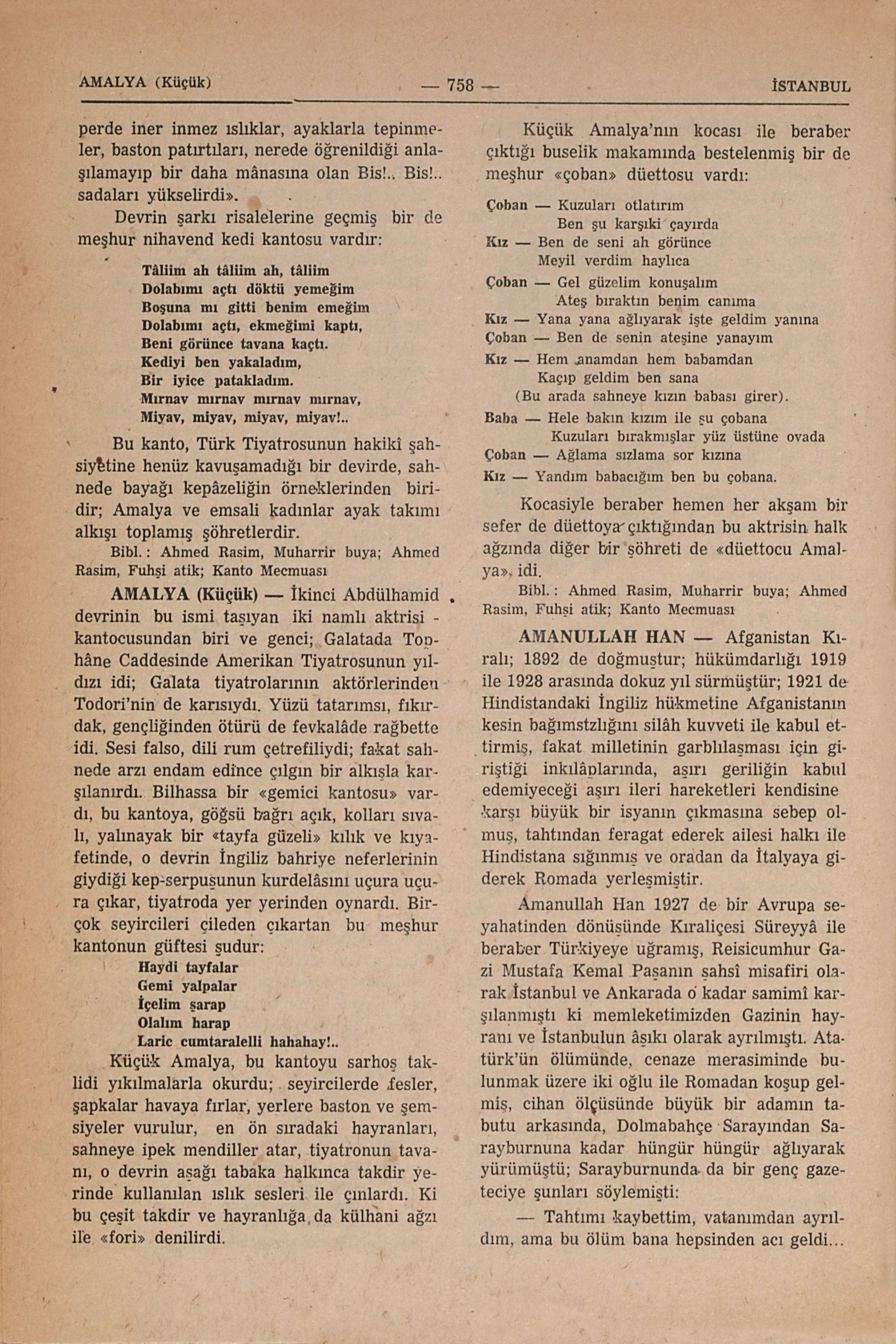 Küçük Amalya, bu kantoyu sarhoş taklidi yıkılmalarla okurdu; seyircilerde fesler, şapkalar havaya fırlar, yerlere baston ve şemsiyeler vurulur, en ön sıradaki hayranları, sahneye ipek mendiller atar, tiyatronun tavanı, o devrin aşağı tabaka halkınca takdir yerinde kullanılan ıslık sesleri ile çınlardı. Ki bu çeşit takdir ve hayranlığa da külhani ağzı ile “fori” denilirdi.