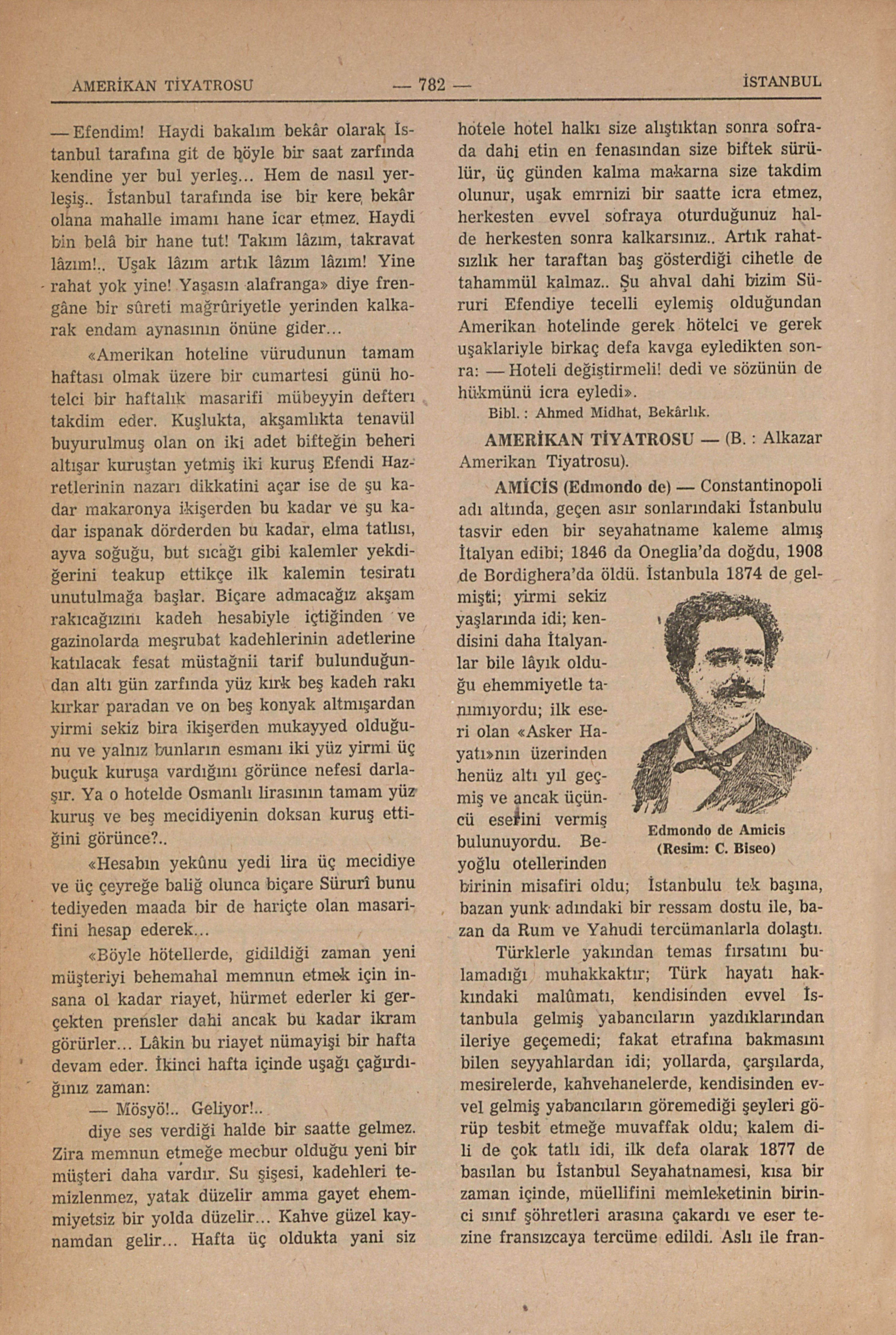 “Amerikan hoteline vürudunun tamam haftası olmak üzere bir cumartesi günü hotelci bir haftalık masarifi mübeyyin defterı takdim eder. Kuşlukta, akşamlıkta tenavül buyurulmuş olan on iki adet bifteğin beheri altışar kuruştan yetmiş iki kuruş Efendi Hazretlerinin nazarı dikkatini açar ise de şu kadar makaronya ikişerden bu kadar ve şu kadar ispanak dörderden bu kadar, elma tatlısı, ayva soğuğu, but sıcağı gibi kalemler yekdiğerini teakup ettikçe ilk kalemin tesiratı unutulmağa başlar. Biçare admacağız akşam rakıcağızını kadeh hesabiyle içtiğinden ve gazinolarda meşrubat kadehlerinin adetlerine katılacak fesat müstağnii tarif bulunduğundan altı gün zarfında yüz kırk beş kadeh rakı kırkar paradan ve on beş konyak altmışardan yirmi sekiz bira ikişerden mukayyed olduğunu ve yalnız bunların esmanı iki yüz yirmi üç buçuk kuruşa vardığını görünce nefesi darlaşır. Ya o hotelde Osmanlı lirasının tamam yüz kuruş ve beş mecidiyenin doksan kuruş ettiğini görünce?..
