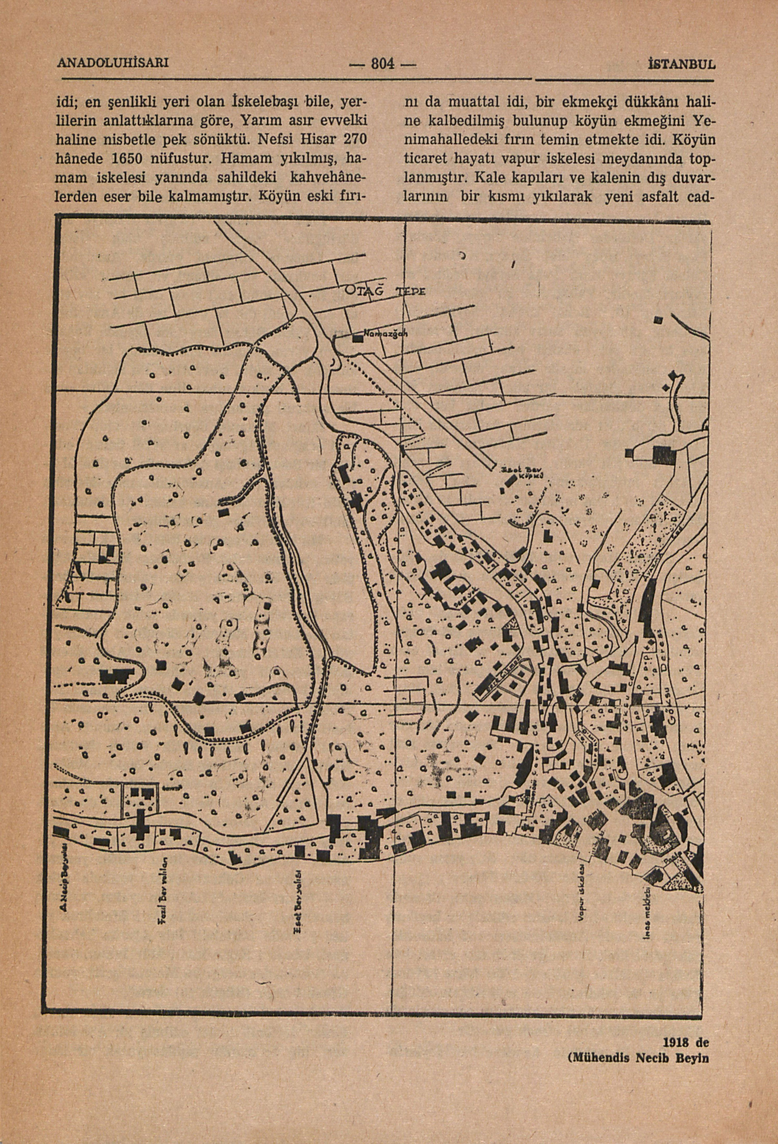 İstanbul Ansiklopedisi için 1946 da şu notlar derlenib tesbit edilmiş idi: Anadoluhisarı, hiç de mamûr sayılamıyacak bir halde idi, en şenlikli yeri olan İskelebaşı bile, yerlilerin anlattıklarına göre, Yarım asır evvelki haline nisbetle pek sönüktü. Nefsi Hisar 270 hânede 1650 nüfustur. Hamam yıkılmış, hamam iskelesi yanında sahildeki kahvehânelerden eser bile kalmamıştır. Köyün eski fırını da muattal idi, bir ekmekçi dükkânı haline kalbedilmiş bulunup köyün ekmeğini Yenimahalledeki fırın temin etmekte idi. Köyün ticaret hayatı vapur iskelesi meydanında toplanmıştır. Kale kapıları ve kalenin dış duvarlarının bir kısmı yıkılarak yeni asfalt cadde açılmadan, köy çarşısı, iki sıralı kale içinde de uzanırdı. Anadolu Hisarı kalesinin bir yol uğruna kısmen tahrbini pek hazin bir garabet olarak kaydetmek lâzımdır (B. Anadolu Hisarı), Boğazın Anadolu sahili boyunca ilerliyen bu caddenin, büyüklü küçüklü birçok kavisler çizdiğine göre, Anadoluhisarında da, iskele meydanından Göksu köprüsüne doğru kale duvarının kenarından bir kavis çizerek dolaştırılması mümkündü gibi görülür. İskele meydanında, deniz kenarında Mehmed Tetik’in bir gazino-kahvehanesi karşısında da Nureddin Kıral’ın bir balıkçı kahvesi vardır ki köyün eş dost ve ahbab ile yegâne oturulacak yerlerdir. Göksu deresinin kenarında, beton köprünün başında, çukurda İbrahim Aslı’nın balıkçı kahvesi de hoş bir yerdir; ağ tamircilerini, dereden kum çıkaran ameleleri, balıkçı motör ve kayıklarını seyretmek; balıkçılar ve sandalcılarla dereden tepeden sohbet, zevkine varabileni saatlarca oyalayabilir. Hisar mahallesi halkının büyük ekseriyeti balıkçıdır, bir kısmı da memur ve mütekaitlerdir. Yenimahalle ahalisinin ekseriyetini ise halat fabrikası amelesi teşkil eder.