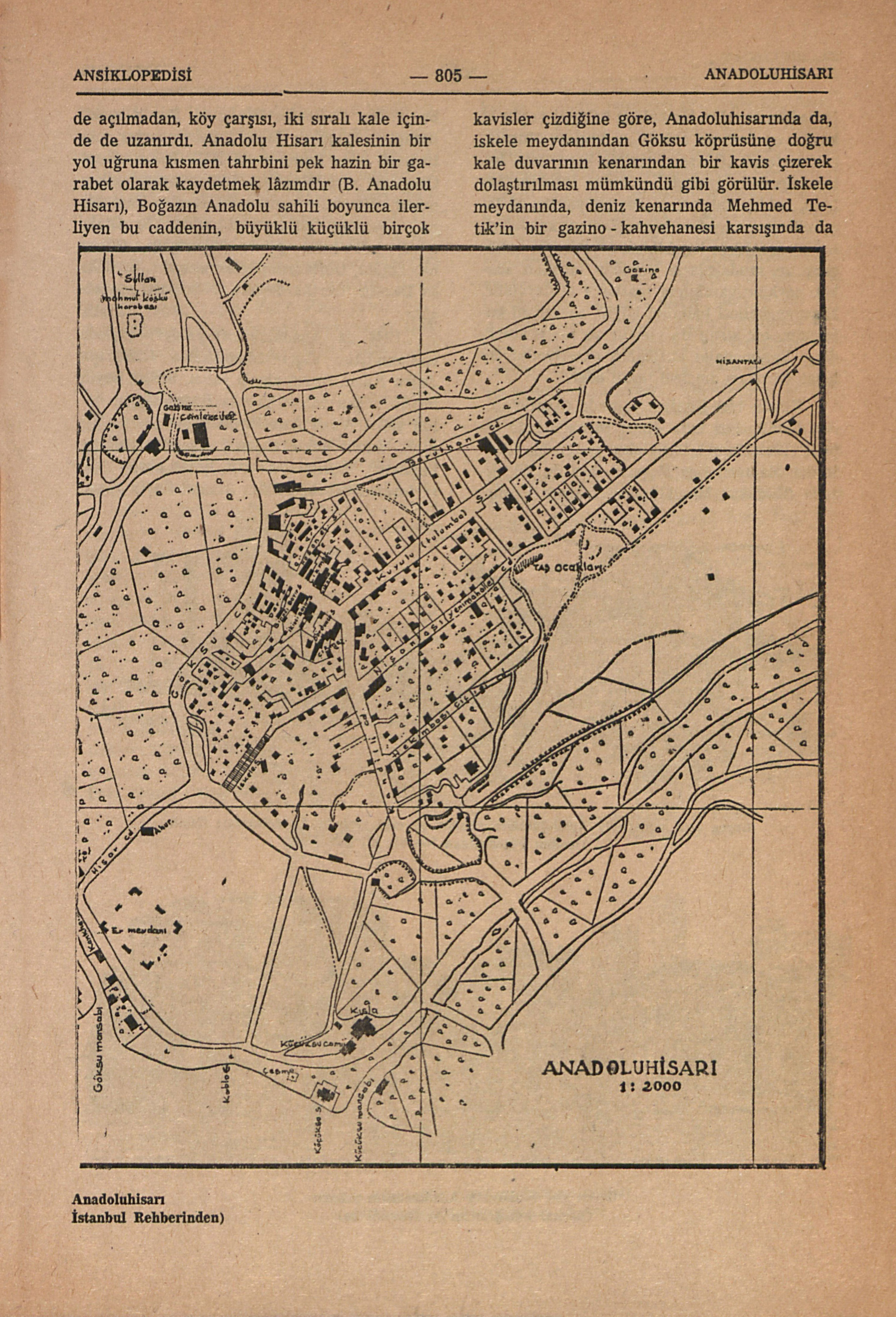 Boğaziçinin Anadolu yakasında Göksu deresinin Boğaza karıştığı yerde büyük bir müslüman köyü olup halkının ekseriyeti balıkçı ve bahçıvandır; halk ağzında sadece “Hisar” da denilir; “Asıl Anadoluhisarı” ve “Yenimahalle” adı ile iki mahalleye ayrılmıştır ki aralarında Göksu deresiyle çayırı uzanır. Adını, Yıldırım Beyazıd’ın yaptırttığı meşhur kaleden almıştır (B. : Anadolu Hisarı). Göksu’nun ikizi Küçüksu deresi de Anadoluhisarı sınırı içindedir (B. : Küçüksu).