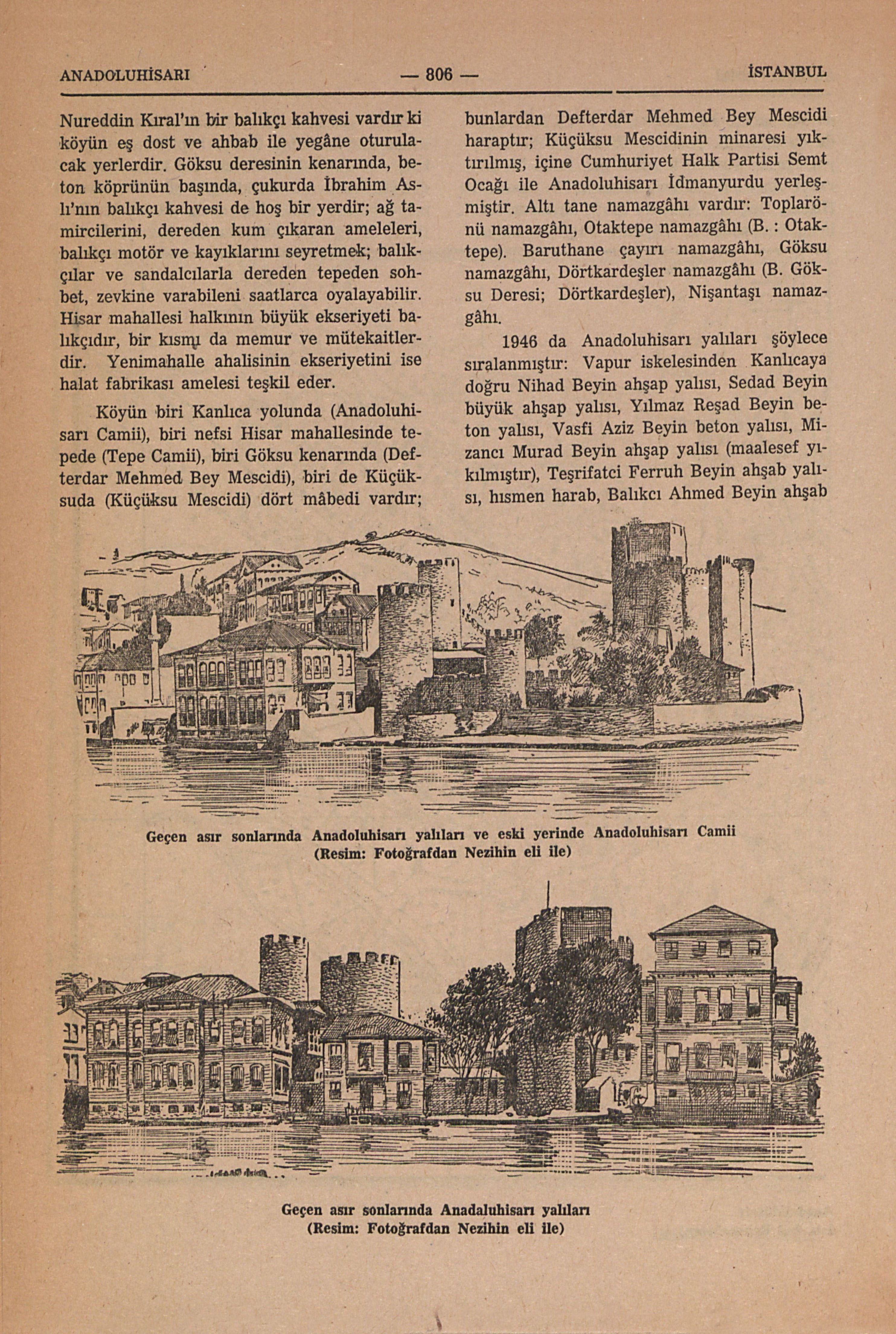 1946 da Anadoluhisarı yalıları şöylece sıralanmıştır: Vapur iskelesinden Kanlıcaya doğru Nihad Beyin ahşap yalısı, Sedad Beyin büyük ahşap yalısı, Yılmaz Reşad Beyin beton yalısı, Vasfi Aziz Beyin beton yalısı, Mizancı Murad Beyin ahşap yalısı (maalesef yıkılmıştır), Teşrifatci Ferruh Beyin ahşab yalısı, hısmen harab, Balıkcı Ahmed Beyin ahşap yalısı, Şûrâyi Devlet âzasından Esad Beyin ahşap yalısı (Şehir Meclisi âzalarından Mehmed Ali Beyin yalısı), Amcazâde Hüseyin Paşanın Meşruta yalısı (B. : Anadoluhisarında Meşruta Yalı) Ziraat Vekili Muhlis Beyin yalısı, Marki Necibin yalısı (Fransızın yalısı), Hekimbaşı Salih Efendi yalısı, Dr. Kemal Baran’ın beton yalısı; vapur iskelesinden Göksuya doğru köselecinin yalısı, Manastırlı Hakkı Efendi yalısı, Topçu Fuad Paşa yalısı, Şeyh Talât Efendi yalısı, Mümtaz Beyin yalısı; Göksu üzerinde, köprüyü geçtikten sonra Arab Paşa yalısı.