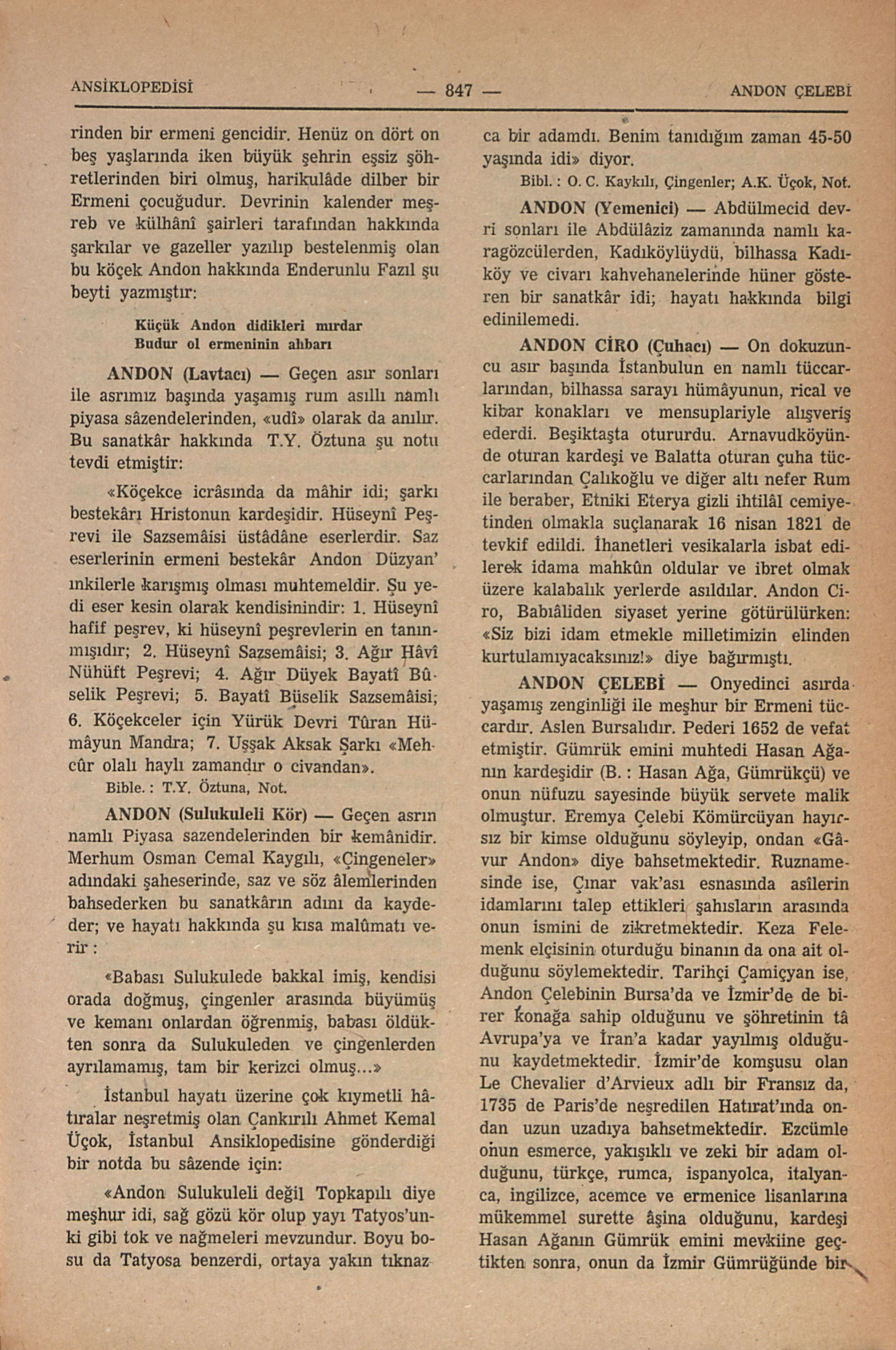 Onyedinci asırda yaşamış zenginliği ile meşhur bir Ermeni tüccardır. Aslen Bursalıdır. Pederi 1652 de vefat etmiştir. Gümrük emini muhtedi Hasan Ağanın kardeşidir (B. : Hasan Ağa, Gümrükçü) ve onun nüfuzu sayesinde büyük servete malik olmuştur. Eremya Çelebi Kömürcüyan hayırsız bir kimse olduğunu söyleyip, ondan “Gâvur Andon” diye bahsetmektedir. Ruznamesinde ise, Çınar vak’ası esnasında asîlerin idamlarını talep ettikleri şahısların arasında onun ismini de zikretmektedir. Keza Felemenk elçisinin oturduğu binanın da ona ait olduğunu söylemektedir. Tarihçi Çamiçyan ise, Andon Çelebinin Bursa’da ve İzmir’de de birer konağa sahip olduğunu ve şöhretinin tâ Avrupa’ya ve İran’a kadar yayılmış olduğunu kaydetmektedir. İzmir’de komşusu olan Le Chevalier d’Arvieux adlı bir Fransız da, 1735 de Paris’de neşredilen Hatırat’ında ondan uzun uzadıya bahsetmektedir. Ezcümle onun esmerce, yakışıklı ve zeki bir adam olduğunu, türkçe, rumca, ispanyolca, italyanca, ingilizce, acemce ve ermenice lisanlarına mükemmel surette âşina olduğunu, kardeşi Hasan Ağanın Gümrük emini mevkiine geçtikten sonra, onun da İzmir Gümrüğünde bir vazifeye tayin edildiğini, mutantan bir hayat sürdüğünü, Hasan Ağanın idamının (6 Mart 1656 da) akabinde kendisini de İzmir’de tevkif etmek isterlerken evinin gizli bir kapısın...