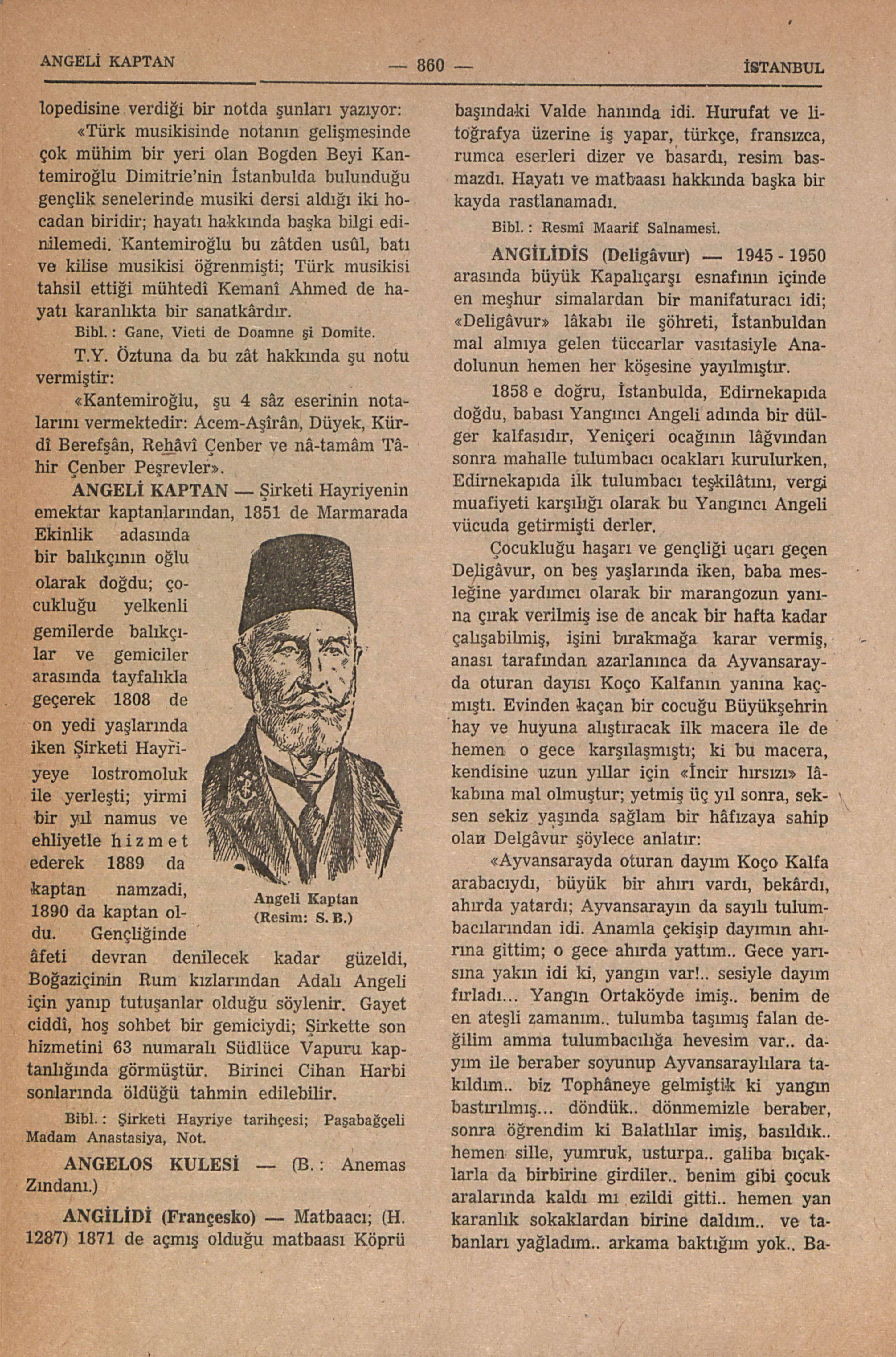 Şirketi Hayriyenin emektar kaptanlarından, 1851 de Marmarada Ekinlik adasında bir balıkçının oğlu olarak doğdu; çocukluğu yelkenli gemilerde balıkçılar ve gemiciler arasında tayfalıkla geçerek 1808 de on yedi yaşlarında iken Şirketi Hayriyeye lostromoluk ile yerleşti; yirmi bir yıl namus ve ehliyetle hizmet ederek 1889 da kaptan namzadi, 1890 da kaptan oldu. Gençliğinde âfeti devran denilecek kadar güzeldi, Boğaziçinin Rum kızlarından Adalı Angeli için yanıp tutuşanlar olduğu söylenir. Gayet ciddî, hoş sohbet bir gemiciydi; Şirkette son hizmetini 63 numaralı Südlüce Vapuru kaptanlığında görmüştür. Birinci Cihan Harbi sonlarında öldüğü tahmin edilebilir.