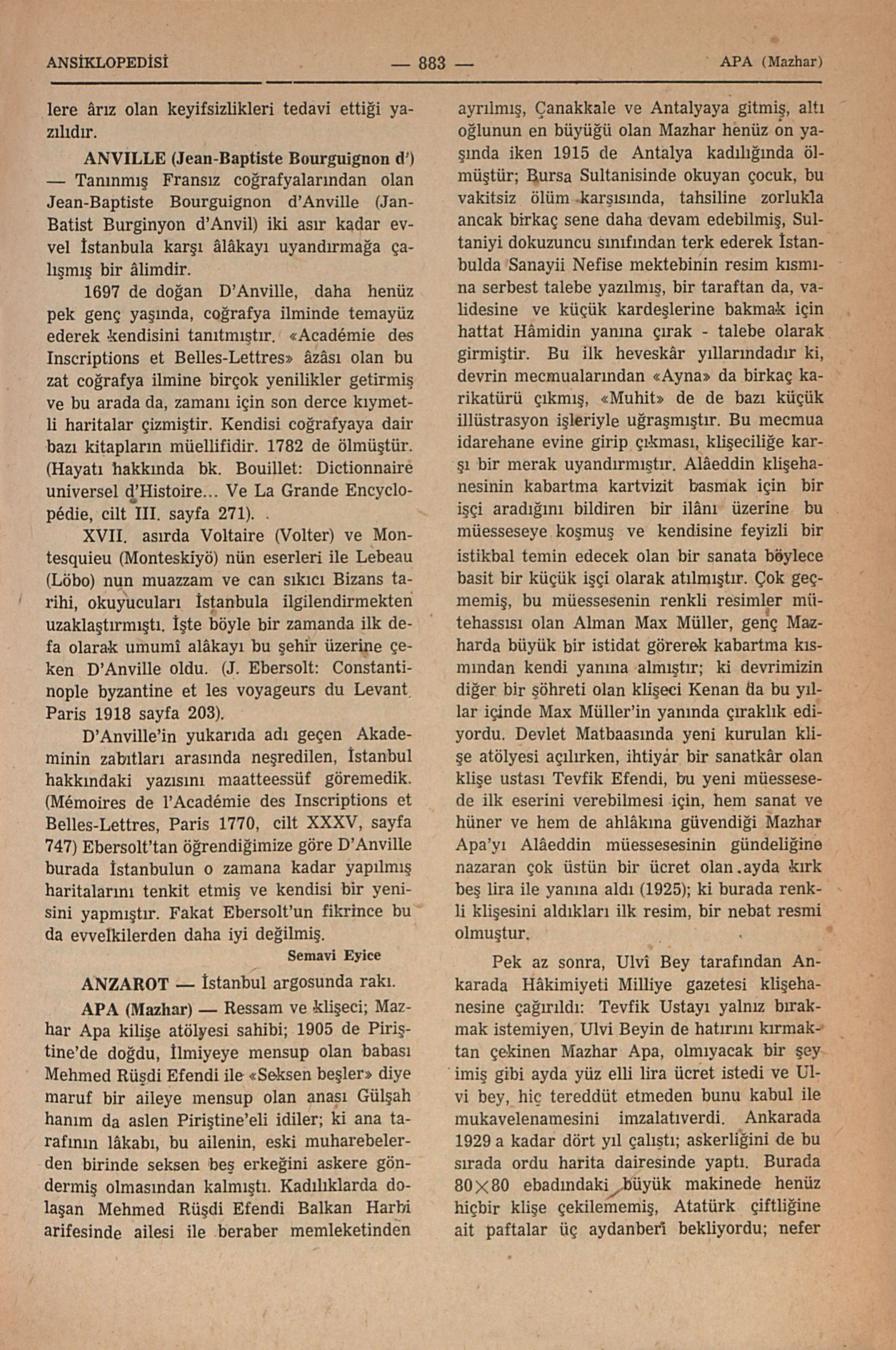 1697 de doğan D’Anville, daha henüz pek genç yaşında, coğrafya ilminde temayüz ederek kendisini tanıtmıştır. “Académie des Inscriptions et Belles-Lettres” âzâsı olan bu zat coğrafya ilmine birçok yenilikler getirmiş ve bu arada da, zamanı için son derce kıymetli haritalar çizmiştir. Kendisi coğrafyaya dair bazı kitapların müellifidir. 1782 de ölmüştür. (Hayatı hakkında bk. Bouillet: Dictionnaire universel d’Histoire... Ve La Grande Encyclopédie, cilt III. sayfa 271).
