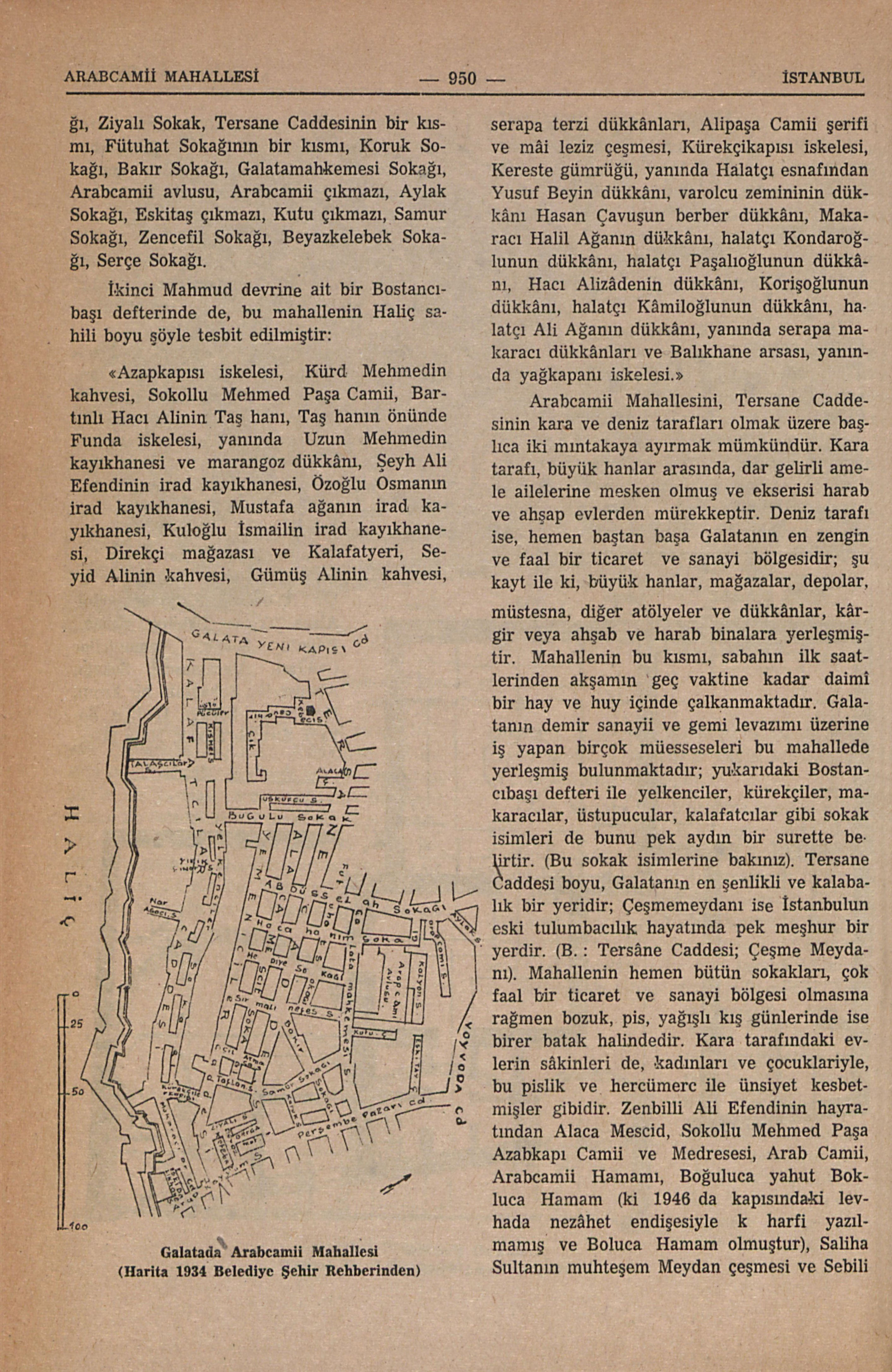 Arabcamii Mahallesini, Tersane Mahallesini, Tersane Caddesinin kara ve deniz taraftarları olmak üzere başlıca iki mıntakaya ayırmak mümkündür. Kara tarafı, büyük hanlar arasında, dar gelirli amele ailelerine mesken olmuş ve ekserisi harab ve ahşap evlerden mürekkeptir. Deniz tarafı ise, hemen baştan başa Galatanın en zengin ve faal bir ticaret ve sanayi bölgesidir; şu kayt ile ki, büyük hanlar, mağazalar, depolar, müstesna, diğer atölyeler ve dükkânlar, kârgir veya ahşab ve harab binalara yerleşmiştir. Mahallenin bu kısmı, sabahın ilk saatlerinden akşamın geç vaktine kadar daimî bir hay ve huy içinde çalkalanmaktadır. Galatanın demir sanayii ve gemi levazımı üzerine iş yapan birçok müesseseleri bu mahellede yerleşmiş bulunmaktadır; yukarıdaki Bostancıbaşı defteri ile yelkenciler, kürekçiler, makaracılar, üstupucular, kalafatcılar gibi sokak isimleri de bunu pek aydın bir surette belirtir. (Bu sokak isimlerine bakınız). Tersane Caddesi boyu, Galatanın en şenlikli ve kalabalık bir yeridir; Çeşmemeydanı ise İstanbulun eski tulumbacılık hayatında pek meşhur bir yerdir. (B. : Tersâne Caddesi; Çeşme Meydanı). Mahallenin hemen bütün sokakları, çok faal bir ticaret ve sanayi bölgesi olmasına rağmen bozuk, pis, yağışlı kış günlerinde ise birer batak halindedir. Kara tarafındaki evlerin sâkinleri de, kadınları ve çocuklariyle, bu pislik ve hercümerc ile ünsiyet kesbetmişler gibidir. Zenbilli Ali Efendinin hayratından Alaca Mescid, Sokollu Mehmed Paşa Azabkapı Camii ve Medresesi, Arab Camii, Arabcamii Hamamı, Boğuluca yahut Bokluca Hamam (ki 1946 da kapısındaki levhada nezâhet endişesiyle k harfi yazılmamış ve Boluca Hamam olmuştur), Saliha Sultanın muhteşem Meydan çeşmesi ve Sebili (B. : Azabkapısı Meydan Çeşmesi ve Sebili) bu mahallenin hudud içindedir.