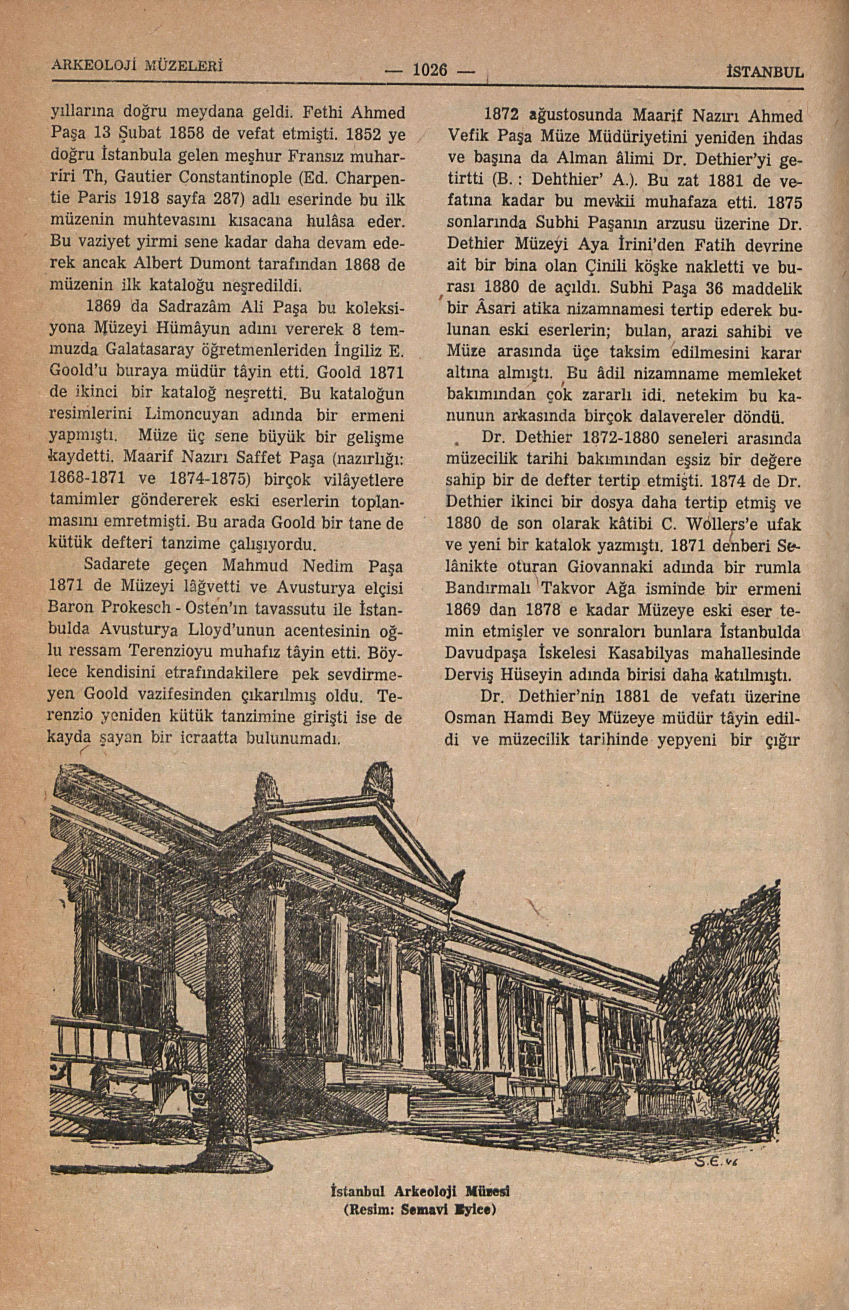 1872 ağustosunda Maarif Nazırı Ahmed Vefik Paşa Müze Müdüriyetini yeniden ihdas ve başına da Alman âlimi Dr. Dethier’yi getirtti (B. : Dehthier’ A.). Bu zat 1881 de vefatına kadar bu mevkii muhafaza etti. 1875 sonlarında Subhi Paşanın arzusu üzerine Dr. Dethier Müzeyi Aya İrini’den Fatih devrine ait bir bina olan Çinili köşke nakletti ve burası 1880 de açıldı. Subhi Paşa 36 maddelik bir Âsari atika nizamnamesi tertip ederek bulunan eski eserlerin; bulan, arazi sahibi ve Müze arasında üçe taksim edilmesini karar altına almıştı. Bu âdil nizamname memleket bakımından çok zararlı idi. netekim bu kanunun arkasında birçok dalavereler döndü.