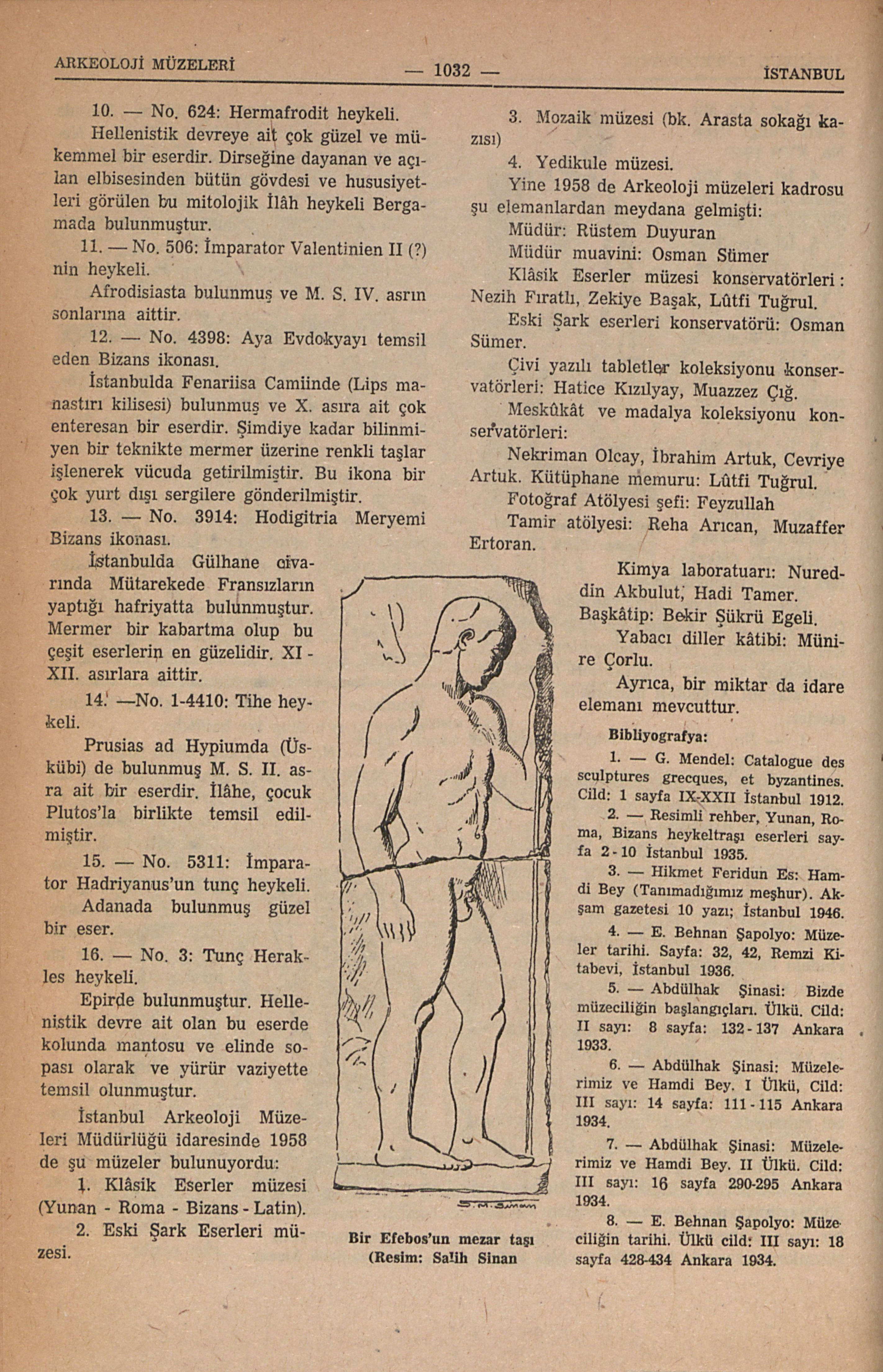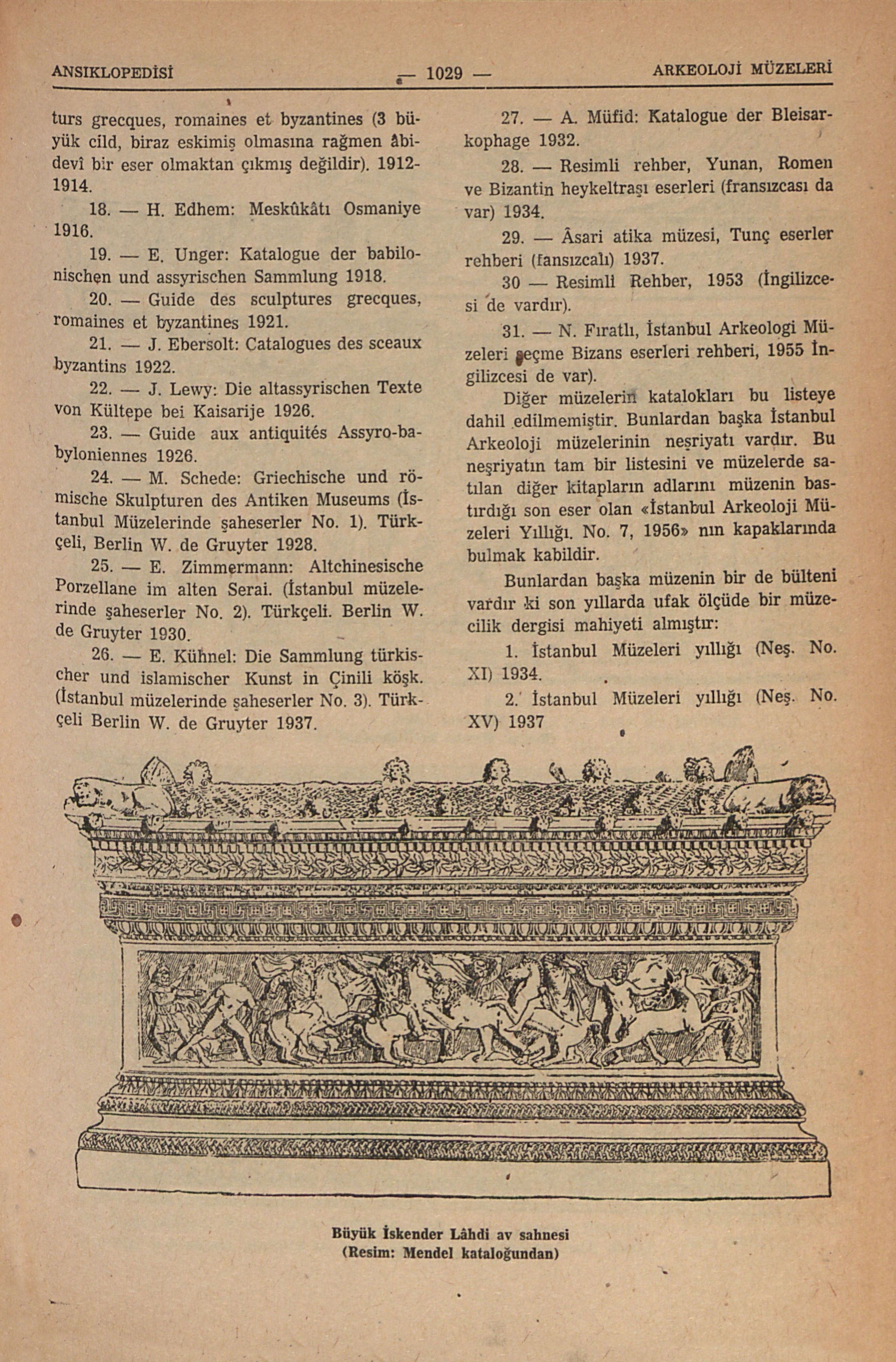 17. — G. Mendel: Catalogue des sculpturs grecques, romaines et byzantines (3 büyük cild, biraz eskimiş olmasına rağmen âbidevî bir eser olmaktan çıkmış değildir). 1912-1914.