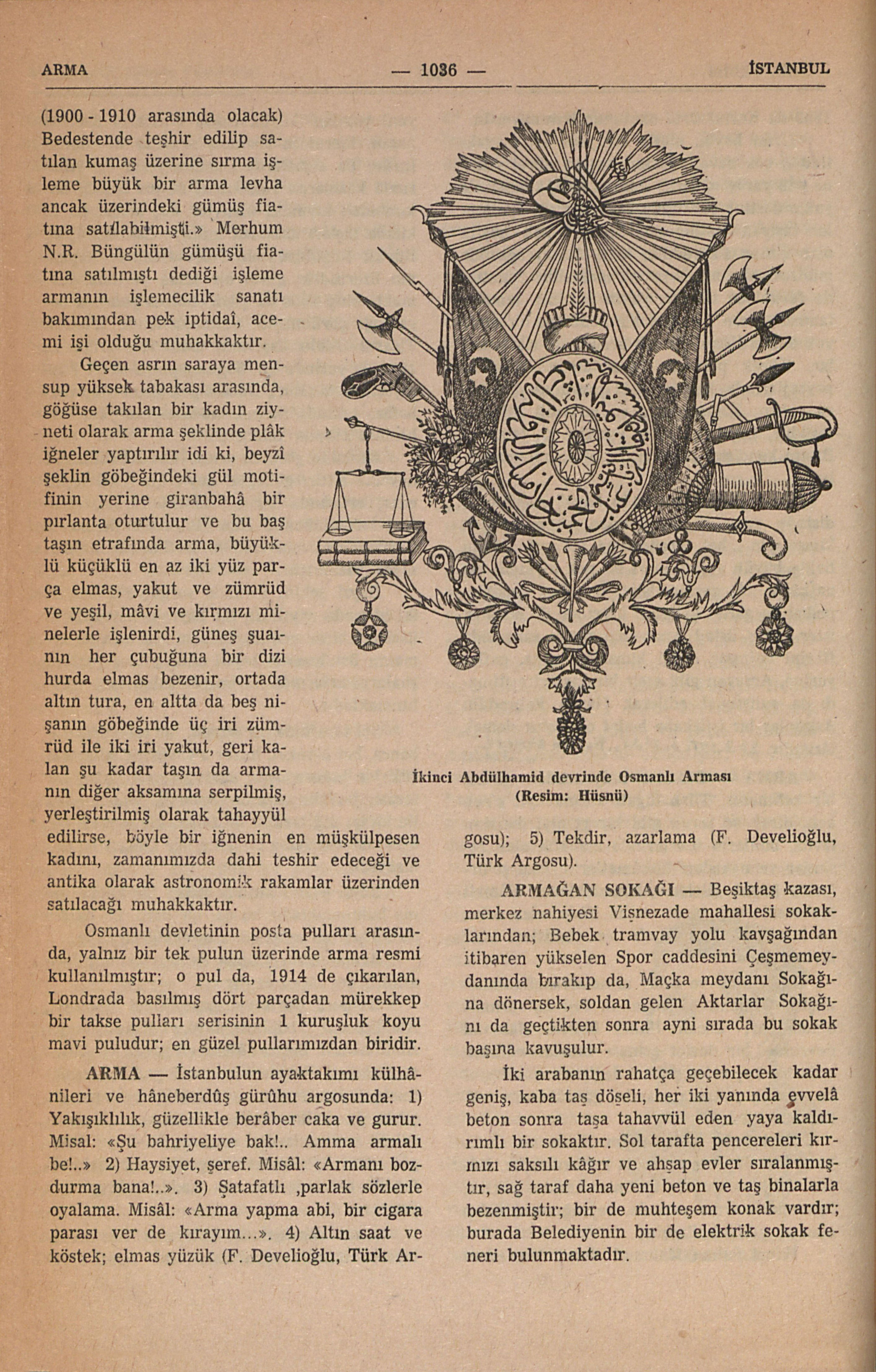 İkinci Sultan Mahmud devrinden sonra yeni yapılan büyük resmî binaların üzerine bazan, mermere işlenmiş armalar da konulurdu; bu armalarda Cumhuriyetin ilk yıllarında kazınarak kaldırılmıştır; taş işçiliği bakımından kıymetli olan bir kaç arma; tarihî kitabe taşları arasında müzeye kaldırılmıştır; Büyük Kapalıçarşınin Nuruosmaniye kapısının üzerindeki güzel bir arma yerinde durmakta olup 1959 da güyâ onarma yolunda boyandığı görülmüştü. Sultanahmedde Yüksek Ticaret Okulu kapısının üstü...