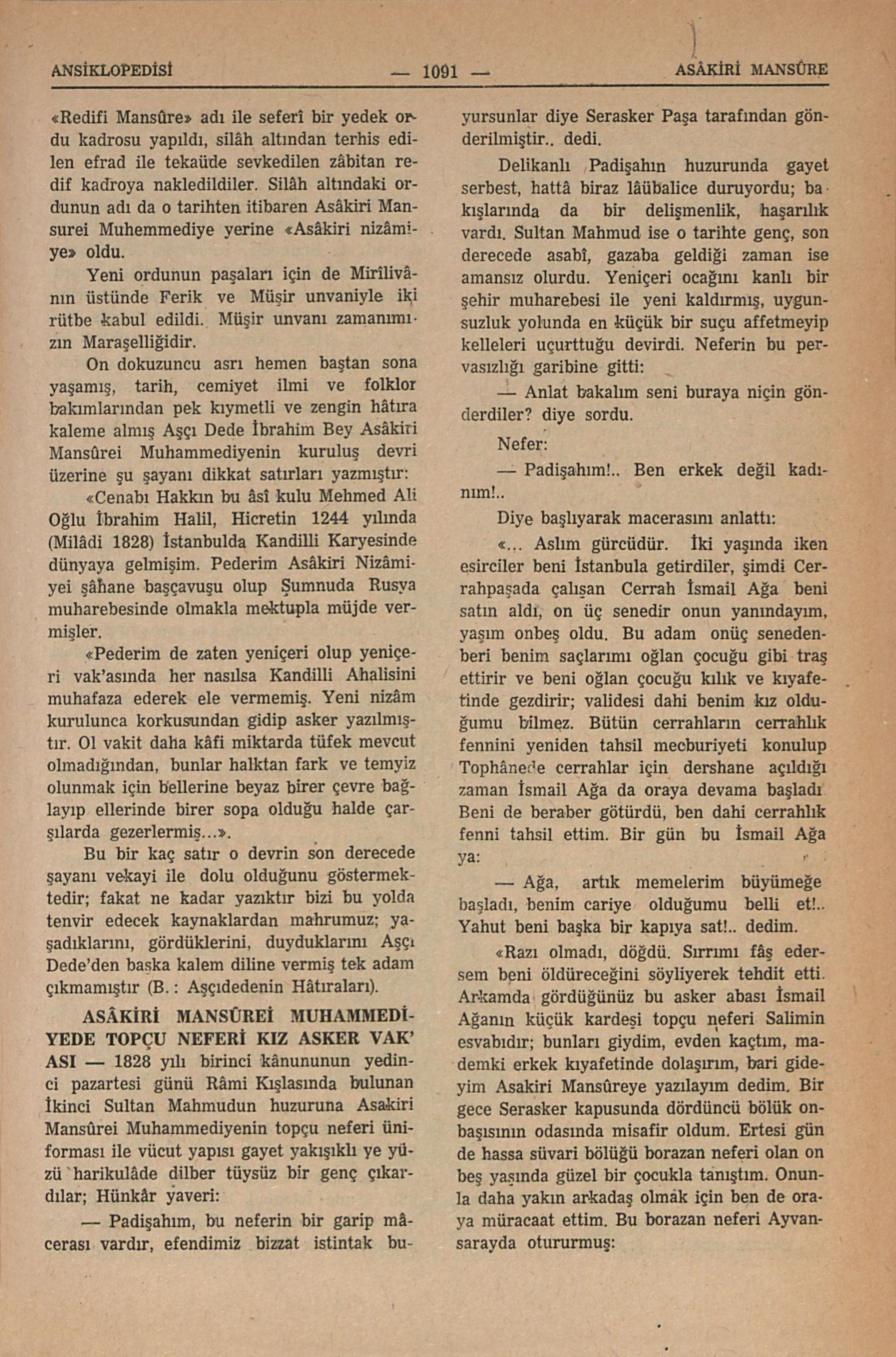 On dokuzuncu asrı hemen baştan sona yaşamış, tarih, cemiyet ilmi ve folklor bakımlarından pek kıymetli ve zengin hâtıra kaleme almış Aşçı Dede İbrahim Bey Asâkiri Mansûrei Muhammediyenin kuruluş devri üzerine şu şayanı dikkat satırları yazmıştır: