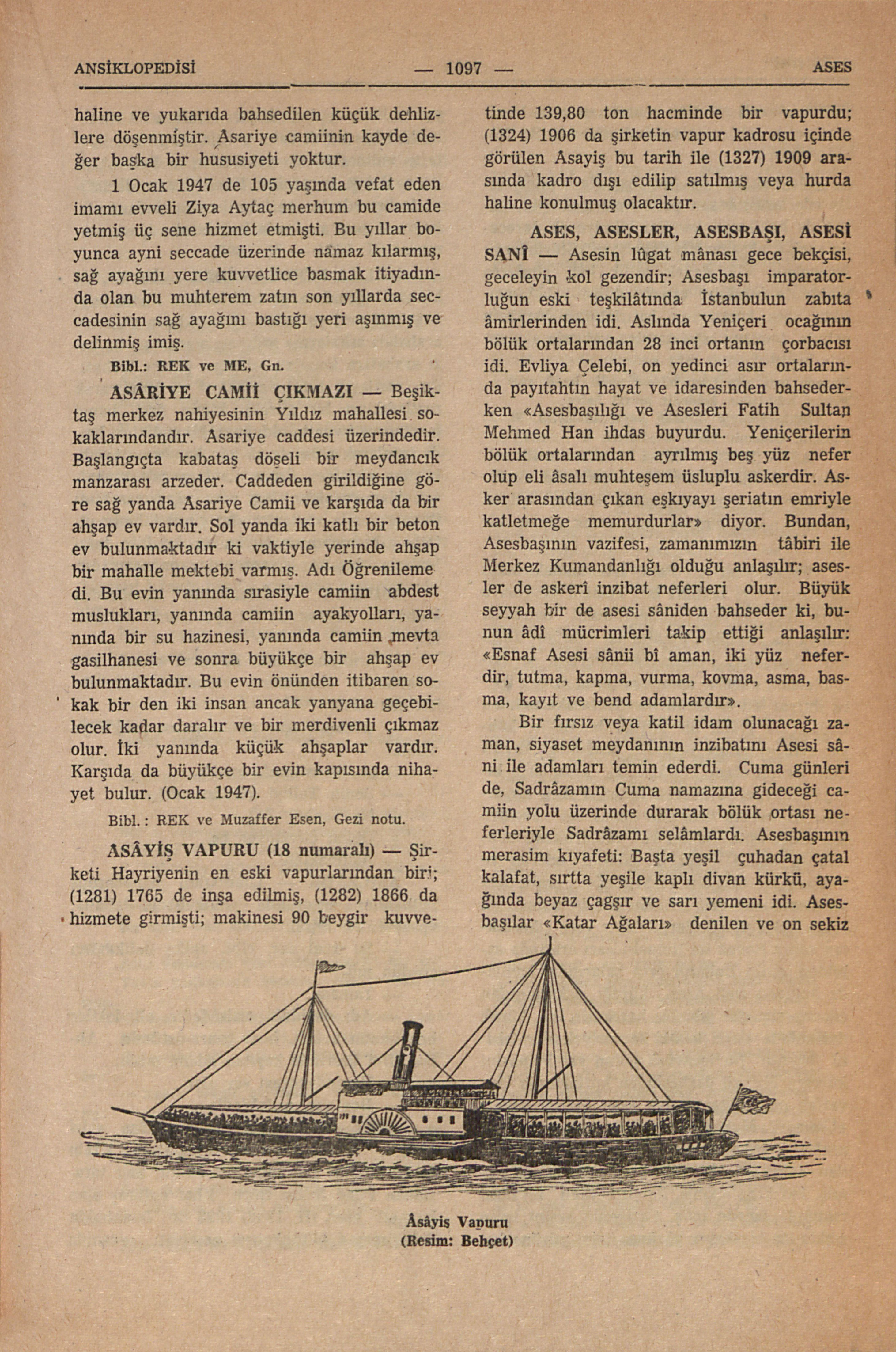 Şirketi Hayriyenin en eski vapurlarından biri; (1281) 1765 de inşa edilmiş, (1282) 1866 da hizmete girmişti; makinesi 90 beygir kuvvetinde 139,80 ton hacminde bir vapurdu; (1324) 1906 da şirketin vapur kadrosu içinde görülen Âsayiş bu tarih ile (1327) 1909 arasında kadro dışı edilip satılmış veya hurda haline konulmuş olacaktır.