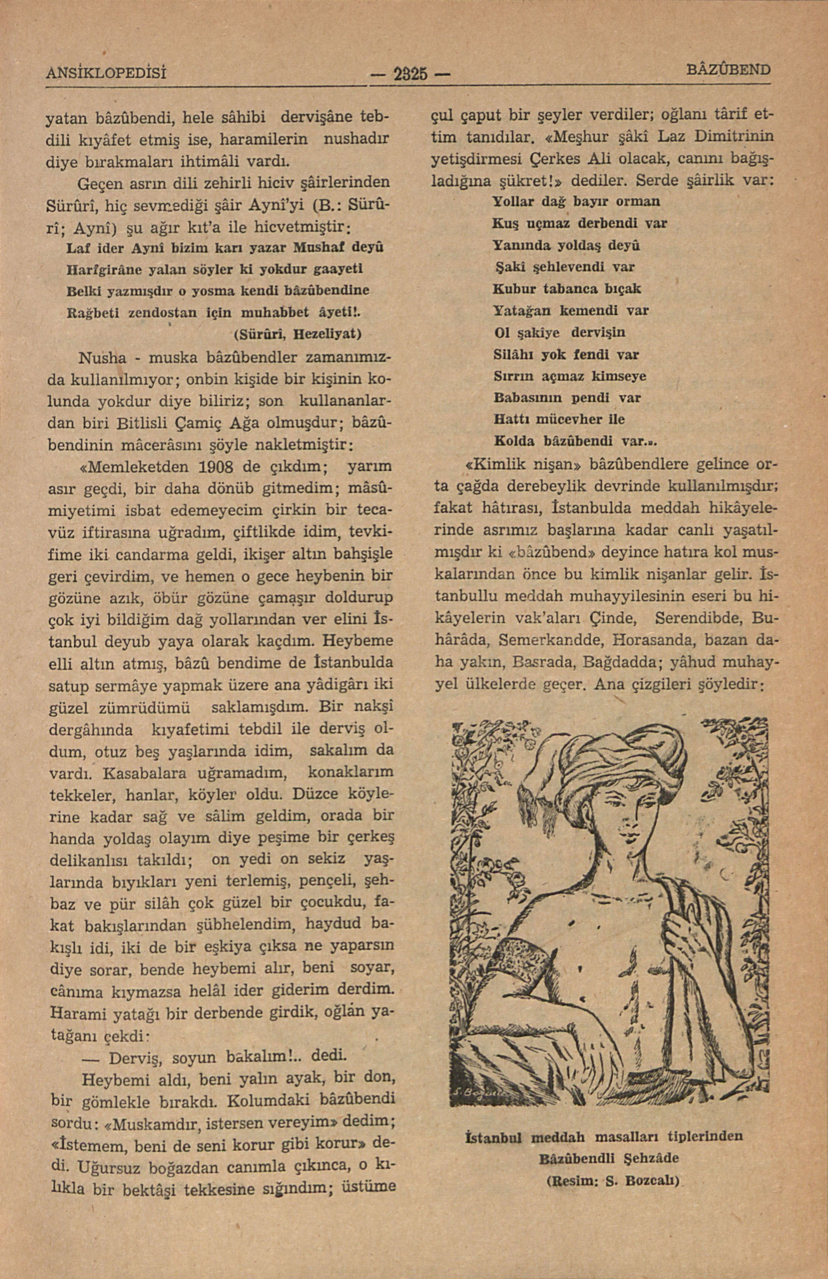 “Kimlik nişan” bâzûbendlere gelince orta çağda derebeylik devrinde kullanılmışdır; fakat hâtırası, İstanbulda meddah hikâyelerinde asrımız başlarına kadar canlı yaşatılmışdır ki “bâzûbend” deyince hatıra kol muskalarından önce bu kimlik nişanlar gelir. İstanbullu meddah muhayyilesinin eseri bu hikâyelerin vak’aları Çinde, Serendibde, Buhârâda, Semerkandde, Horasanda, bazan daha yakın, Basrada, Bağdadda; yâhud muhayyel ülkelerde geçer. Ana çizgileri şöyledir: