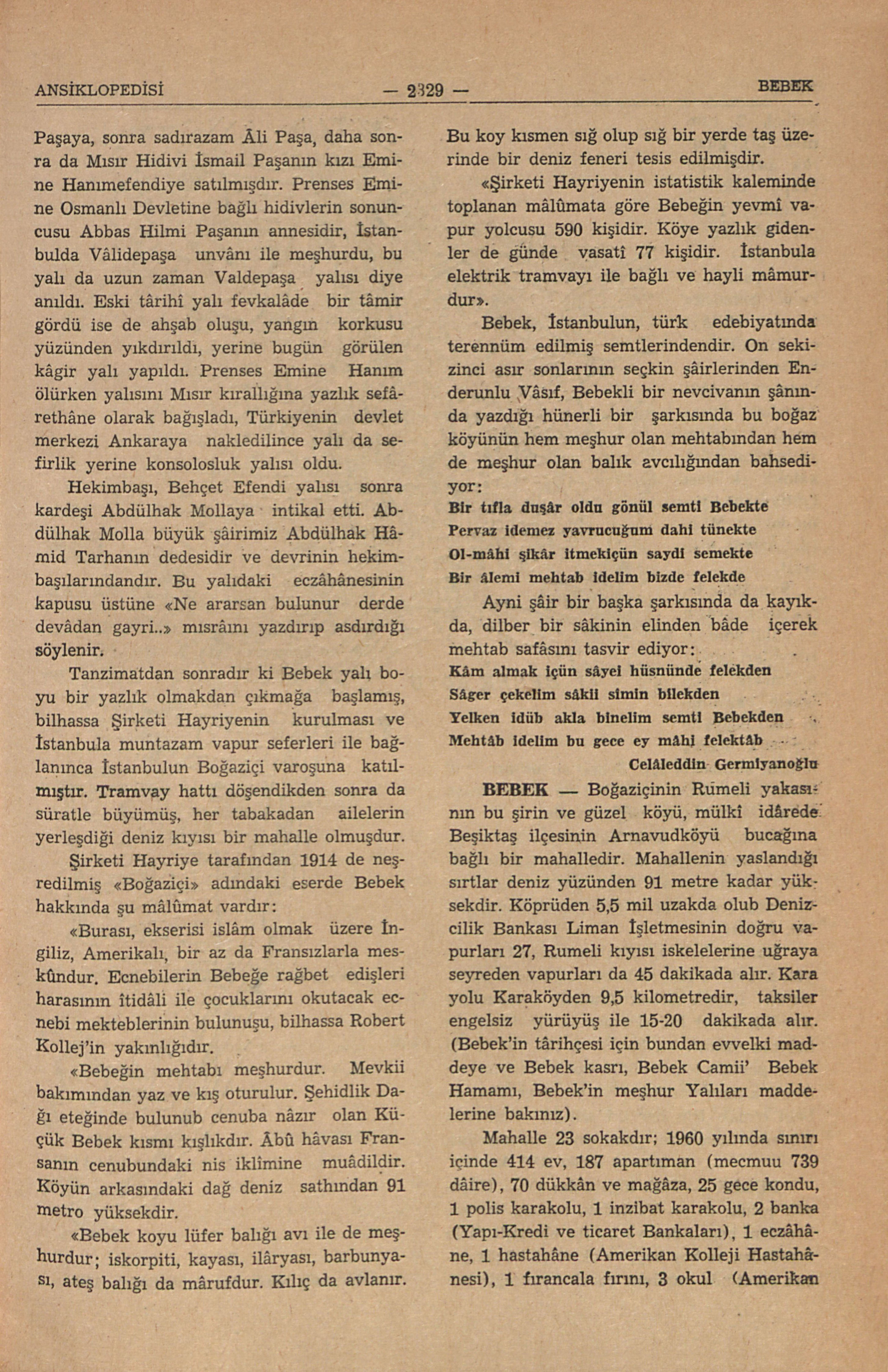 Boğaziçinin Rumeli yakasının bu şirin ve güzel köyü, mülkî idârede Beşiktaş ilçesinin Arnavudköyü bucağına bağlı bir mahalledir. Mahallenin yaslandığı sırtlar deniz yüzünden 91 metre kadar yüksekdir. Köprüden 5,5 mil uzakda olub Denizcilik Bankası Liman İşletmesinin doğru vapurları 27, Rumeli kıyısı iskelelerine uğraya seyreden vapurları da 45 dakikada alır. Kara yolu Karaköyden 9,5 kilometredir, taksiler engelsiz yürüyüş ile 15-20 dakikada alır. (Bebek’in târihçesi için bundan evvelki maddeye ve Bebek kasrı, Bebek Camii’ Bebek Hamamı, Bebek’in meşhur Yalıları maddelerine bakınız).