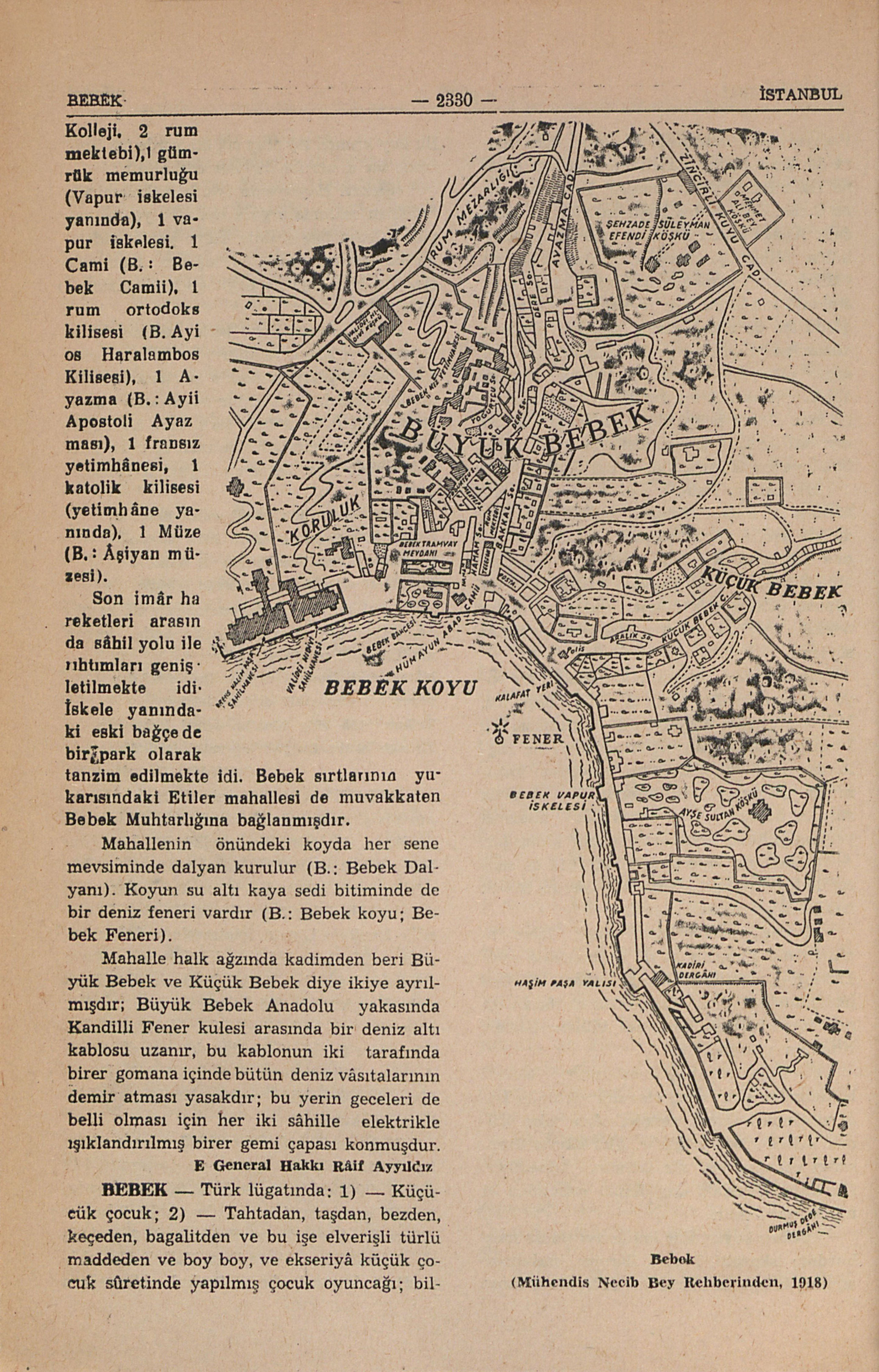B.: Bebek Camii; B. Ayios Haralambos Kilisesi; B.: Ayii Apostoli Ayazması; B.: Âşiyân müzesi; B.: Bebek Dalyanı; B.: Bebek koyu; Bebek Feneri