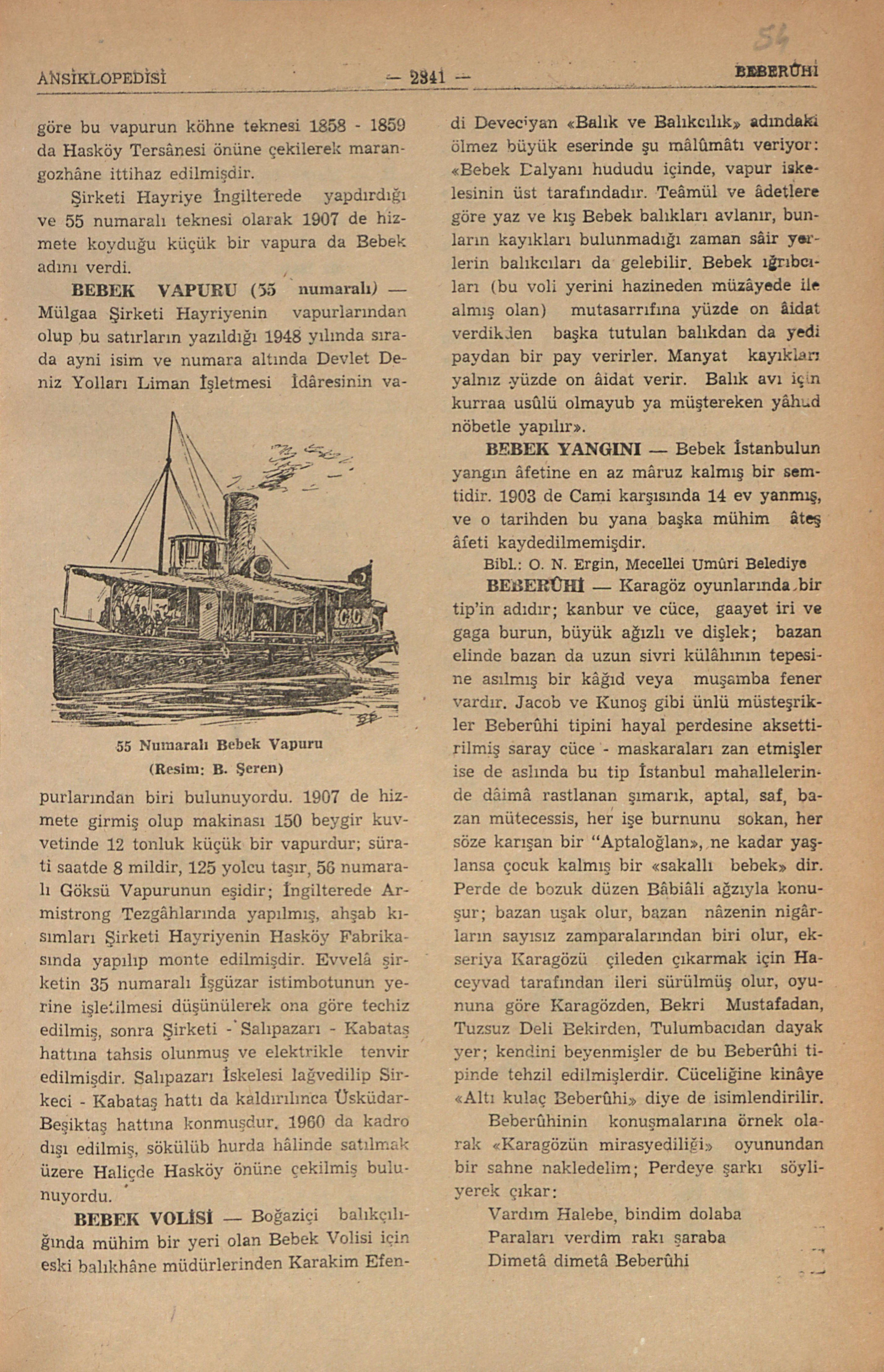 Mülgaa Şirketi Hayriyenin vapurlarından olup bu satırların yazıldığı 1948 yılında sırada ayni isim ve numara altında Devlet Deniz Yolları Liman İşletmesi İdâresinin vapurlarından biri bulunuyordu. 1907 de hizmete girmiş olup makinası 150 beygir kuvetinde 12 tonluk küçük bir vapurdur; sürati saatde 8 mildir, 125 yolcu taşır, 56 numaralı Göksü Vapurunun eşidir; İngilterede Armistrong Tezgâhlarında yapılmış, ahşab kısımları Şirketi Hayriyenin Hasköy Fabrikasında yapılıp monte edilmişdir. Evvelâ şirketin 35 numaralı İşgüzar istimbotunun yerine işletilmesi düşünülerek ona göre techiz edilmiş, sonra Şirketi - Salıpazarı - Kabataş hattına tahsis olunmuş ve elektrikle tenvir edilmişdir. Salıpazarı İskelesi lağvedilip Sirkeci - Kabataş hattı da kaldırılınca Üsküdar-Beşiktaş hattına konmuşdur. 1960 da kadro dışı edilmiş, sökülüb hurda hâlinde satılmak üzere Haliçde Hasköy önüne çekilmiş bulunuyordu. 55 Numaralı Bebek Vapuru (Resim: B. Şeren)