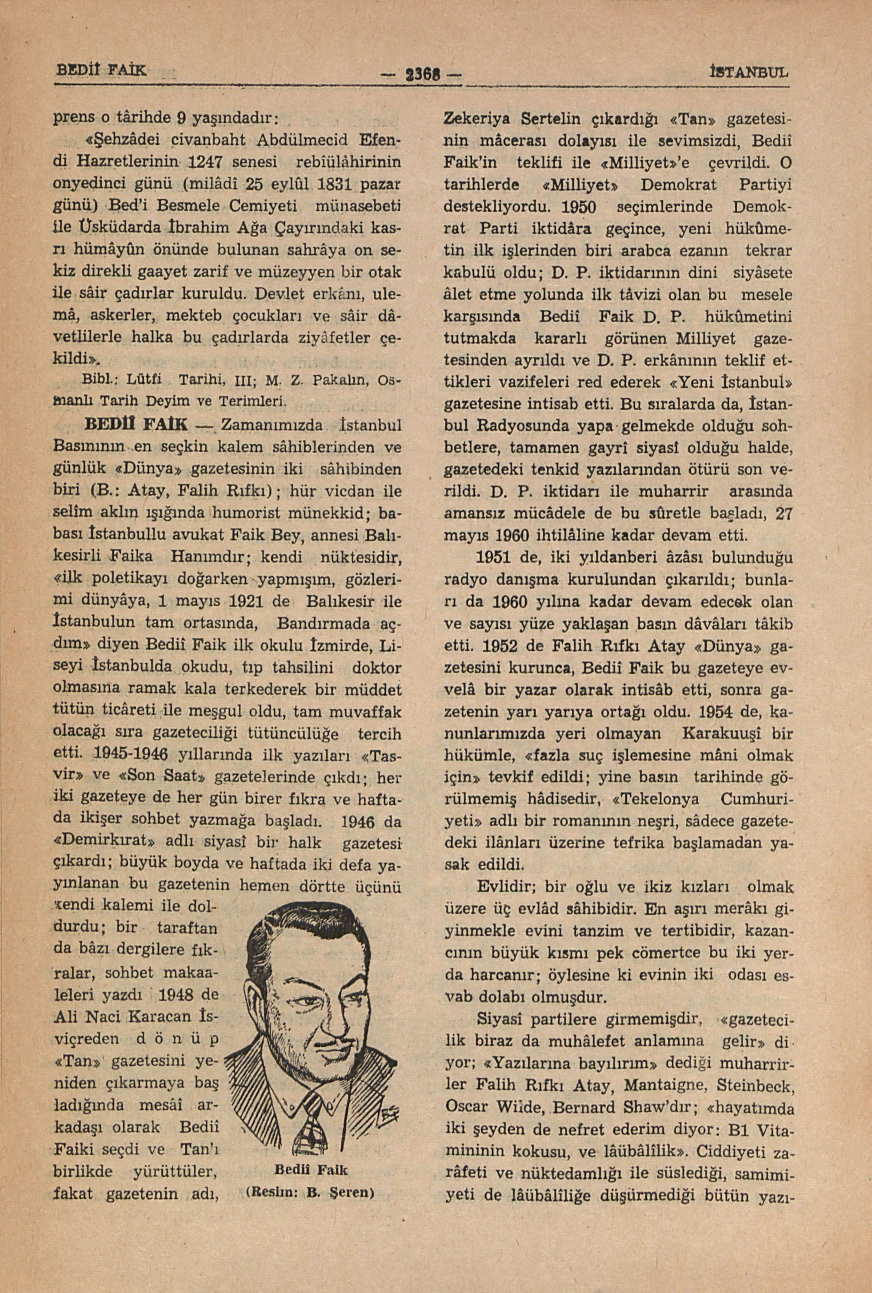 Zamanımızda İstanbul Basınının en seçkin kalem sâhiblerinden ve günlük “Dünya” gazetesinin iki sâhibinden biri (B.: Atay, Falih Rıfkı); hür vicdan ile selîm aklın ışığında humorist münekkid; babası İstanbullu avukat Faik Bey, annesi Balıkesirli Faika Hanımdır; kendi nüktesidir, “ilk poletikayı doğarken yapmışım, gözlerimi dünyâya, 1 mayıs 1921 de Balıkesir ile İstanbulun tam ortasında, Bandırmada açdım” diyen Bediî Faik ilk okulu İzmirde, Liseyi İstanbulda okudu, tıp tahsilini doktor olmasına ramak kala terkederek bir müddet tütün ticâreti ile meşgul oldu, tam muvaffak olacağı sıra gazeteciliği tütüncülüğe tercih etti. 1945-1946 yıllarında ilk yazıları “Tasvir” ve “Son Saat” gazetelerinde çıkdı; her iki gazeteye de her gün birer fıkra ve haftada ikişer sohbet yazmağa başladı. 1946 da “Demirkırat” adlı siyasî bir halk gazetesi çıkardı; büyük boyda ve haftada iki defa yayınlanan bu gazetenin hemen dörtte üçünü kendi kalemi ile doldurdu; bir taraftan da bâzı dergilere fıkralar, sohbet makaaleleri yazdı. 1948 de Ali Naci Karacan İsviçreden dönüp “Tan” gazetesini yeniden çıkarmaya başladığında mesâi arkadaşı olarak Bediî Faiki seçdi ve Tan’ı birlikde yürüttüler, fakat gazetenin adı, Zekeriya Sertelin çıkardığı “Tan” gazetesinin mâcerası dolayısı ile sevimsizdi, Bediî Faik’in teklifi i...