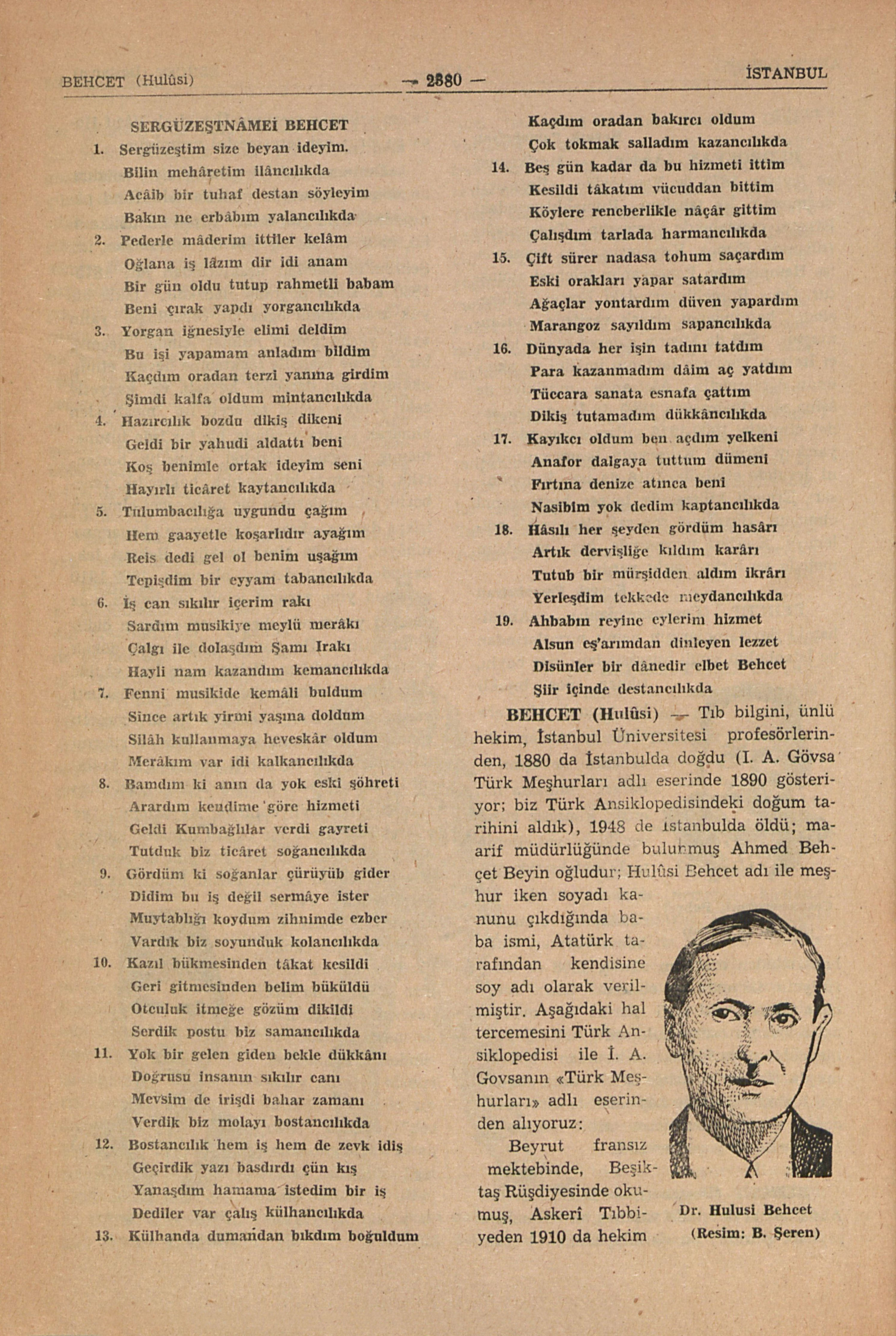 “Destancı Bedriyi gencliğinden tanıdım, on dokuz yaşlarında masallardaki Hind pâdişahının oğlu gibi esmer güzeli bir delikanlı idi, uzun boylu, tığ gibi bir tulumbacı idi, Şehremini Sandığı uşaklarından idi; 1875-1880 arasında doğmuş olacakdır, fakir bir yük arabacısının oğlu idi, çocukluğu yalın ayak, yarım pabuc mihnet içinde geçmiş, bir iki sene mahalle mektebine devam etmiş, okumaya son derecede hevesli, ve gaayetle zekî olduğu geçim zarureti ile mektebden alınarak sanata verilmiş, hiç bir işde tutunamamış, yorgancı çıraklığı, çalgıcılık, bostancılık, hamamda külhancılık, bakırcılık, rencberlik gibi aralarında hiç münâsebet olmayan işlere dalmış çıkmış, türlü renge boyanmış, nihâyet, gaalibâ Merdivenköyü Bektaşi tekkesinde bektâşi dervişi olmuşdu, 1908-1910 arasında yine zaruret içinde ve henüz otuz otuzbeş yaşlarında iken müteverrimen öldüğünü işittim. Bu günahkâr da kırık dökük destanlar yazdığım, Behcetin de bu vâdide aşırı hevesi olduğundan bana muhabbeti vardı, arar, sorar, herkesin havâî meşreb sandığı o genc bana içli bir dille dertlerini dökerdi. Çocuk sayılacak yaşdan içki kullanırdı; ince has...