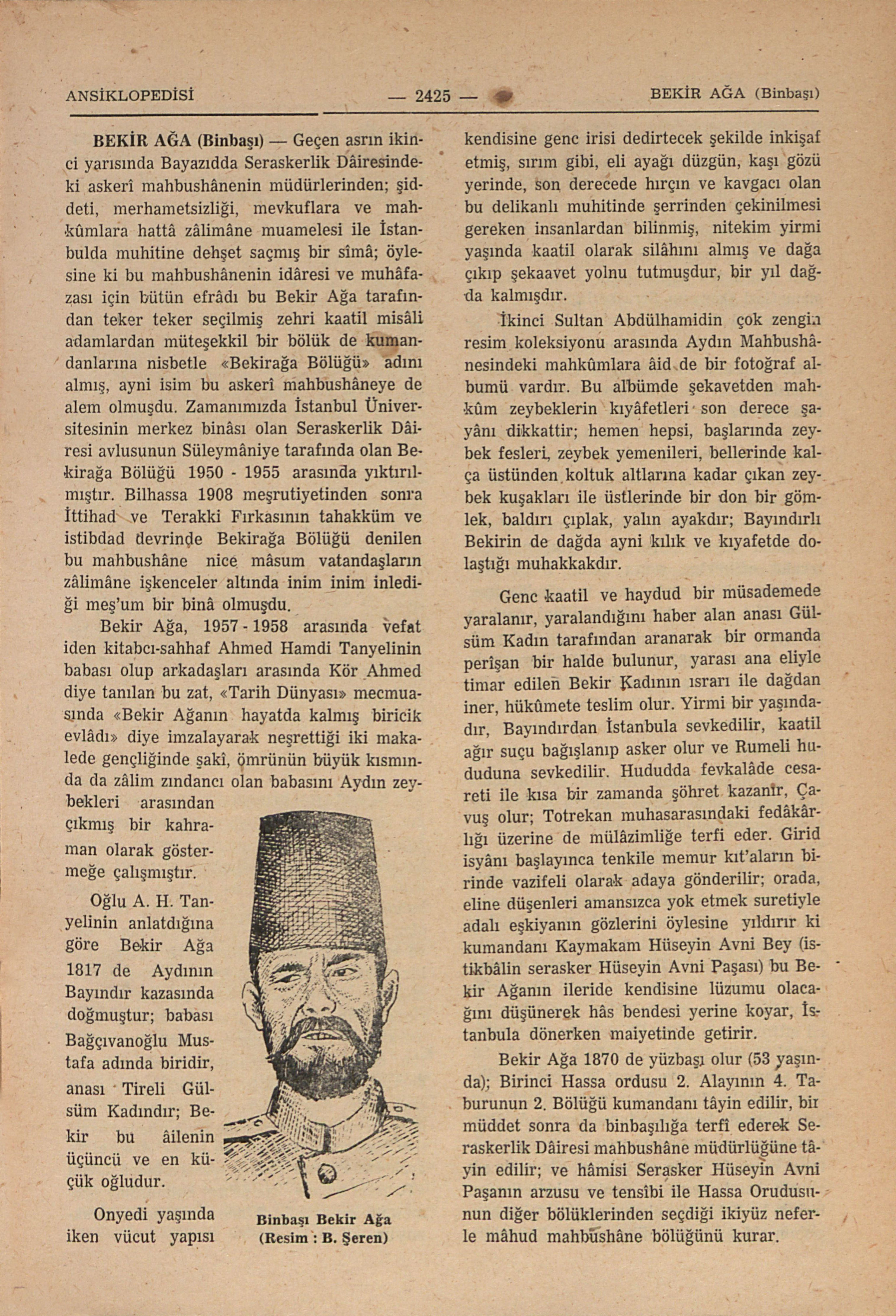 Bekir Ağa, 1957 - 1958 arasında vefat iden kitabcı-sahhaf Ahmed Hamdi Tanyelinin babası olup arkadaşları arasında Kör Ahmed diye tanılan bu zat, “Tarih Dünyası” mecmuasında “Bekir Ağanın hayatda kalmış biricik evlâdı” diye imzalayarak neşrettiği iki makalede gençliğinde şakî, ömrünün büyük kısmında da zâlim zındancı olan babasını Aydın zeybekleri arasından çıkmış bir kahraman olarak göstermeğe çalışmıştır. ...