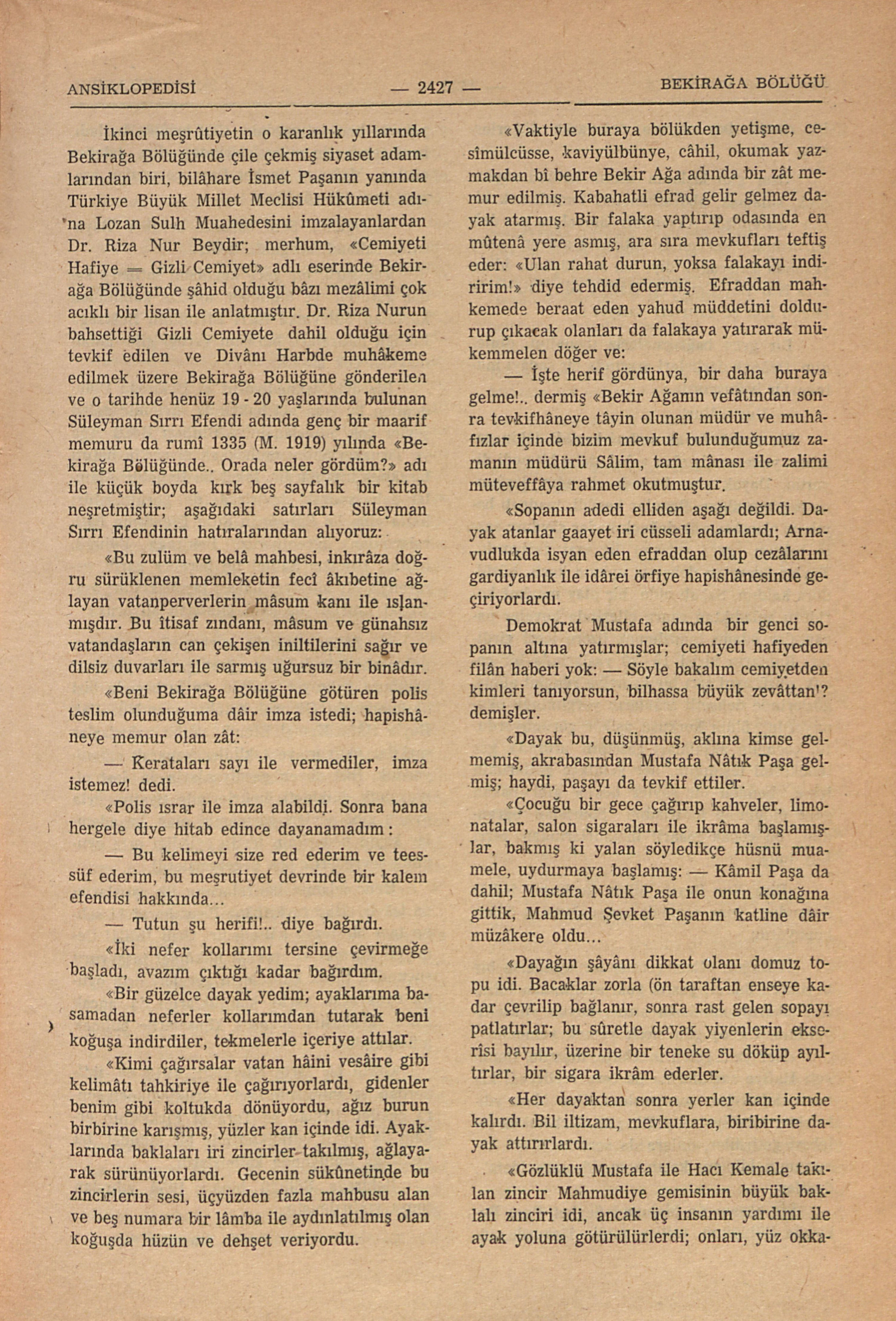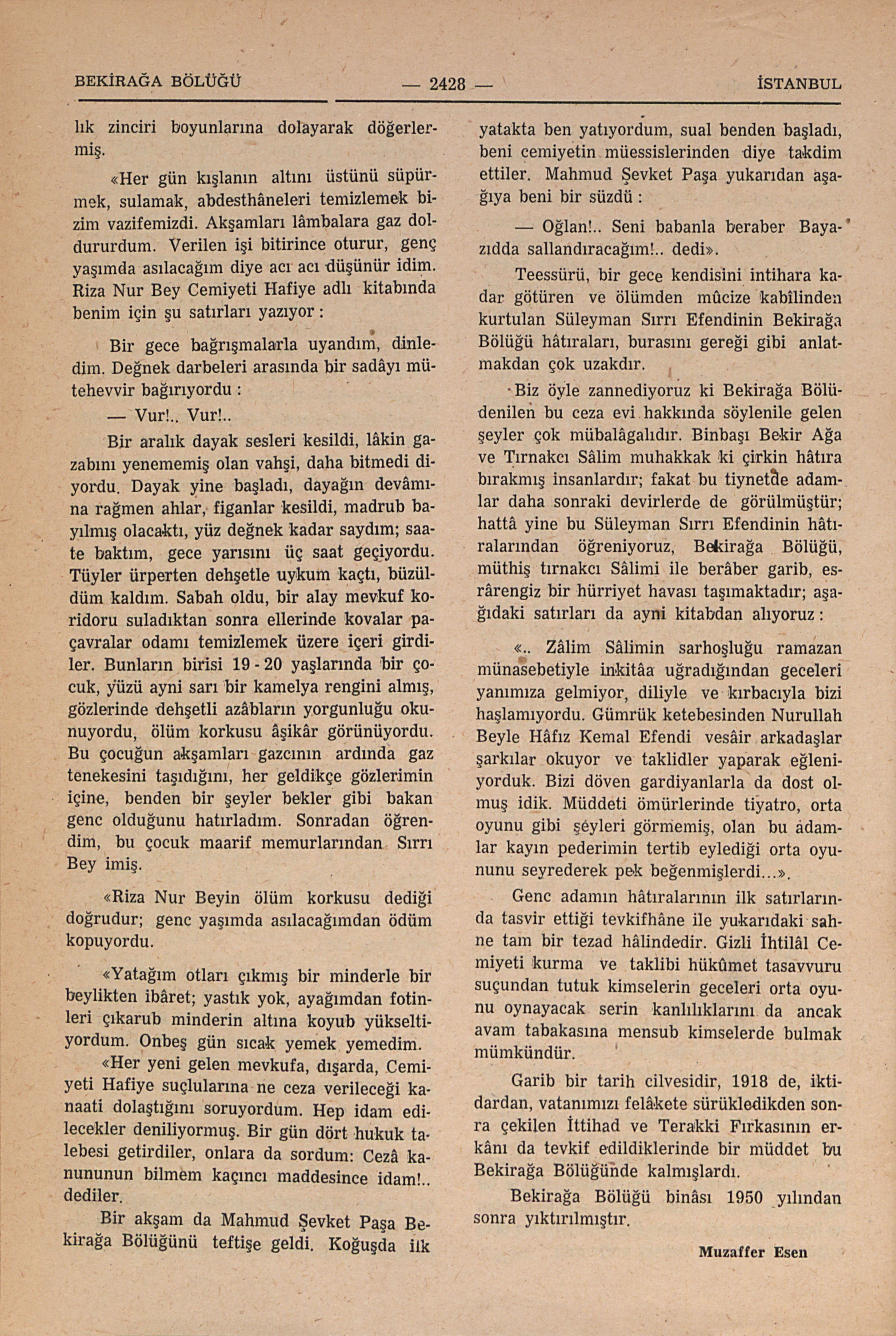 Bayazıdda Yangın Kulesinin hemen yanı başında bulunan İstanbul Üniversitesi merkez binâsı evvelâ Seraskerlik ve sonra Harbiye Nezâreti iken, ayni avlu - meydanda, bu binânın şimâlinde bulunan askerî tevkifhâne binasına takılmış olan isimdir ki, bu adı ilk müdürü olan şiddet ve zulümü ile meşhur Bayındırlı Binbaşı Bekir Ağanın adından almışdır; bu bina târihimizde en acı hâtırasını, ikinci meşrûtiyet devrinde, İttihad ve Terakki Fırkasının, koca Türkiye İmparatorluğunu izmihlâle götüren diktatörlüğü zamanında bırakmışdır; o devrin Bekirağa Bölüğü Tevfkifhânesi müdürü olan Sâlim Bey de orta çağın engizisyon zındancılarını hatırlatacak bir simâ olmuş, siyasî maznunlar üzerinde sık sık tatbik ettiği el ve ayak tırnaklarını sökme işkencesinden ötürü “Tırnakcı Sâlim” diye şöhret bulmuşdur; mevcud ise evlâdü ahfadına her halde bırakmışdır. İkinci meşrûtiyetin o karanlık yıllarında Bekirağa Bölüğünde çile çekmiş siyaset adamlarından biri, bilâhare İsmet Paşanın yanında Türkiye Büyük Millet Meclisi Hükûmeti adına Lozan Sulh Muahedesini imzalayanlardan Dr. Riza Nur Beydir; merhum, “Cemiyeti Hafiye = Gizli Cemiyet” adlı eserinde Bekirağa Bölüğünde şâhid olduğu bâzı mezâlimi çok acıkli bir lisan ile anlatmıştır. Dr. Riza Nurun bahsettiği Gizli Cemiyete dahil olduğu için tevkif edilen ve Div...