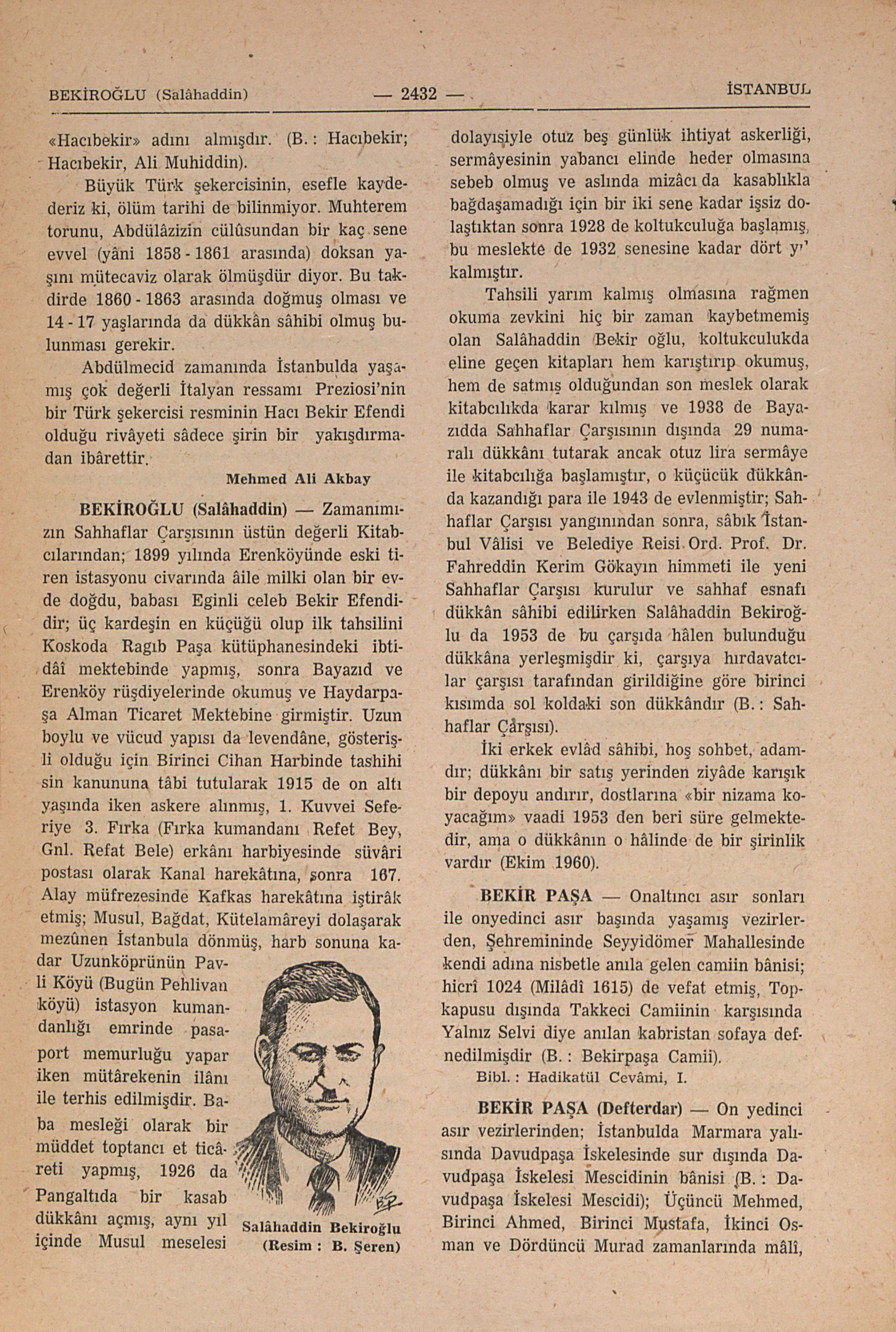 Zamanımızın Sahhaflar Çarşısının üstün değerli Kitabcılarından; 1899 yılında Erenköyünde eski tiren istasyonu civarında âile milki olan bir evde doğdu, babası Eginli celeb Bekir Efendidir; üç kardeşin en küçüğü olup ilk tahsilini Koskoda Ragıb Paşa kütüphanesindeki ibtidâî mektebinde yapmış, sonra Bayazıd ve Erenköy rüşdiyelerinde okumuş ve Haydarpaşa Alman Ticaret Mektebine girmiştir. Uzun boylu ve vücud yapısı da levendâne, gösterişli olduğu için Birinci Cihan Harbinde tashihi sin kanununa tâbi tutularak 1915 de on altı yaşında iken askere alınmış, 1. Kuvvei Seferiye 3. Fırka (Fırka kumandanı Refet Bey, Gnl. Refat Bele) erkânı harbiyesinde süvâri postası olarak Kanal harekâtına, sonra 167. Alay müfrezesinde Kafkas harekâtına iştirâk etmiş; Musul, Bağdat, Kütelamâreyi dolaşarak mezûnen İstanbula dönmüş, harb sonuna kadar Uzunköprünün Pavli Köyü (Bugün Pehlivan köyü) istasyon kumandanlığı emrinde pasaport memurluğu yapar iken mütârekenin ilânı ile terhis edilmişdir. Baba mesleği olarak bir müddet toptancı et ticâreti yapmış, 1926 da Pangaltıda bir kasab dükkânı açmış, aynı yıl içinde Musul meselesi dolayısiyle otuz beş günlük ihtiyat askerliği, sermâyesinin yabancı elinde heder olmasına sebeb olmuş ve aslında mizâcı da kasablıkla bağdaşamadığı için bir iki sene kadar işsiz dolaşt...
