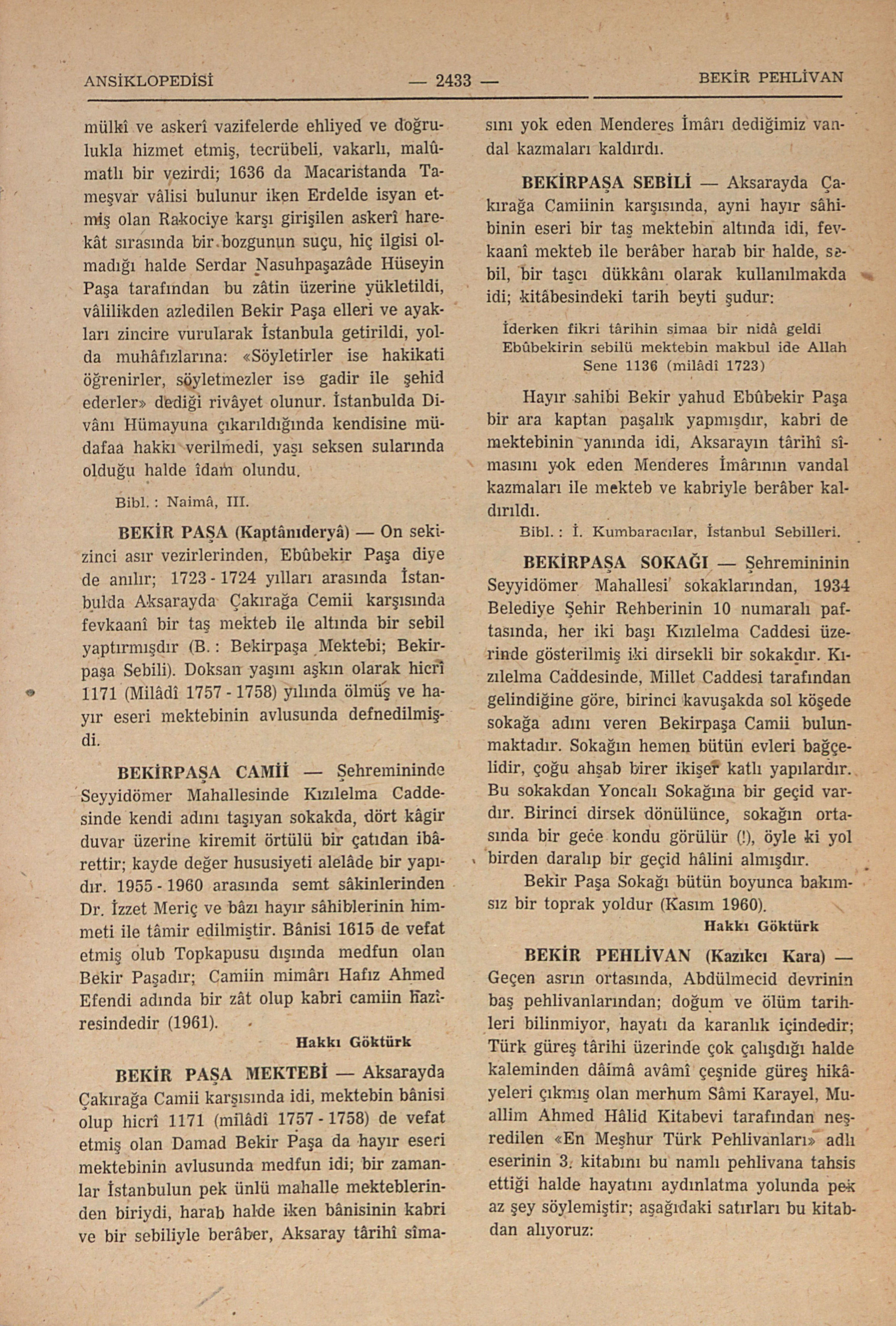 On yedinci asır vezirlerinden; İstanbulda Marmara yalısında Davudpaşa İskelesinde sur dışında Davudpaşa İskelesi Mescidinin bânisi (B. : Davudpaşa İskelesi Mescidi); Üçüncü Mehmed, Birinci Ahmed, Birinci Mustafa, İkinci Osman ve Dördüncü Murad zamanlarında mâlî, mülkî ve askerî vazifelerde ehliyed ve doğrulukla hizmet etmiş, tecrübeli, vakarlı, malûmatlı bir vezirdi; 1636 da Macaristanda Tameşvar vâlisi bulunur iken Erdelde isyan etmiş olan Rakociye karşı girişilen askerî harekât sırasında bir bozgunun suçu, hiç ilgisi olmadığı halde Serdar Nasuhpaşazâde Hüseyin Paşa tarafından bu zâtin üzerine yükletildi, vâlilikden azledilen Bekir Paşa elleri ve ayakları zincire vurularak İstanbula getirildi, yolda muhâfızlarına: “Söyletirler ise hakikati öğrenirler, söyletmezler ise gadir ile şehid ederler” dediği rivâyet olunur. İstanbulda Divânı Hümayuna çıkarıldığında kendisine müdafaa hakkı verilmedi, yaşı seksen sularında olduğu halde îdam olundu. Bibl. : Naimâ, III.