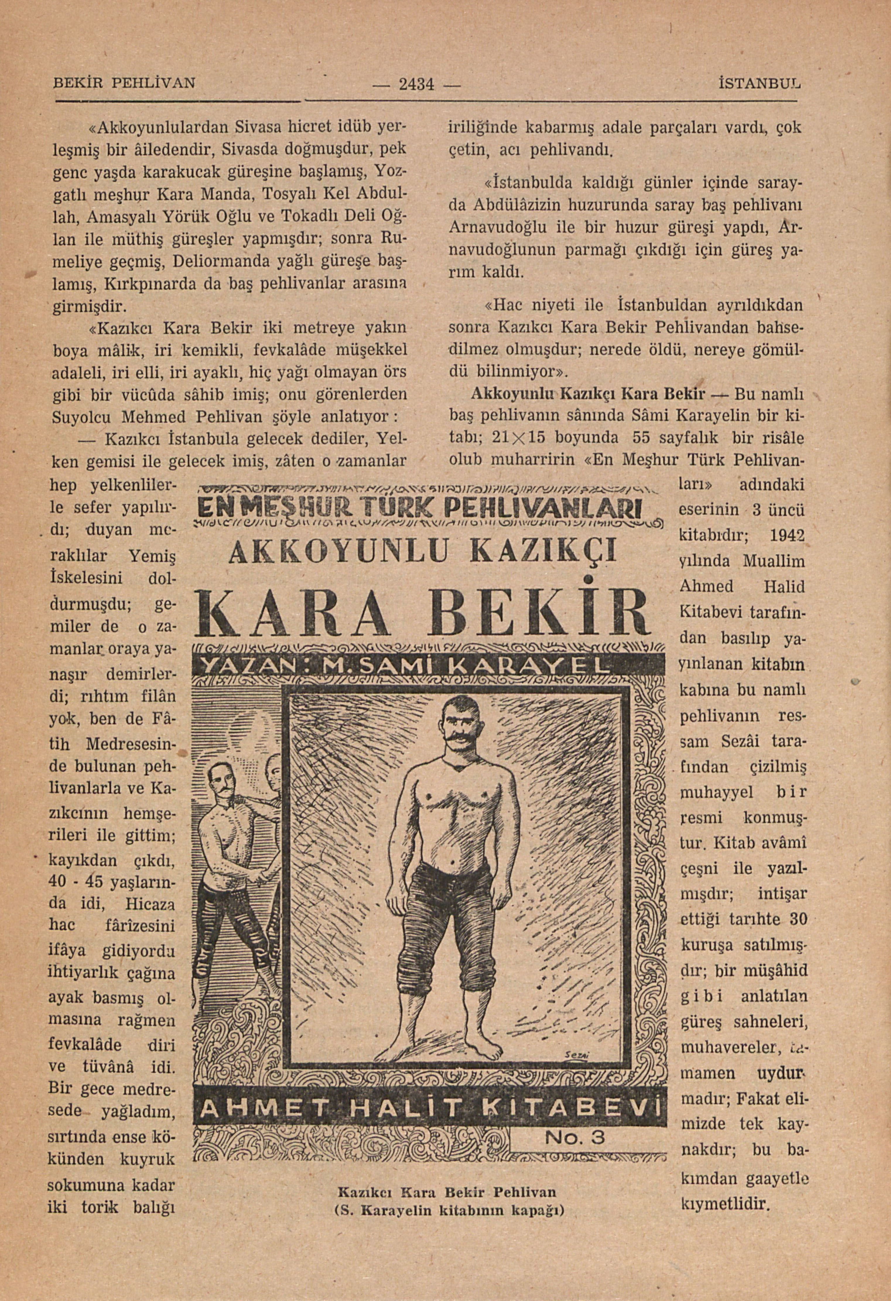 Akkoyunlu Kazıkçı Kara Bekir — Bu namlı baş pehlivanın sânında Sâmi Karayelin bir kitabı; 21 X 15 boyunda 55 sayfalık bir risâle olub muharririn “En Meşhur Türk Pehlivanları” adındaki eserinin 3 üncü kitabıdır; 1942 yılında Muallim Ahmed Halid Kitabevi tarafından basılıp yayınlanan kitabın kabına bu namlı pehlivanın ressam Sezâi tarafından çizilmiş muhayyel bir resmi konmuştur. Kitab avâmî çeşni ile yazılmışdır; intişar ettiği tarıhte 30 kuruşa satılmışdır; bir müşâhid gibi anlatılan güreş sahneleri, muhavereler, tamamen uydurmadır; Fakat elimizde tek kaynakdır, bu bakımdan gaayetle kıymetlidir.
