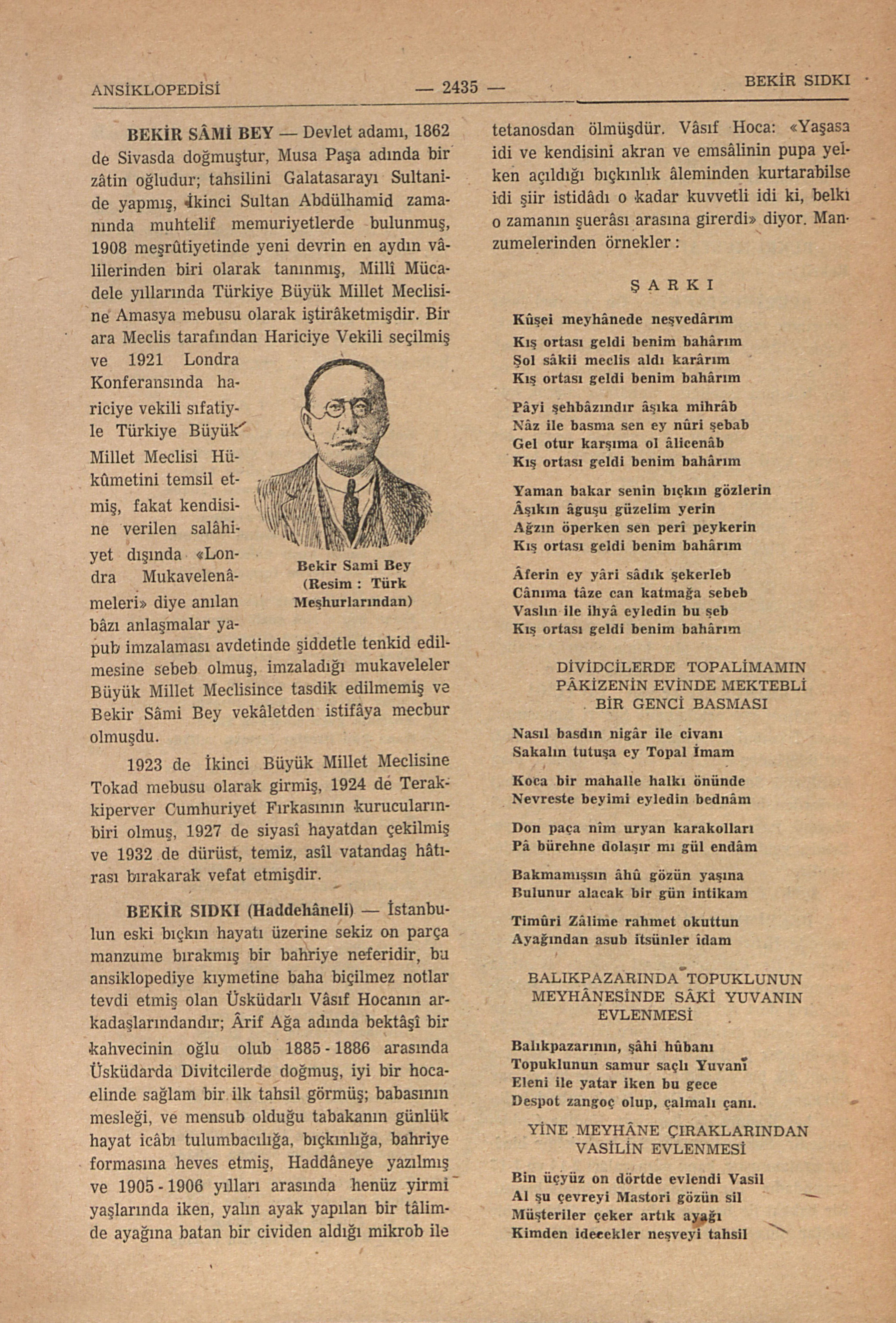 İstanbulun eski bıçkın hayatı üzerine sekiz on parça manzume bırakmış bir bahriye neferidir, bu ansiklopediye kıymetine baha biçilmez notlar tevdi etmiş olan Üsküdarlı Vâsıf Hocanın arkadaşlarındandır; Ârif Ağa adında bektâşî bir kahvecinin oğlu olub 1885 - 1886 arasında Üsküdarda Divitcilerde doğmuş, iyi bir hoca- elinde sağlam bir ilk tahsil görmüş; babasının mesleği, ve mensub olduğu tabakanın günlük hayat icâbı tulumbacılığa, bıçkınlığa, bahriye formasına heves etmiş, Haddâneye yazılmış ve 1905 - 1906 yılları arasında henüz yirmi yaşlarında iken, yalın ayak yapılan bir tâlimde ayağına batan bir cividen aldığı mikrob ile tetanosdan ölmüşdür. Vâsıf Hoca: “Yaşasa idi ve kendisini akran ve emsâlinin pupa yelken açıldığı bıçkınlık âleminden kurtarabilse idi şiir istidâdı o kadar kuvvetli idi ki, belki o zamanın şuerâsı arasına girerdi” diyor. Manzumelerinden örnekler : ŞARKI Kûşei meyhânede neşvedârım Kış ortası geldi benim bahârım Şol sâkii meclis aldı karârım Kış ortası geldi benim bahârım Pâyi şehbâzındır âşıka mihrâb Nâz ile basma sen ey nûri şebab Gel otur karşıma ol âlicenâb Kış ortası geldi benim bahârım Yaman bakar senin bıçkın gözlerin Âşıkın âguşu güzelim yerin Ağzın öperken sen perî peykerin Kış ortası geldi benim bahârım Âferin ey yârî sâdık şekerleb Cânıma tâze c...