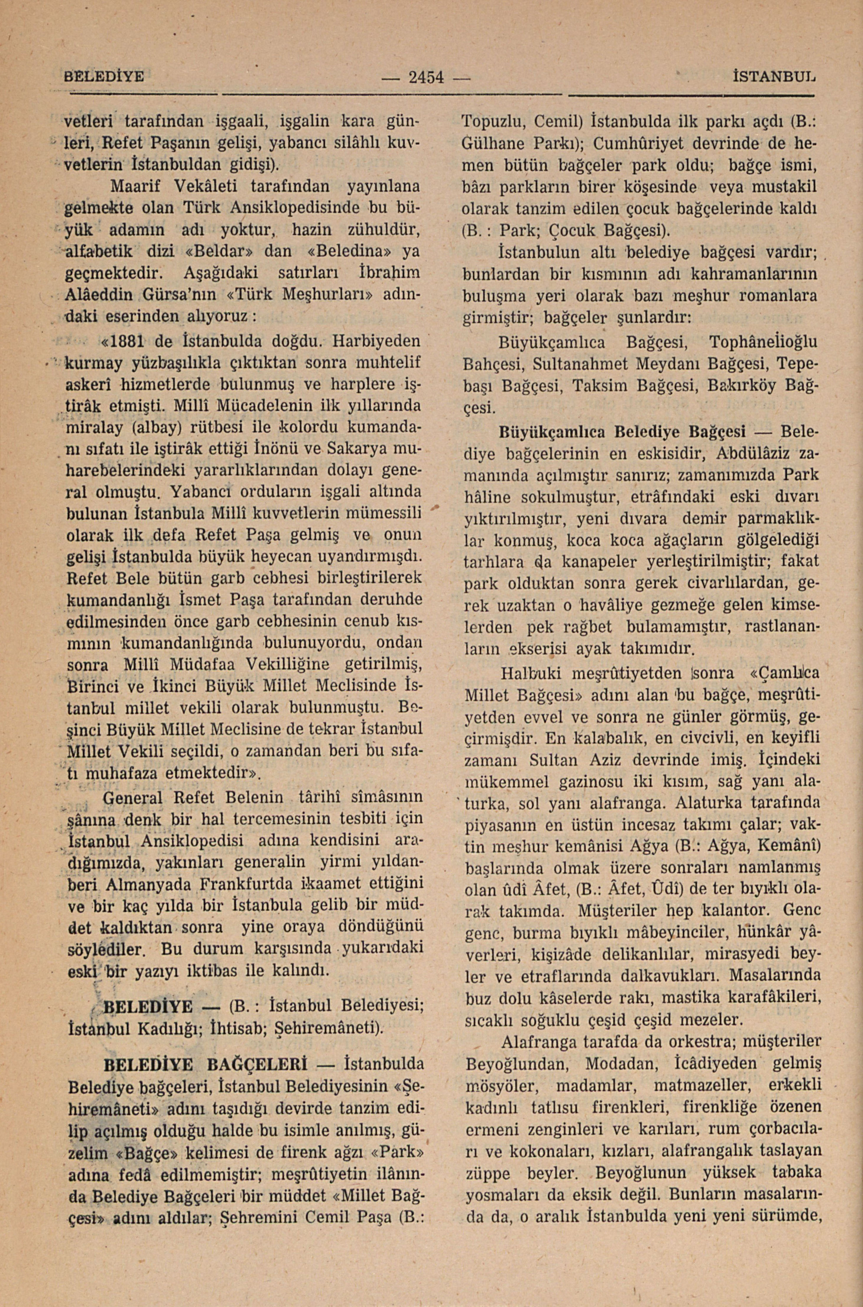 B.: Topuzlu, Cemil; B.: Gülhane Parkı; B.: Park; Çocuk Bağçesi; B.: Ağya, Kemânî; B.: Âfet, Ûdî; B.: Alman Çeşmesi; B.: Rıdvan Paşa; B. : Bakırköy