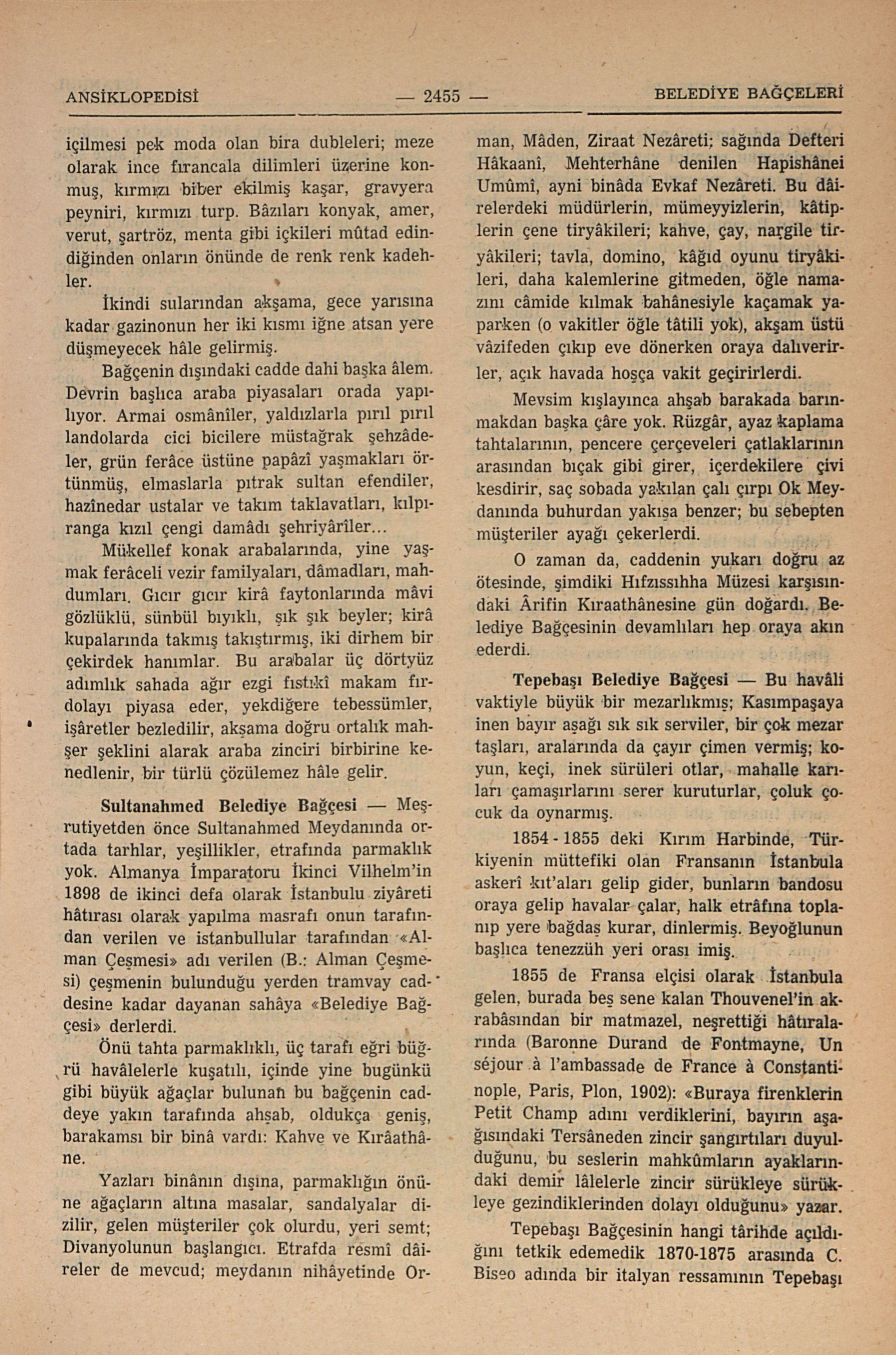 Sultanahmed Belediye Bağçesi — Meşrutiyetden önce Sultanahmed Meydanında ortada tarhlar, yeşillikler, etrafında parmaklık yok. Almanya İmparatoru İkinci Vilhelm’in 1898 de ikinci defa olarak İstanbulu ziyâreti hâtırası olarak yapılma masrafı onun tarafından verilen ve istanbullular tarafından “Alman Çeşmesi” adı verilen (B.: Alman Çeşmesi) çeşmenin bulunduğu yerden tramvay caddesine kadar dayanan sahâya “Belediye Bağçesi” derlerdi.