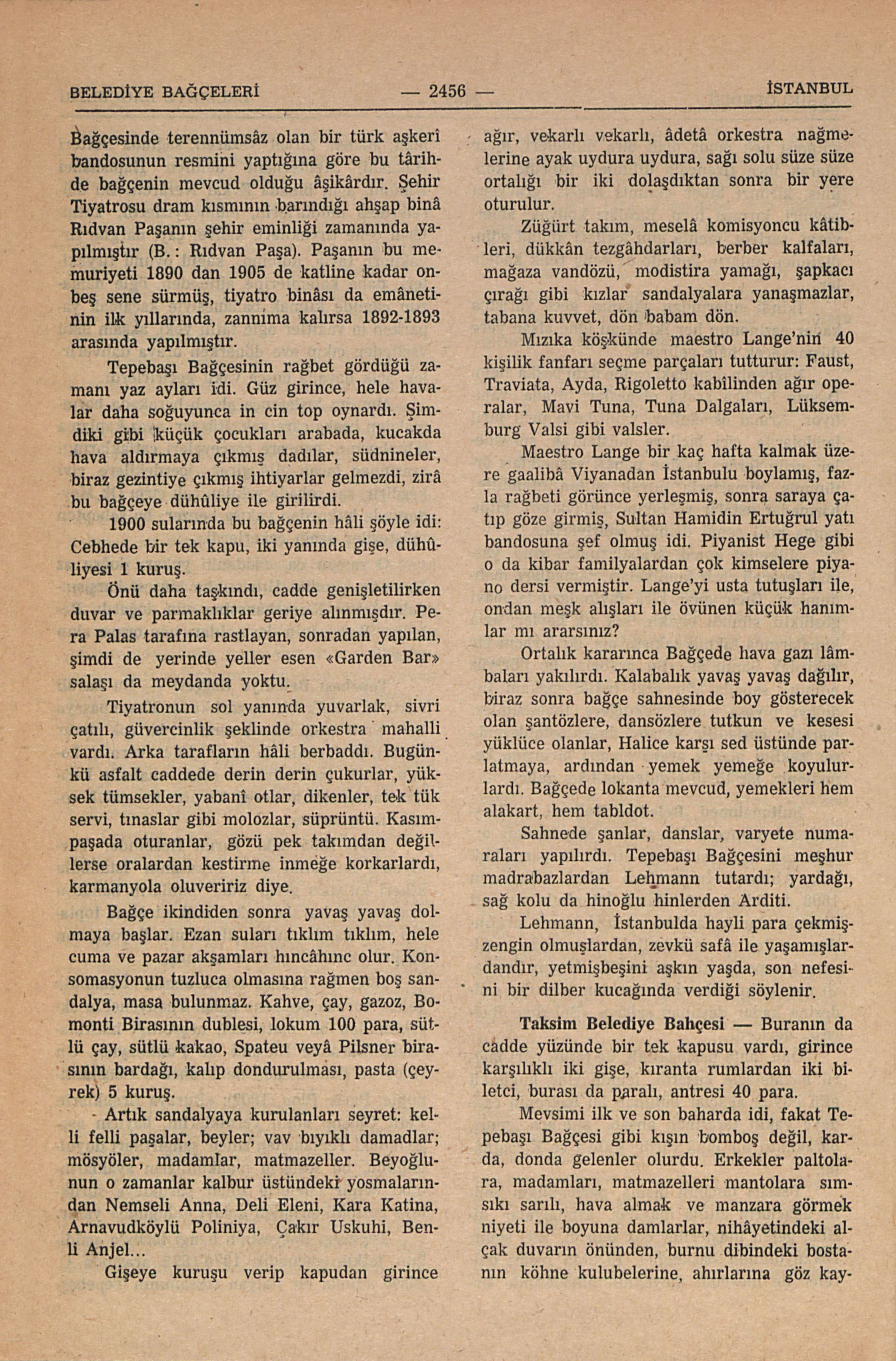 Mevsimindeki devamlılar öteki bağçeye gelenller nev’inden, Tenha zamanlarında çocuk dadıları, parasız ihtiyarlar yine görünmez. Cuma ve pazar akşamları iğne atsan yere düşmez. Burada da bir mızıka köşkü; on oniki kişilik orkestra eksik olmaz. Mızıka köşkünün berisinde, arka yüzü taraçalı, bir buçuk katlık ahşab bir gazino vardı. Akşamcılardan rütbeli ve mevkililer taraçanın kuytuca taraflarına çekilerek demlenirlerdi. Şehremini Rıdvan Paşa da ehlikeyflerden, kendine mahsus hücresinde bir iki tek atardı.