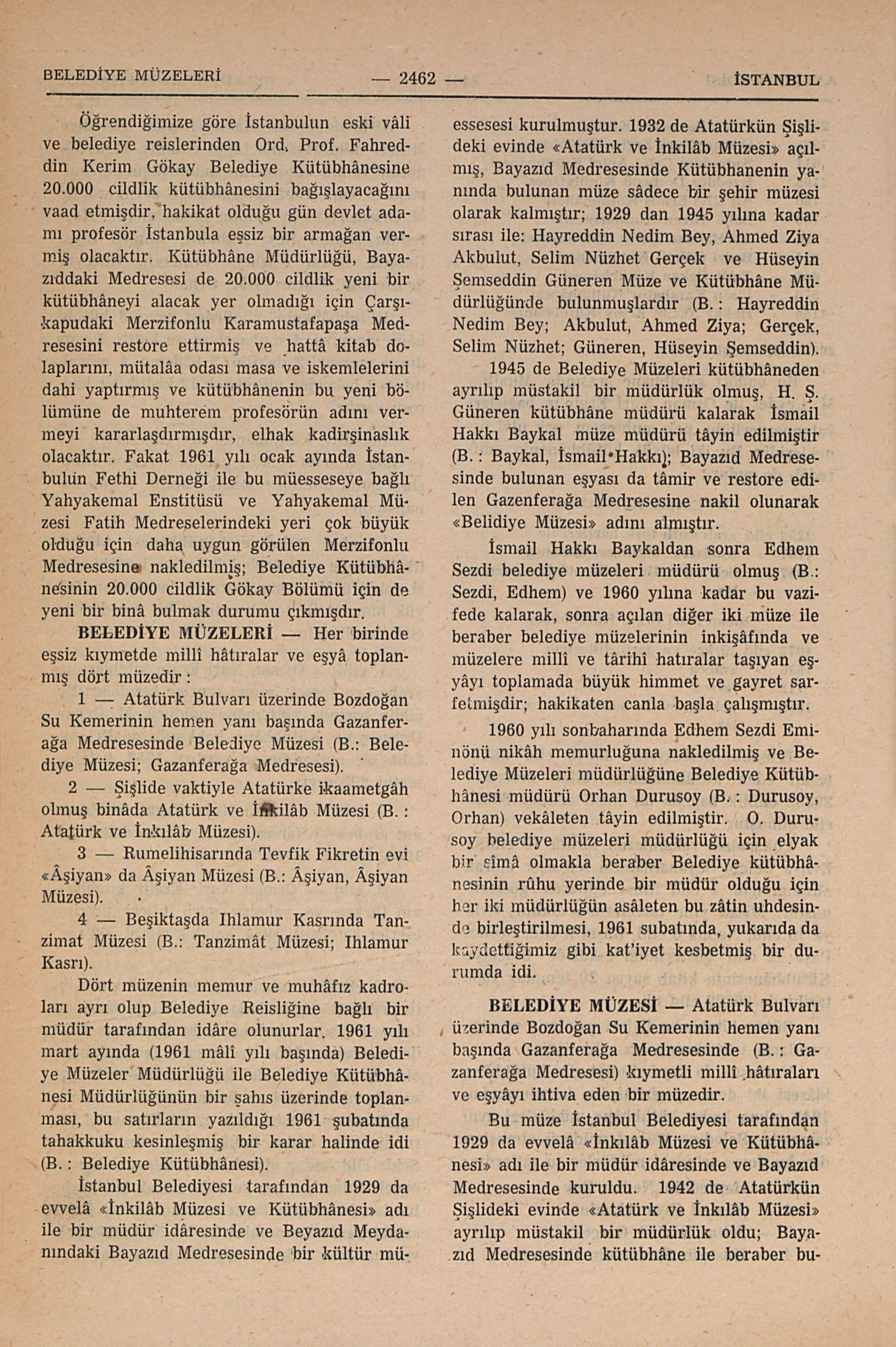 Atatürk Bulvarı üzerinde Bozdoğan Su Kemerinin hemen yanı başında Gazanferağa Medresesinde (B. : Gazanferağa Medresesi) kıymetli millî hâtıraları ve eşyâyı ihtiva eden bir müzedir. Bu müze İstanbul Belediyesi tarafından 1929 da evvelâ “İnkılâb Müzesi ve Kütübhânesi” adı ile bir müdür idâresinde ve Bayazıd Medresesinde kuruldu. 1942 de Atatürkün Şişlideki evinde “Atatürk ve İnkılâb Müzesi” ayrılıp müstakil bir müdürlük oldu; Bayazıd Medresesinde kütübhâne ile beraber bulunan müze sâdece bir şehir müzesi olarak kaldı; bu durum 1945 yılına kadar devam etti. 1945 de Belediye Müzesi kütübhâneden ayrılıp müstakil bir müdürlük olmuş, Bayazıd Medresesinde bulunan müze eşyası da tâmir ve restore edilen Gazenferağa Medresesine nakledilmişdir. İstanbul Belediyesi tarafından Âşiyan ve Tanzimat müzeleri açılarak Belediye Müzelerinin sayısı dörde çıkmış, fakat hepsi bir müdürün idaresine verilmiştir. Belediye Müzeleri müdürlük makamı Gazanferağa Medresesindeki Belediye Müzesindedir (B.: Belediye Müzeleri). Belediye Müzelerinin temelinin atıldığı 1929 yılından 1961 yılına kadar geçen 31 yıl içinde müze müdürlüğünde bulunmuş olan zevât şunlardır : 1 — Hayreddin Nedim Bey, müze ve kütübhâne müdürü 2 — Ahmed Ziya Akbulut, müze ve kütübhâne müdürü 3 — Selim Nüzhet Gerçek, müze ve kütübhâne müdürü ...