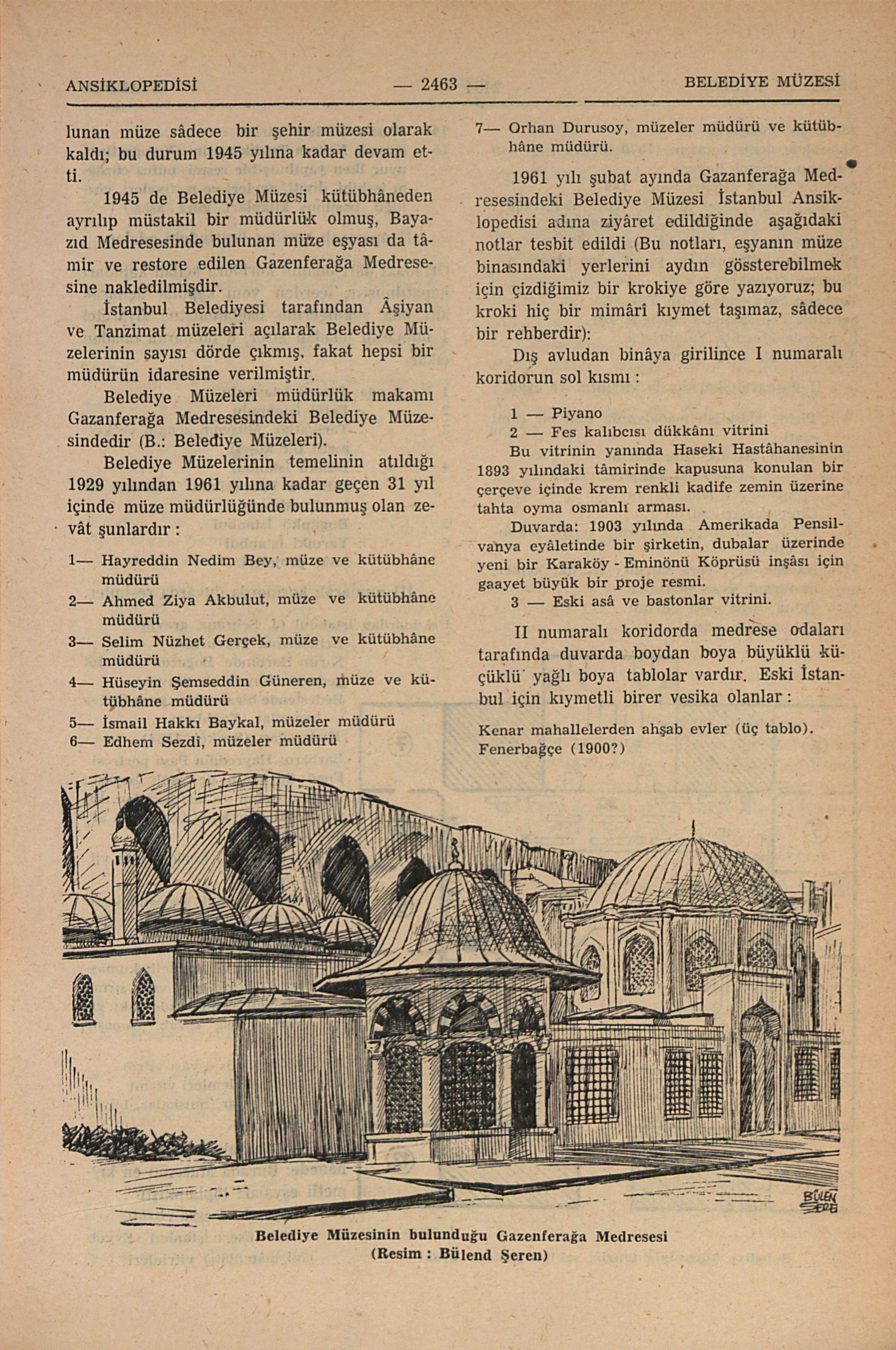 B. : Gazanferağa Medresesi; B.: Belediye Müzeleri
