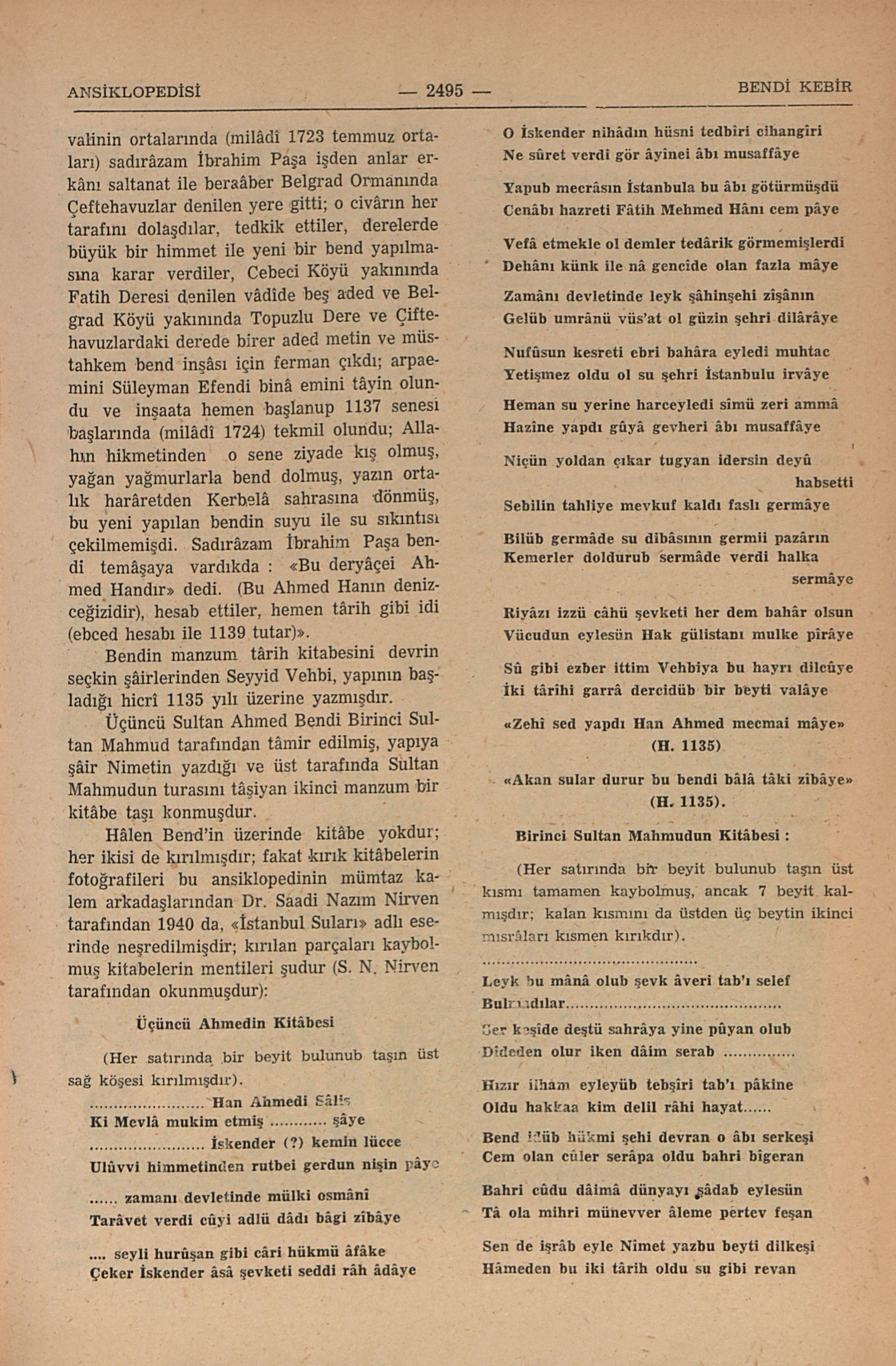 “Yeryünzünün eşsiz mâmur beldesi büyük ve kalabalık İstanbula Fâtih Sultan Mehmed ile Kanuni Sultan Süleyman su getirtmişlerdi. Şehrin nüfûsu mütemâdiyen artdığından su yetmez oldu, üstelik zaman ile de yer yer su kemerleri bozulmuş, su yolları bozulmuş, yazın İstanbulda suyun damlası yakut misâli kıymetlenmişti. Üçüncü Sultan Ahmed kemerlerin tâmiri ile ecdâdının eserlerini ihyayı ve yeni başdan su getirmeği ne zamandan beri düşünürdü; bu maksadla 1135 senesi şevvalinin ortalarında (milâdî 1723 temmuz ortaları) sadırâzam İbrahim Paşa işden anlar erkânı saltanat ile beraâber Belgrad Ormanında Çiftehavuzlar denilen yere gitti; o civârın her tarafını dolaşdılar, tedkik ettiler, derelerde büyük bir himmet ile yeni bir bend yapılmasına karar verdiler, Cebeci Köyü yakınında Fatih Deresi denilen vâdîde beş aded ve Belgrad Köyü yakınında Topuzlu Dere Çiftehavuzlardaki derede birer aded metin ve müstahkem bend inşâsı için ferman çıkdı; arpaemini Süleyman Efendi binâ emini tâyin olundu ve inşaata hemen başlanup 1137 senesi başlarında (milâdî 1724) tekmil olundu; Allahın hikmetin...