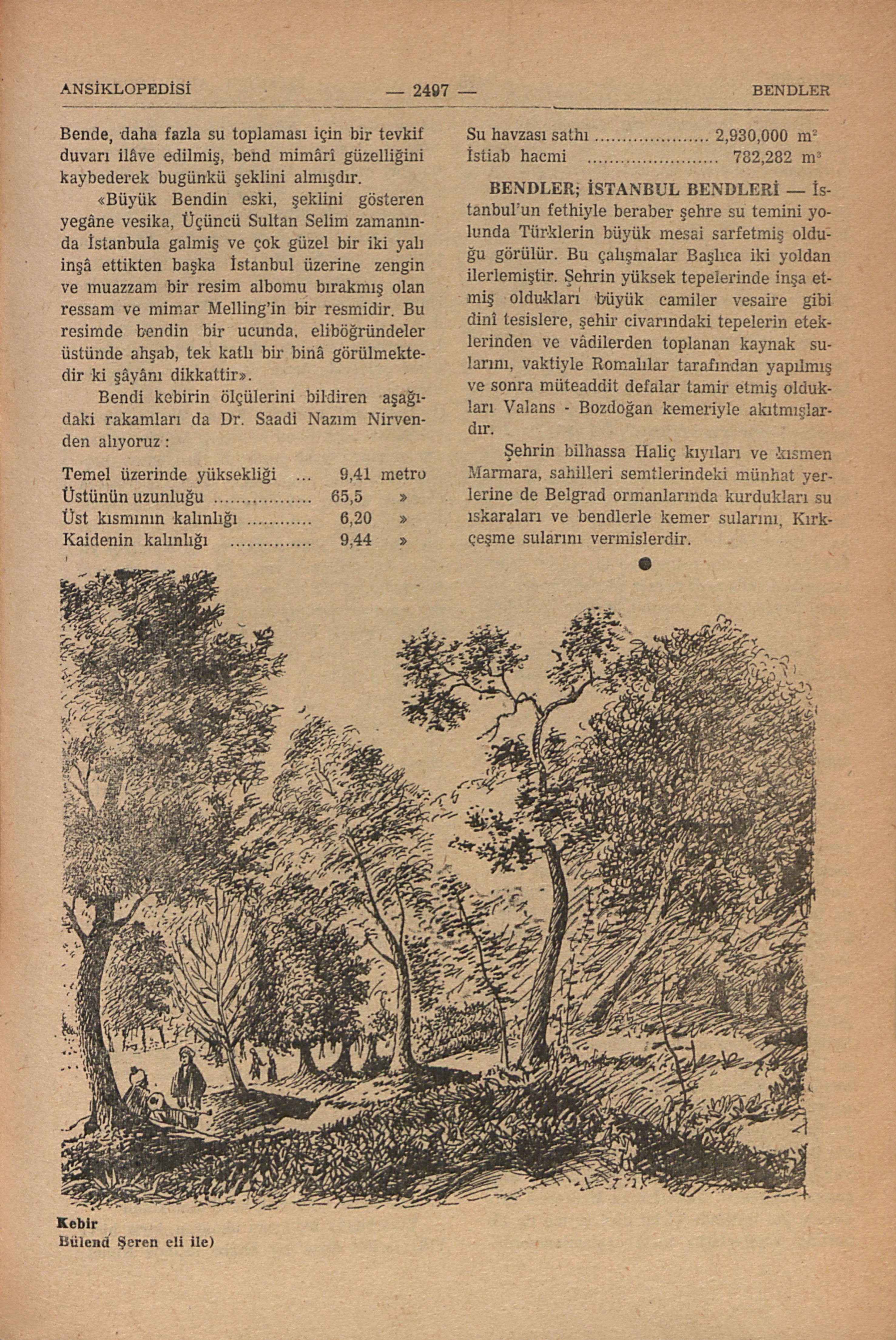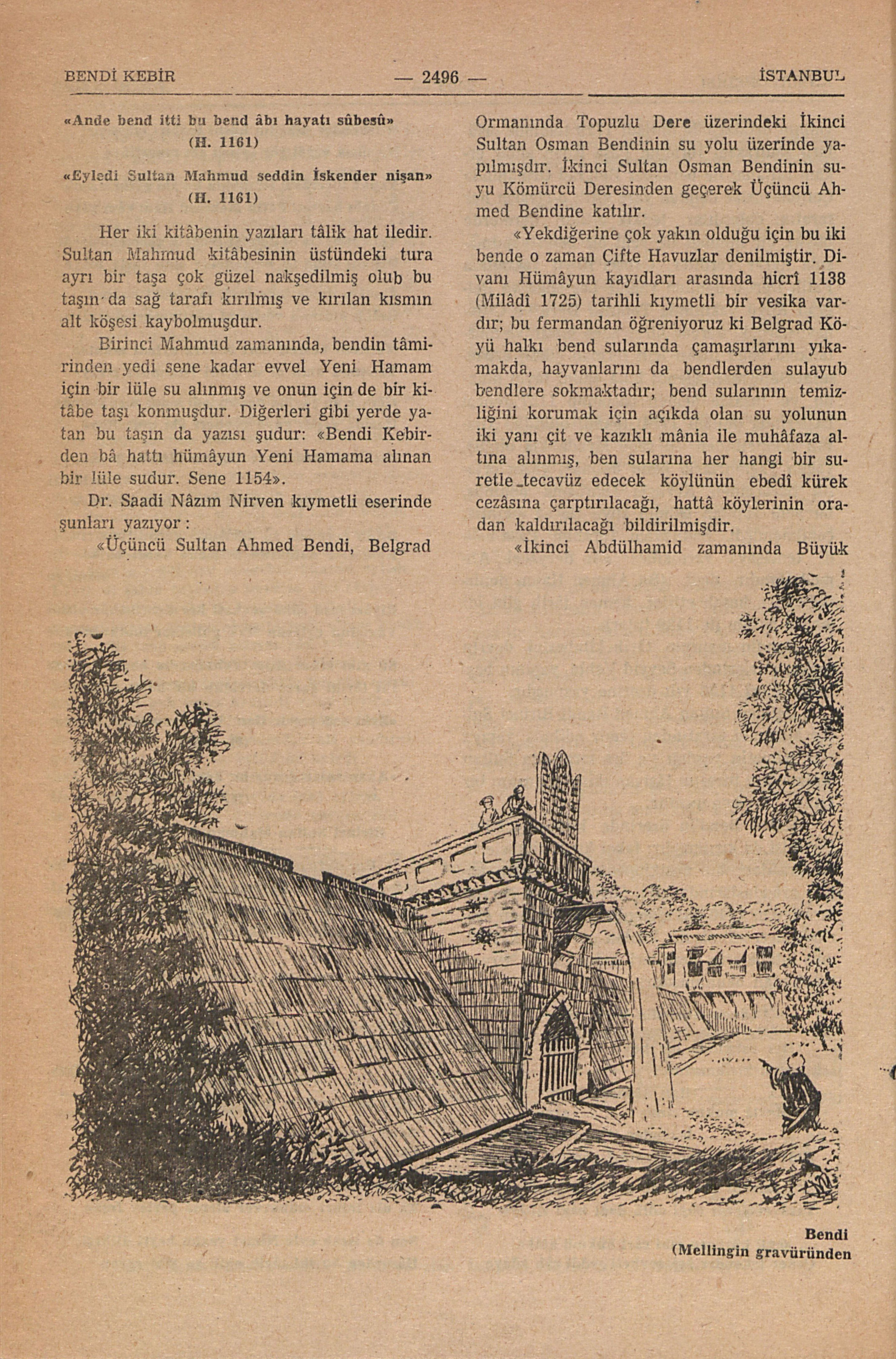 “Büyük Bendin eski, şeklini gösteren yegâne vesika, Üçüncü Sultan Selim zamanında İstanbula gelmiş ve çok güzel bir iki yalı inşâ ettikten başka İstanbul üzerine zengin ve muazzam bir resim albomu bırakmış olan ressam ve mimar Melling’in bir resmidir. Bu resimde bendin bir ucunda, eliböğründeler üstünde ahşab, tek katlı bir binâ görülmektedir ki şâyânı dikkattir”.