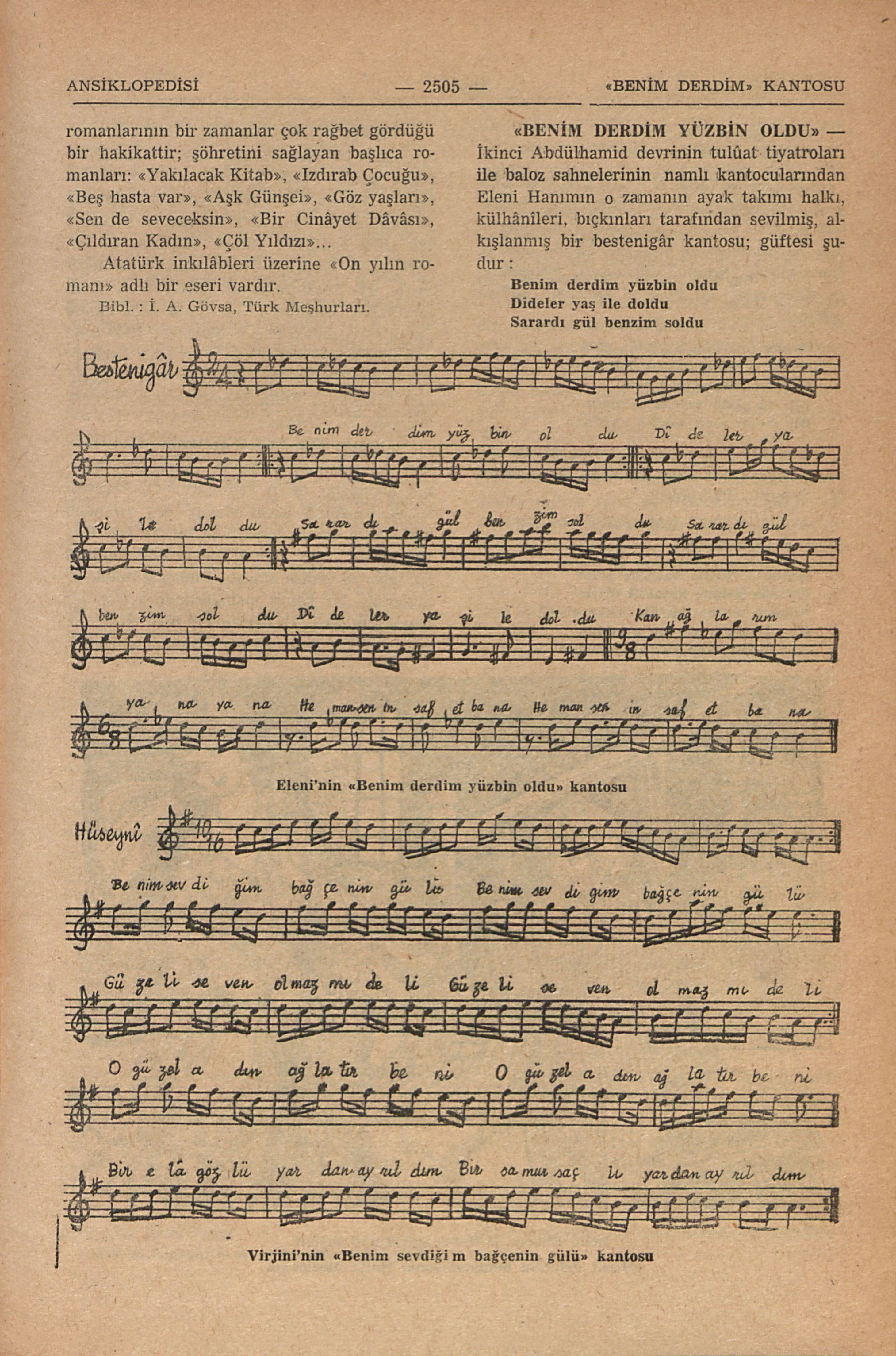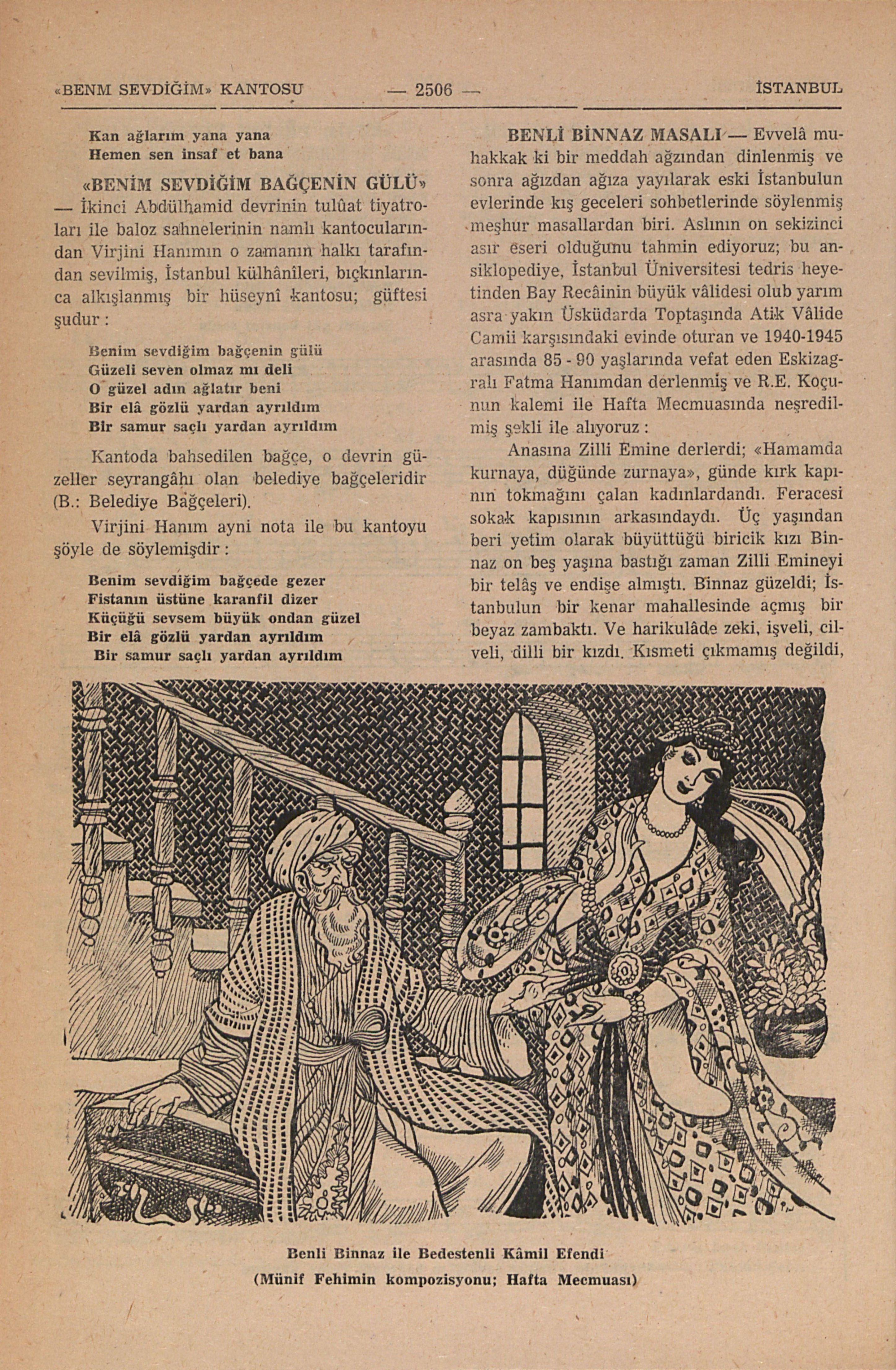 İkinci Abdülhamid devrinin tulûat tiyatroları ile baloz sahnelerinin namlı kantocularından Virjini Hanımıno zamanın halkı tarafından sevilmiş, İstanbul külhânileri, bıçkınlarınca alkışlanmış bir hüseyni kantosu; güftesi şudur: