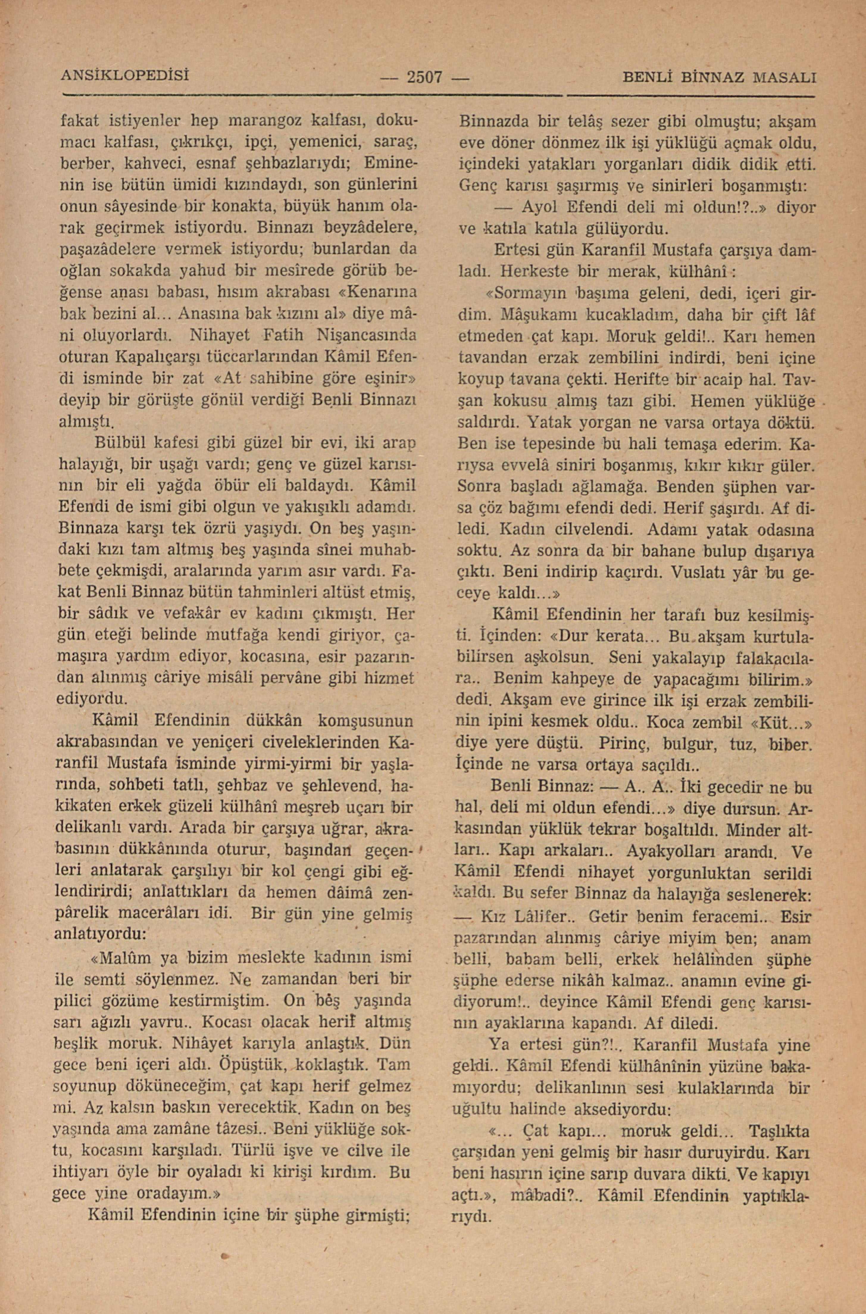 Evvelâ muhakkak ki bir meddah ağzından dinlenmiş ve sonra ağızdan ağızz yayılarak eski İstanbulun evlerinde kış geceleri sohbetlerinde söylenmiş meşhur masallardan biri. Aslının on sekizinci asır eseri olduğunu tahmin ediyoruz; bu ansiklopediye, İstanbul Üniversitesi tedris heyetinden Bay Recâinin büyük vâlidesi olub yarım asra yakın Üsküdarda Toptaşında Atik Vâlide Camii karşısındaki evinde oturan ve 1940-1945 arasında 85 - 90 yaşlarında vefat eden Eskizağralı Fatma Hanımdan derlenmiş ve R.E. Koçunun kalemi ile Hafta Mecmuasında neşredilmiş şekli ile alıyoruz: Anasına Zilli Emine derlerdi; “Hamamda kurnaya, düğünde zurnaya” günde, kırk kapının tokmağını çalan kadınlardandı. Feracesi sokak kapısının arkasındaydı. Üç yaşından beri yetim olarak büyüttüğü biricik kızı Binnaz on beş yaşına bastığı zaman Zilli Emineyi bir telâş ve endişe almışdı. Binnaz güzeldi; İstanbulun bir kenar mahallesinde açmış bir beyaz zambaktı. Ve harikulade zeki, işveli, cilveli, dilli bir kızdı. Kısmeti çıkmamış değildi, fakat istiyenler hep marangoz kalfası, dokumacı kalfası, çakrıkçı, ipçi, yemenici, saraç, berber, kahveci, esnaf şehbazlarıydı; Eminenin ise bütün ümidi kızındaydı, son günlerini onun sâyesinde bir konakta, büyük hanım olarak geçirmek istiyordu. Binnazı beyzâdelere, paşazâdelere vermek istiyordu; bunlardan da oğlan sokakda yahud bir mesirede görüb beğense anası babası, hısım akrabası “Kenarına bak bezini al... Nihayet Fatih Nişancasında oturan Kapalıçarşı tüccarlarından Kâmil Efendi isminde bir zat “At sahibine göre eşinir” deyip bir görüşte gönül verdiği Benli Binnazı almıştı. Bülbül kafesi gibi güzel bir evi, iki arap halayığı, bir uşağı vardı; genç ve güzel karısının bir eli yağda öbür eli baldaydı. Kâmil Efendi de ismi gibi olgun ve yakışıklı adamdı. Binnaza karşı tek özrü yaşıydı. On beş başındaki kızı tam almış beş yaşında sinei muhabbete çekmişdi, aralarında yarım asır vardı. Fakat Benli Binnaz bütün tahminleri altüst etmiş, bir sâdık ve vefakâr ev kadını çıkmıştı. Her gün eteği belinde mutfağa kendi giriyor, çamaşıra yardım ediyor, kocasına, esir pazarından alınmış câriye misâli pervâne gibi hizmet ediyordu. Kâmil Efendinin dükkân komşusunun akrabasından ve yeniçeri civeleklerinden Karanfil Mustafa isminde yirmi-yirmi bir yaşlarında, sohbeti tatlı, şehbaz ve şehlevend, hakikaten erkek güzeli kalhâni meşreb uçarı bir delikanlı vardı. Arada bir çarşıya uğrar, akrabasının dükkânında oturur, başından geçenleri anlatarak çarşılıyı bir kol çengi gibi eğlendirirdi; anlattıkları da hemen dâimâ zenpârelik macerârı idi. Bir gün yine gelmiş anlatıyordu. “Malûm ya bizim meslekte kadının ismi ile semti söylenmez. Ne zamandan beri bir pilici gözüne kestirmiştim. On beş yaşında sarı ağızlı yavru.. Kocası olacak herif altmış beşlik moruk. Nihâyet karıyla anlaştık. Dün gece beni içeri aldı. Öpüştük, koklaştık. Tam soyunup döküneceğim, çat kapı herif gelmez mi. Az kalsın baskın verecektik. Kadın on beş yaşında ama zamâne tâzesi.. Beni yüklüğe soktu, kocasını karşıladı. Türlü işve ve cilve ile ihtiyarı öyle bir oyaladı ki kirişi kırdım. Bu gece yine oradayım.” Kâmil Efendinin içime bir şüphe girmişti; Binnazda bir telâş sezer gibi olmuştu; akşam eve öner dönmez ilk işi yüklüğü açmak oldu, içindeki yatakları yorganları didik didik etti.. Genç karısı şaşırmış ve sinileri boşanmıştı: — Ayol Efendi deli mi oldun?.” diyor ve katıla katıla gülüyordu. Ertesi gün Karanfil Mustafa çarşıya damladı. Herkeste bir merak, külhâni: “Sormayın başıma geleni, dedi, içeri girdim. Mâşukamı kucakladım, daha bir çift lâf etmeden çat kapı. Moruk geldi!.. Karı hemen tavandan erzak zembilini indirdi, beni içine koyup tavana çekti. Herifte bir acaip hal.. Tavşan kokusu almış tazı gibi. Hemen yüklüğe saldırdı. Yatak yorgan ne varsa ortaya döktü. Ben ise tepesinde bu hali temaşa ederim. Karıysa evvelâ siniri boşanmış; kıkır kıkır güler. Sonra başladı ağlamağa. Benden şüphen varsa çöz bağımı efendi dedi. Herif şaşırdı. Af diledi. Kadın cilvelendi. Adamı yatak odasına soktu. Az sonra da bir bahane bulup dışarıya çıktı. Beni indirip kaçırdı. Vuslatı yâr bu geceye kaldı...” Kâmil Efendinin her tarafı buz kesilmişti. İçinden: “Dur kerata... Bu akşam kurtulabilirsen aşkolsun. Seni yakalayıp falakacılara.. Benim kahpeye de yapacağımı bilirim.” dedi. Akşam eve girince ilk işi erzak zembilin ipini kesmek oldu. Koca zembil “Küt...” diye yere düştü. Pirinç, bulgur, tuz, biber. İçinde ne varsa ortaya saçıldı. Benli Binnaz: — A.. A.. İki gecedir ne bu hal, deli mi oldun efendi...” diye dursun. Arkasından yüklük tekrar boşaltıldı. Minder altları... Kapı arkaları... Ayakyolları arandı. Ve Kâmil Efendi nihayet yorgunluktan serildi kaldı. Bu sefer Binnaz da halayığına seslenerek: — Kız Lâlifer..Getir benim feracemi... Esir pazarından alınmış câriye miyim ben; anam belli, babam belli, erkek helâlimden şüphe şüphe ederse nikâh kalmaz... anamın evine gidiyorum!.. deyince Kâmil Efendi genç karısının ayaklarına kapandı. Af diledi. Ya ertesi gün?!. Karanfil Mustafa yine geldi.. Kâmil Efendi külhâninin yüzüne bakamıyordu; delikanlının sesi kulaklarında bir uğultu halinde aksediyordu. “... Çat kapı.. moruk geldi... Taşlıkda çarşıdan yeni gelmiş bir hasır duruyordu. Karı beni hasırın içine sarıp duvara dikti. Ve kapıyı açtı.” mâbadi?.. Kâmil Efendinin yaptıklarıydı. Vuslatı yar yine ertesi akşama kalmıştı. Karanfil Mustafa Kapalıçarşıda akrabasının dükkânı girmi