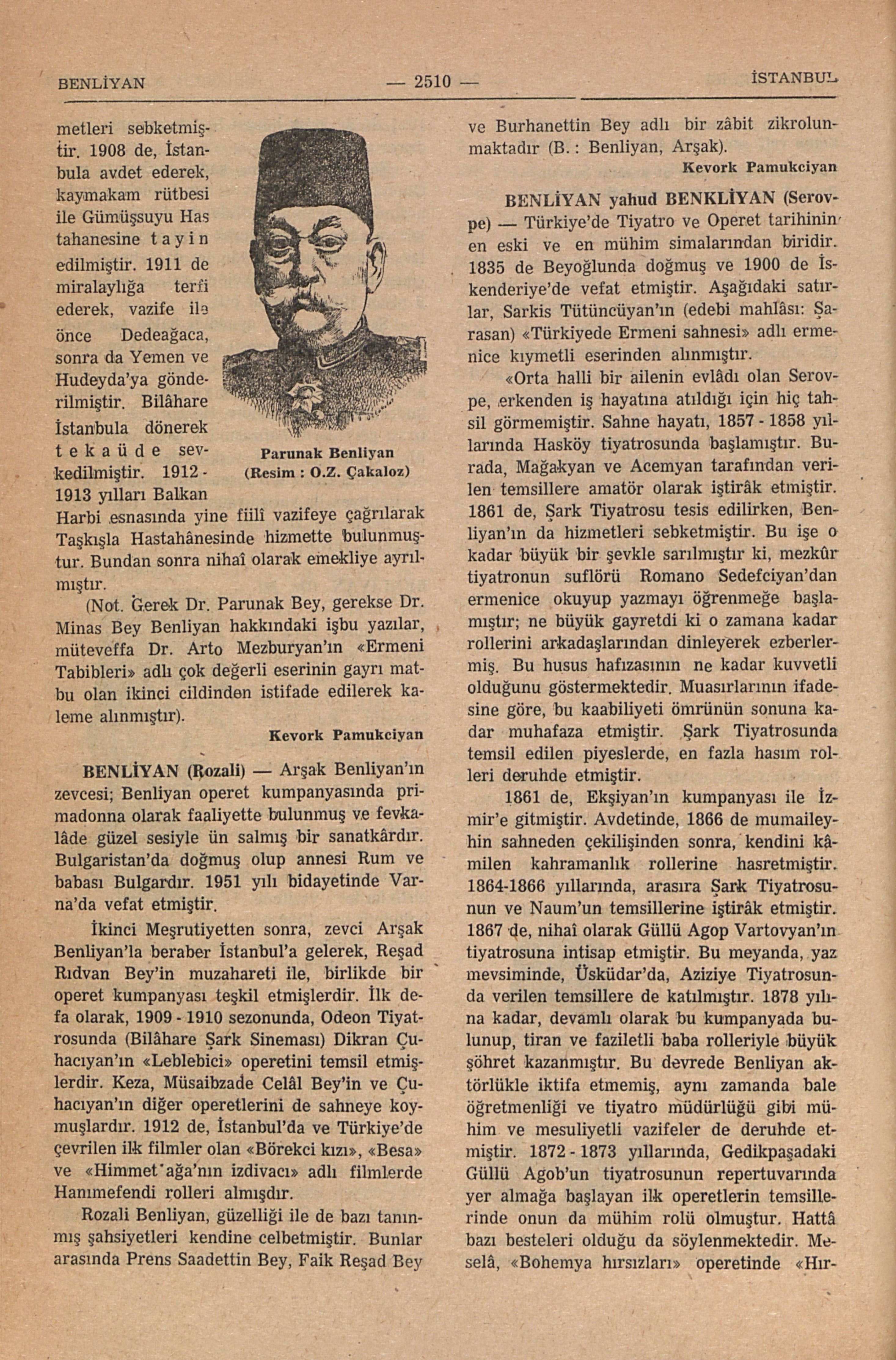 Dr. Minas Benliyan’ın amcazadesidir. 1846 da Edirne’de doğup, 16 nisan 1918 de İstanbulda vefat etmiştir. Şişli Ermeni Mezarlığında medfundur. Dr. Panunak Bey, 15 haziran 1874 de, “Parunak Ohannes Efendi” kaydiyle Askeri Tıbbiyeden mezun olmuştur. Önce, 1877 - 1878 yılları Türk- Rus Harbine iştirâk etmiştir. Müteakiben, askeri vazife ile bir sene Arnavutluk’da ve bir sene de Edirne’de bulunmuştur. Binbaşı rütbesiyle dört sene Bağdat ve Basra’da Kürd İsmail Paşanın ordusunda hizmetleri sebketmiştir. 1908 de, İstanbula avdet ederek, kaymakam rütbesi ile Gümüşsuyu Hastahanesine tayin edilmiştir. 1911 de miralaylığıa terfi ederek, vazife ile önce Dedeağaca, sonra da Yemen ve Hudeyda’ya gönderilmiştir. Bilâhene İstanbula dönerek tekaüde sevkedilmiştir. 1912 - 1913 yılları Balkan Harbi esnasında yine fiiili vazifeye çağrılarak Taşkışla Hastahânesinde hizmette bulunmuştur. Bundan sonra nihai olarak emekliye ayrılmıştır. (Not. Gerek Dr. Parunak Bey, gerekse Dr. Minas Bey Benliyan hakkındaki işbu yazılar, müteveffa Dr. Arto Mezburyan’ın “Ermeni Tabibleri” adlı çok değerli eserinin gayri matbu olan ikinci cildinden istifade edilerek kaleme alınmıştır). Kevork Pamukciyan Parunak Benliyan (Resim: O.Z.Çakaloz