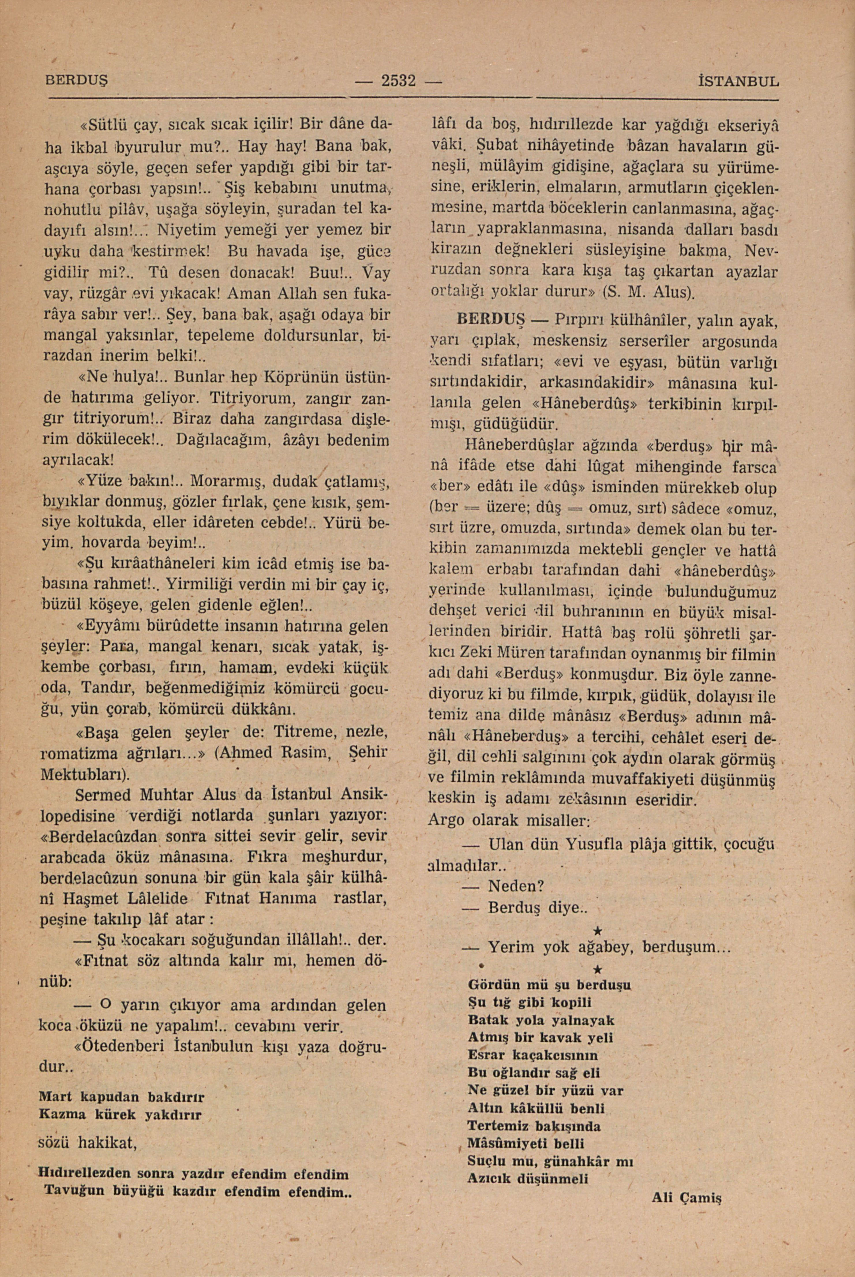 İstanbulun büyük evlâdı Ahmed Rasim, İkinci Abdülhamidin son devirlerinde “Malûmât” mecmuasına yazdığı “Şehir Mektubları”nın birinde Berdelacûz günlerini, bir İstanbulunun o devirde, o günlerdeki hayatını ve duygusunu erişilmez kudretle tasvir etmektedir: