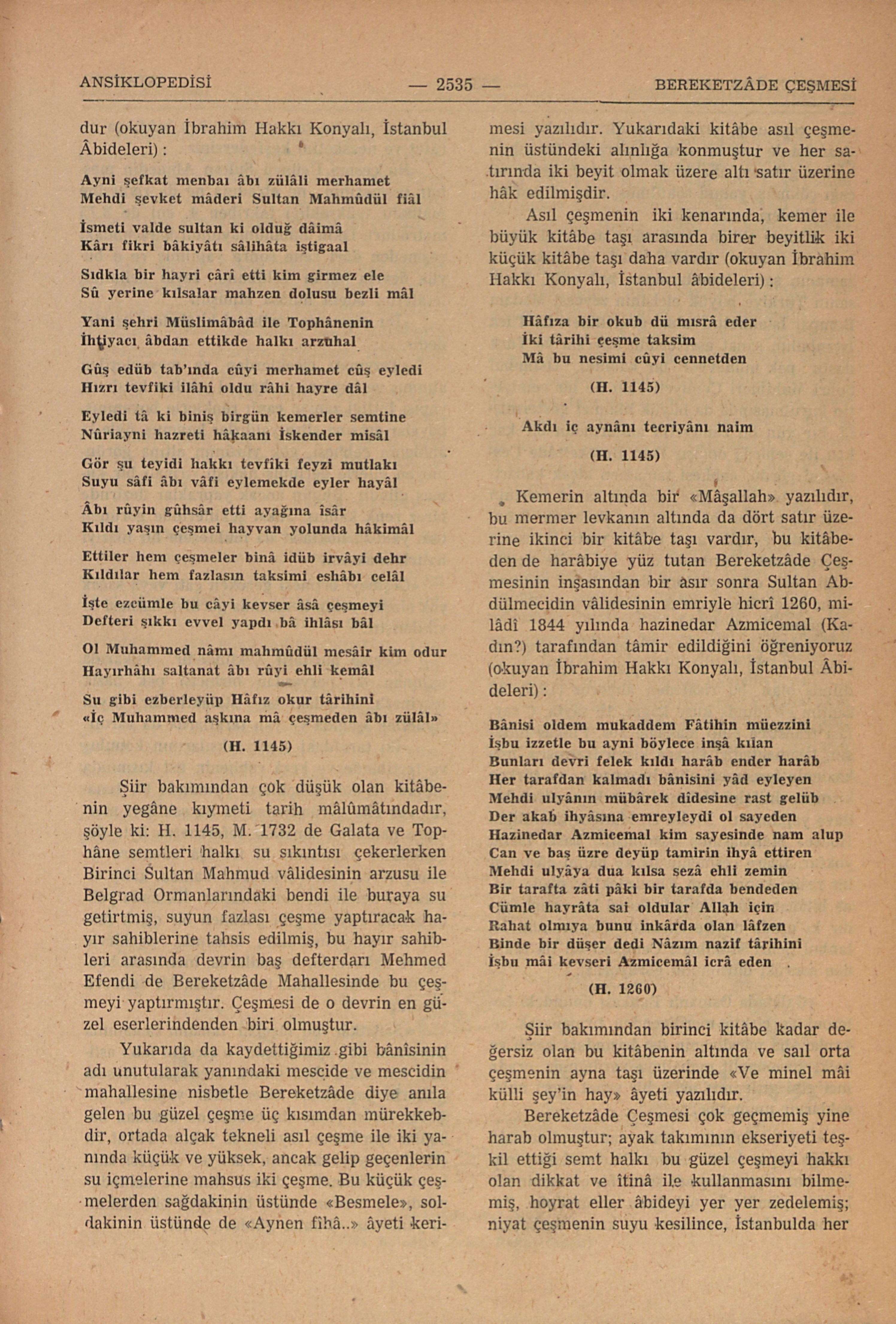 Yukarıda da kaydettiğimiz gibi bânisinin adı unutularak yanındaki mescide ve mescidin mahallesine nisbetle Bereketzâde diye anıla gelen bu güzel çeşmi üç kısımdan mürekkebdir, ortada alçak tekneli asıl çeşmi ile iki yanında küçük ve yüksek, ancak gelip geçenlerin su içmelerine mahsus iki çeşme. Bu küçük çeşmelerden sağdakinin üstende “Besmele” soldakinin üstünde de “Aynen fihâ...” âyeti kerimesi yazılıdır. Yukarıdaki kitâbe asıl çeşmenin üstündeki alınlığa konmuştur ve her satırında iki beyit olmak üzere altı satır üzerine hâk edilmişdir.