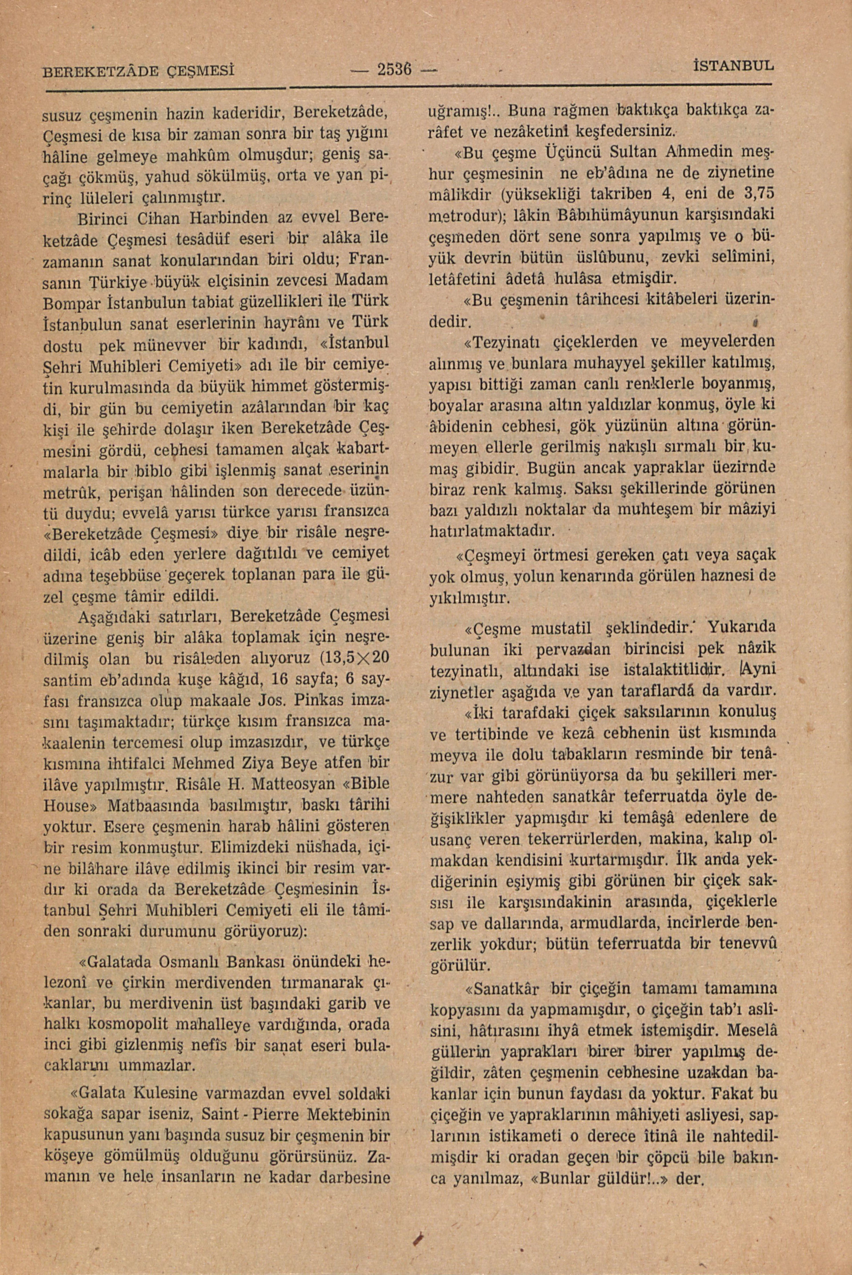 Aşağıdaki satırları, Bereketzâde Çeşmesi üzerine geniş bir alâka toplamak için neşredilmiş olan bu risâleden alıyoruz (13,5X20 santim eb’adında kuşe kâğıd, 16 sayfa; 6 sayfası fransızca olup makale Jos. Pinkas imzasını taşımaktadır; türkçe kısım fransızca makaalenin tercemesi olup imzasızdır, ve türkçe kısmına ihtifalci Mehmed Ziya Beye atfen bir ilâve yapılmıştır. Risâle H. Matteosyan “Bible House” Matbaasında basılmıştır, baskı târihi yoktur. Esere çeşmenin harab hâlini gösteren bir resim konmuştur. Elimizdeki nüshâda, içine bilâhare ilâve edilmiş ikinci bir resim vardır ki orada da Bereketzâde Çeşmesinin İstanbul Şehri Muhibleri Cemiyeti eli ile tâmirden sonraki durumunu görüyoruz: