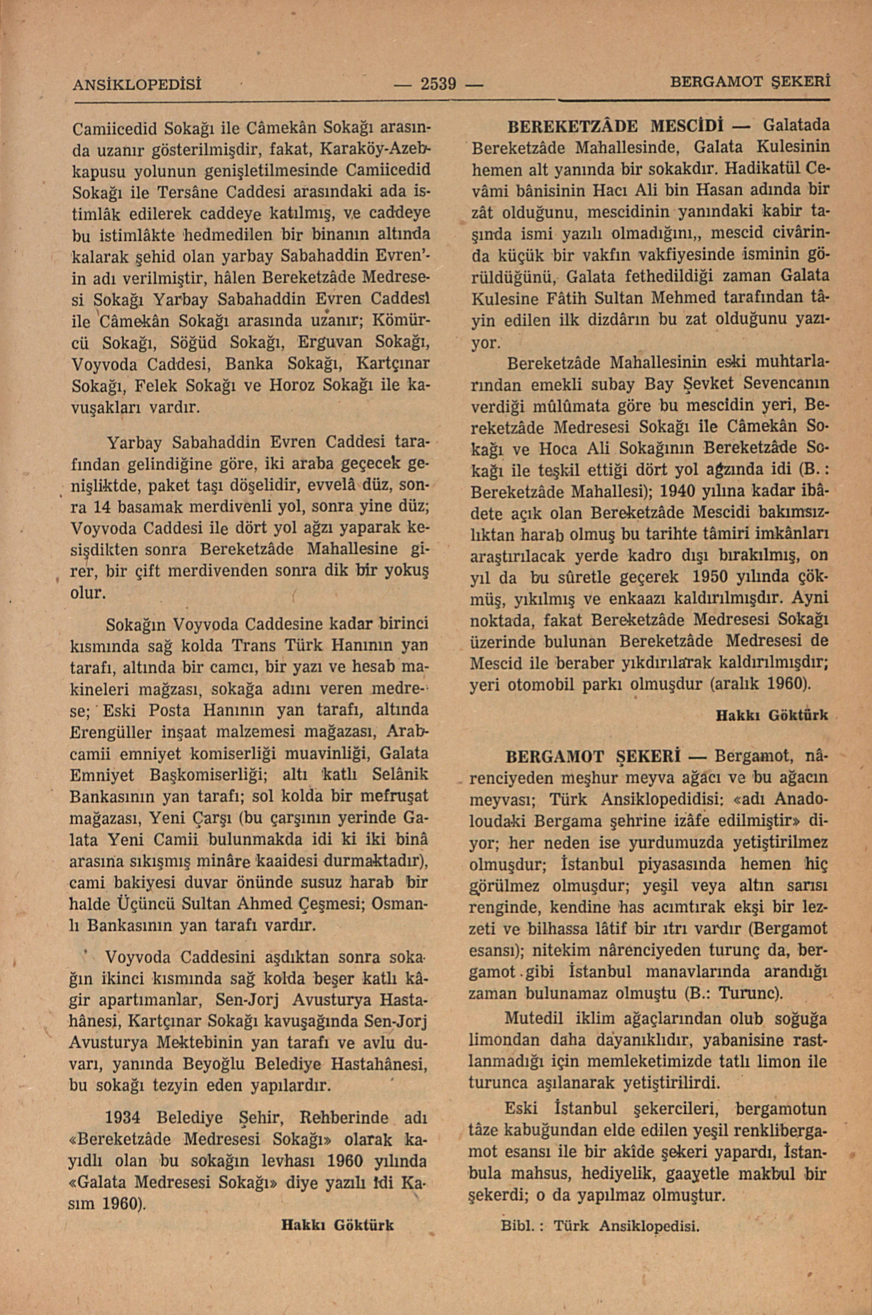 1934 Belediye Şehir, Rehberinde adı “Bereketzâde Medresesi Sokağı” olarak kayıdlı olan bu sokağın levhası 1960 yılında “Galata Medresesi Sokağı” diye azılı idi. (Kasım 1960).