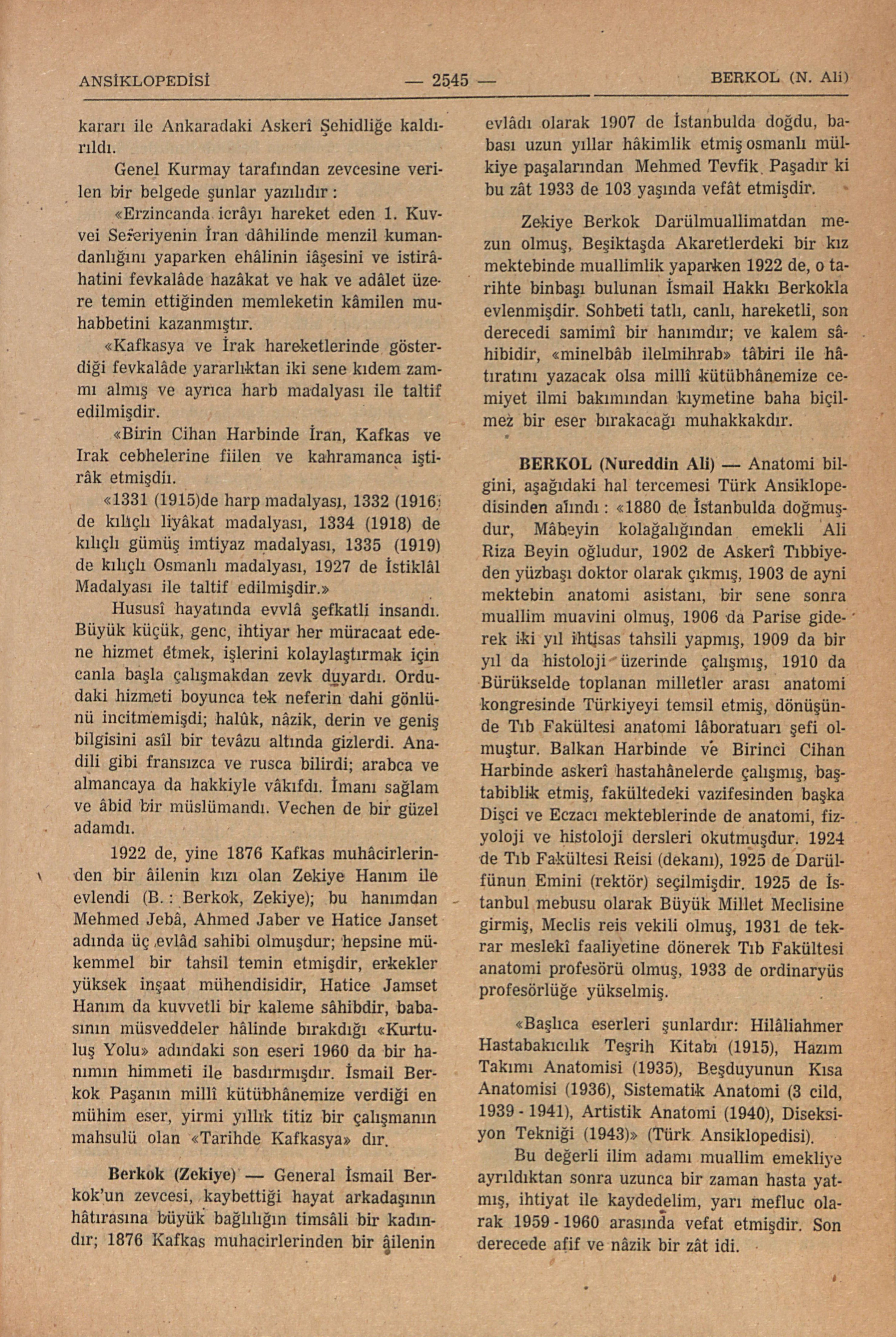 General İsmail Berkok’un zevcesi, kaybettiği hayat arkadaşının hâtırasına büyük bağlılığın timsâli bir kadındır; 1876 Kafkas muhacirlerinden bir âilenin evlâdı olarak 1907 de İstanbulda doğdu, babası uzun yıllar hâkimlik etmiş osmanlı mülkiye paşalarından Mehmed Tevfik Paşadır ki bu zât 1933 de 103 yaşında vefât etmişdir.